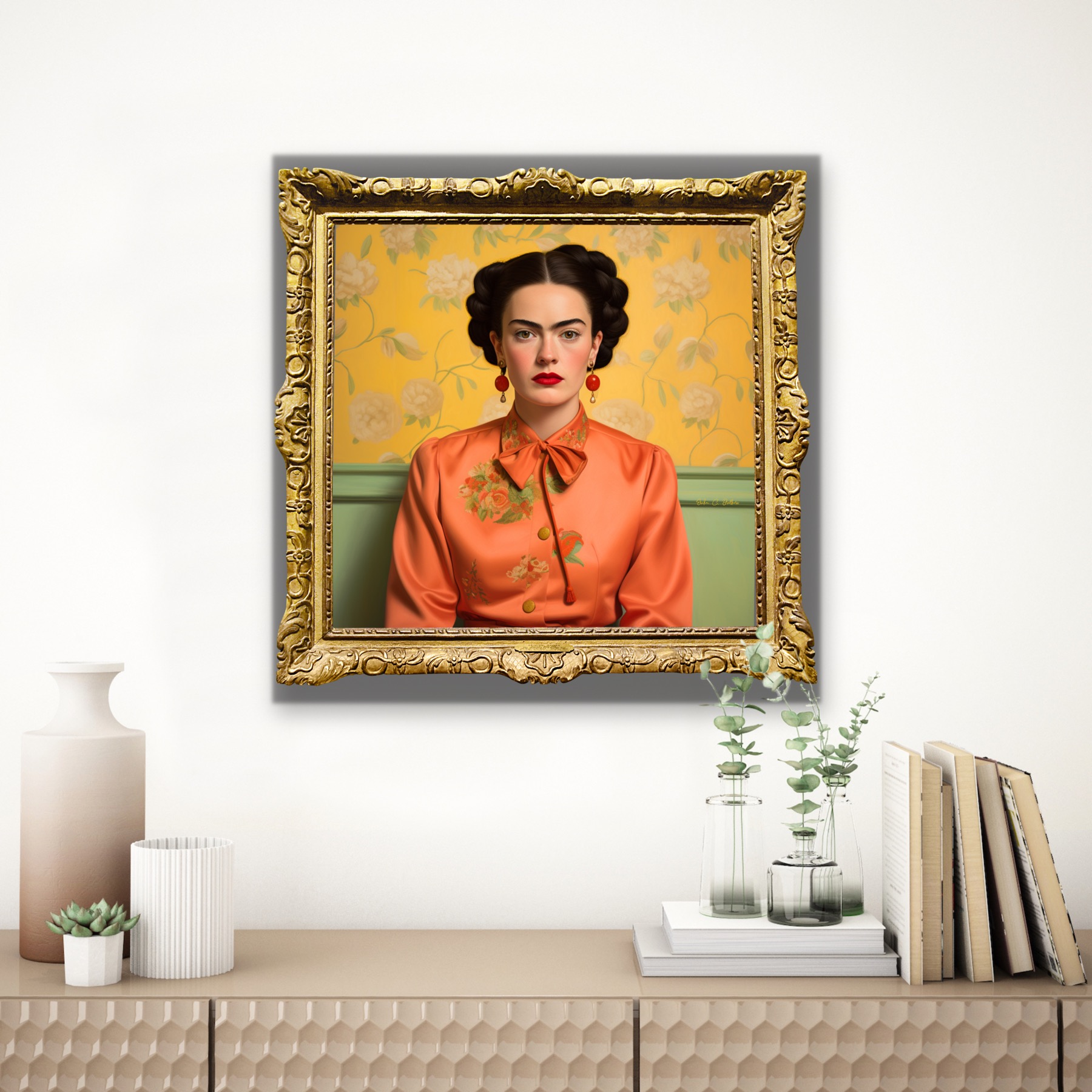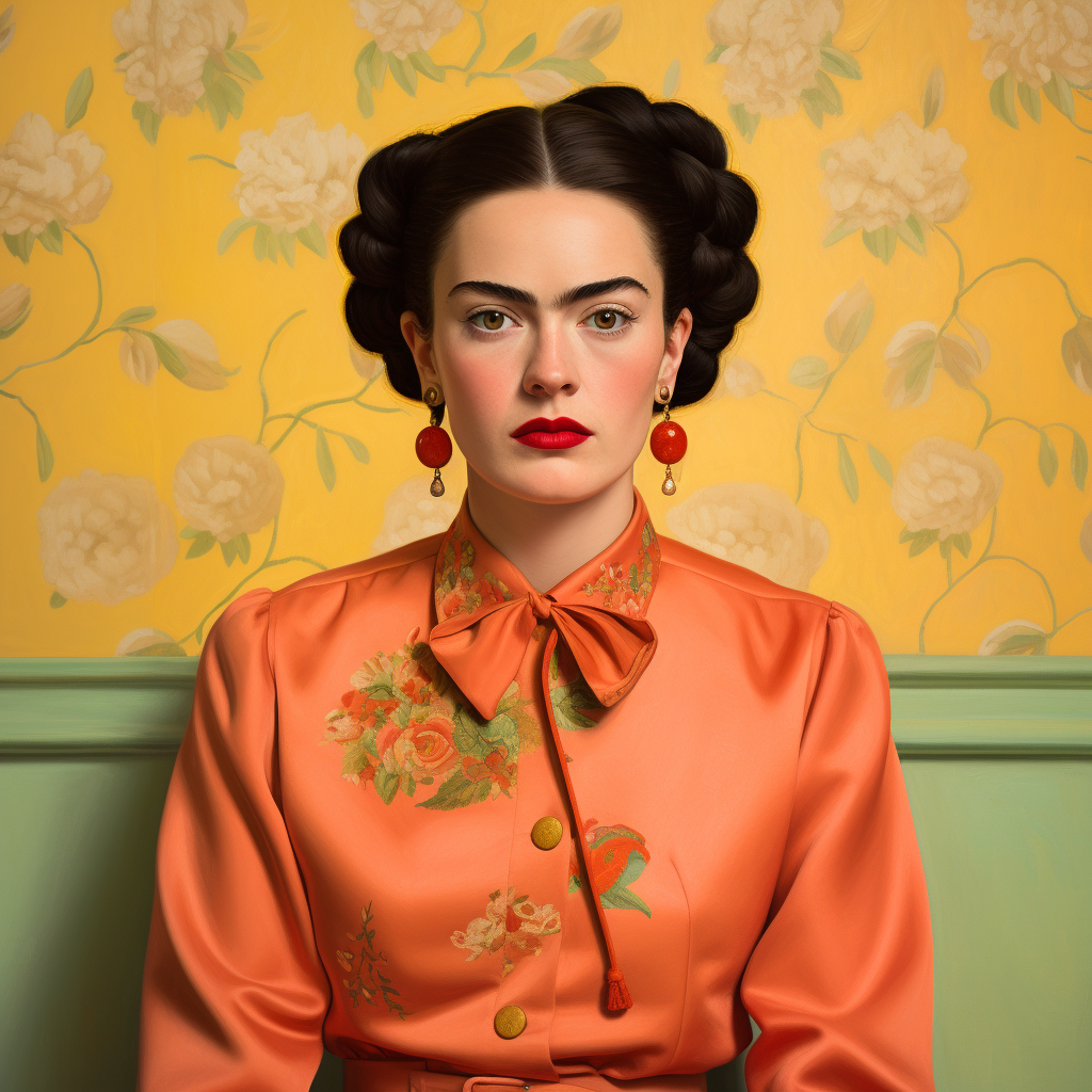 This portrait invites viewers to reflect on themes of identity, heritage, and the powerful influence of iconic figures like Frida Kahlo. The woman’s resemblance to Kahlo, combined with the traditional and vibrant elements of the composition, creates a powerful and evocative tribute to the legacy of the renowned artist. The image captures not only the physical likeness but also the spirit and strength that Kahlo embodied, making it a poignant and memorable piece of art.