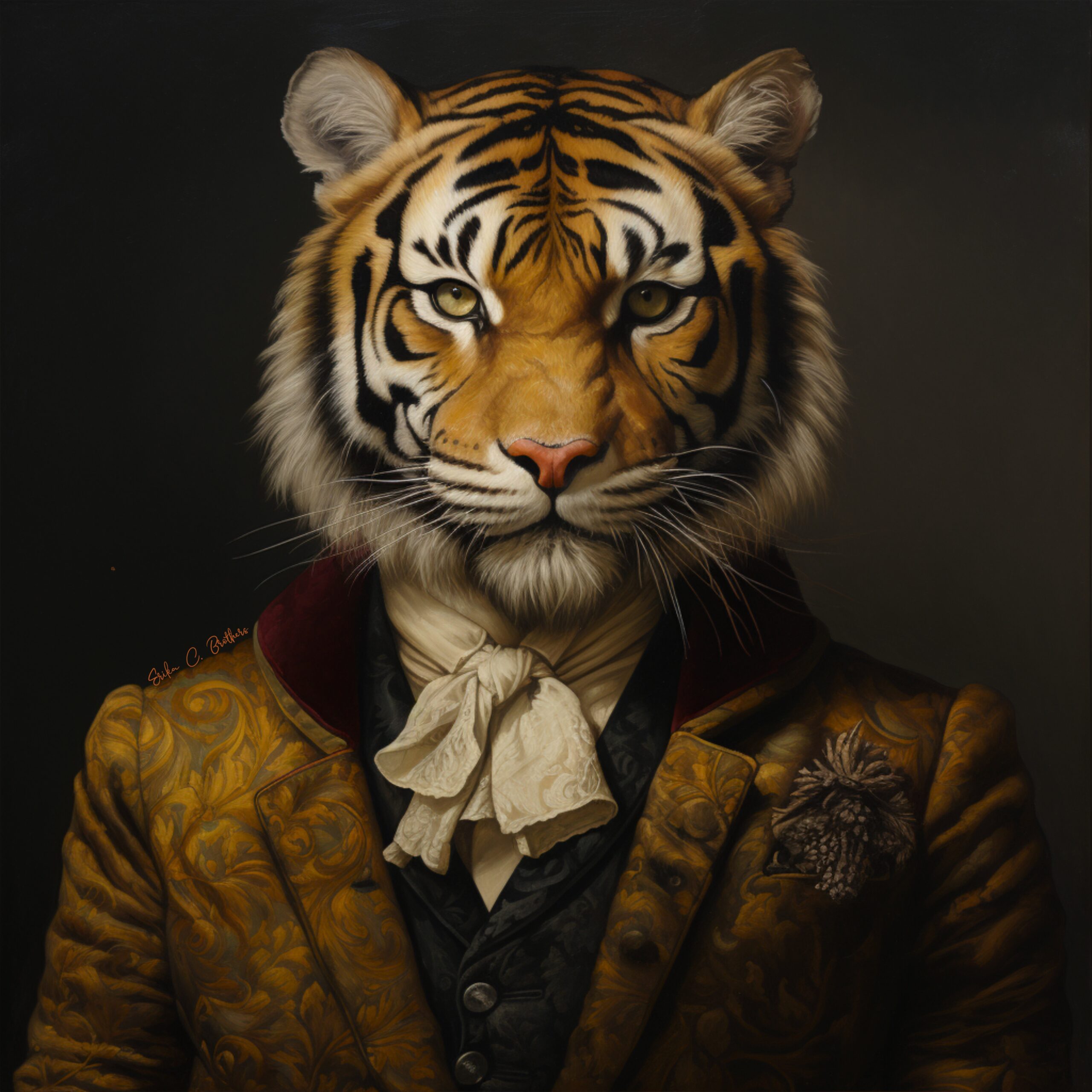 The image also evokes a sense of timelessness. The classical style of the portrait, with its formal composition and attention to detail, contrasts with the fantastical element of a tiger dressed as a human, creating a piece that feels both rooted in history and imaginatively futuristic. This timeless quality is enhanced by the tiger’s expression, which, while fierce, also carries a hint of wisdom and contemplation, as if it is aware of its role within this imagined aristocracy.