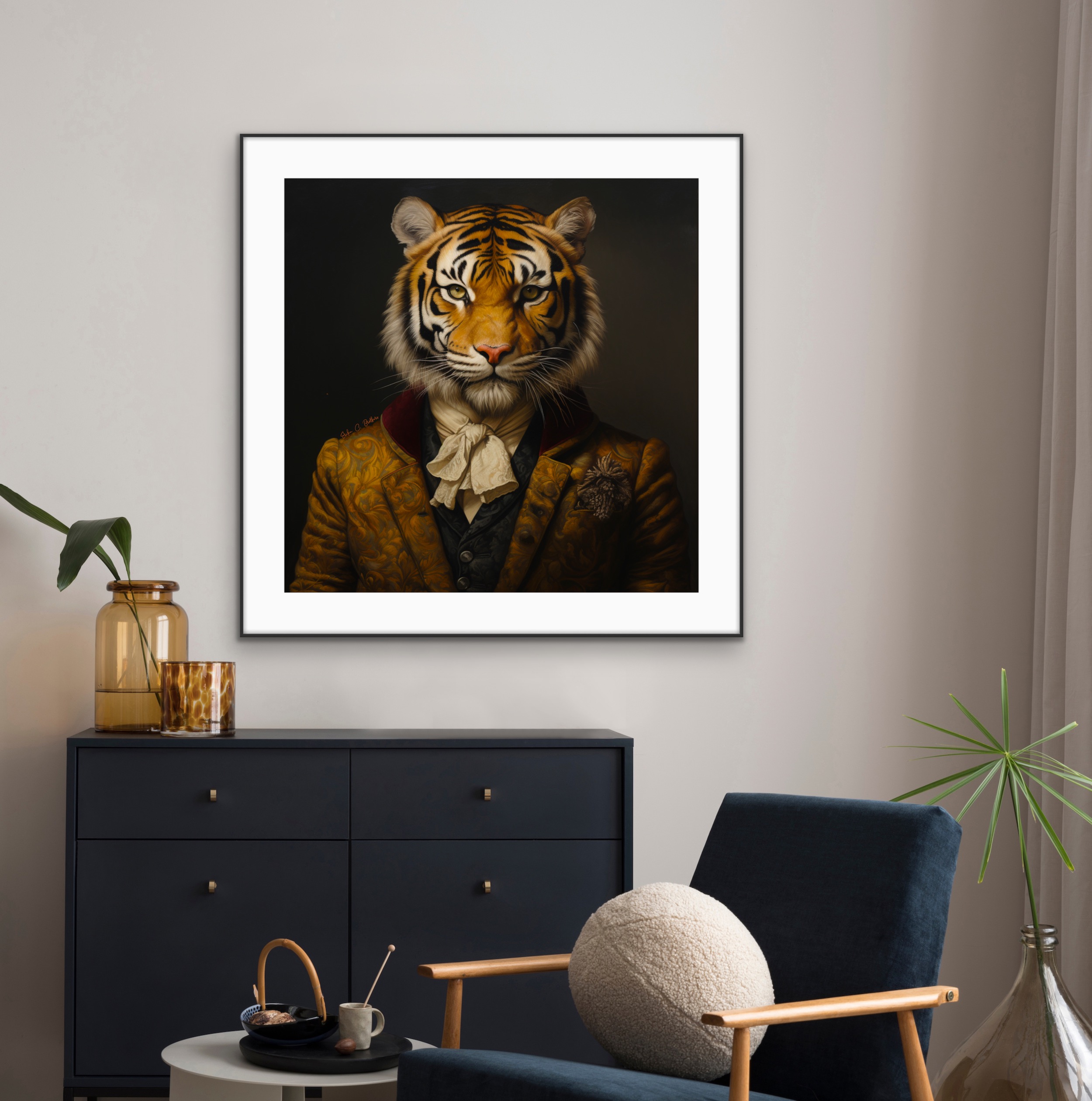 Symbolically, the image plays with themes of power, nobility, and the blending of human and animal traits. The tiger, a symbol of strength, courage, and wild beauty, is juxtaposed with the human-like attire of an aristocrat, which traditionally represents wealth, status, and refinement. This combination creates a commentary on the nature of power and nobility, suggesting that these qualities are not confined to humanity alone but can also be found in the natural world.