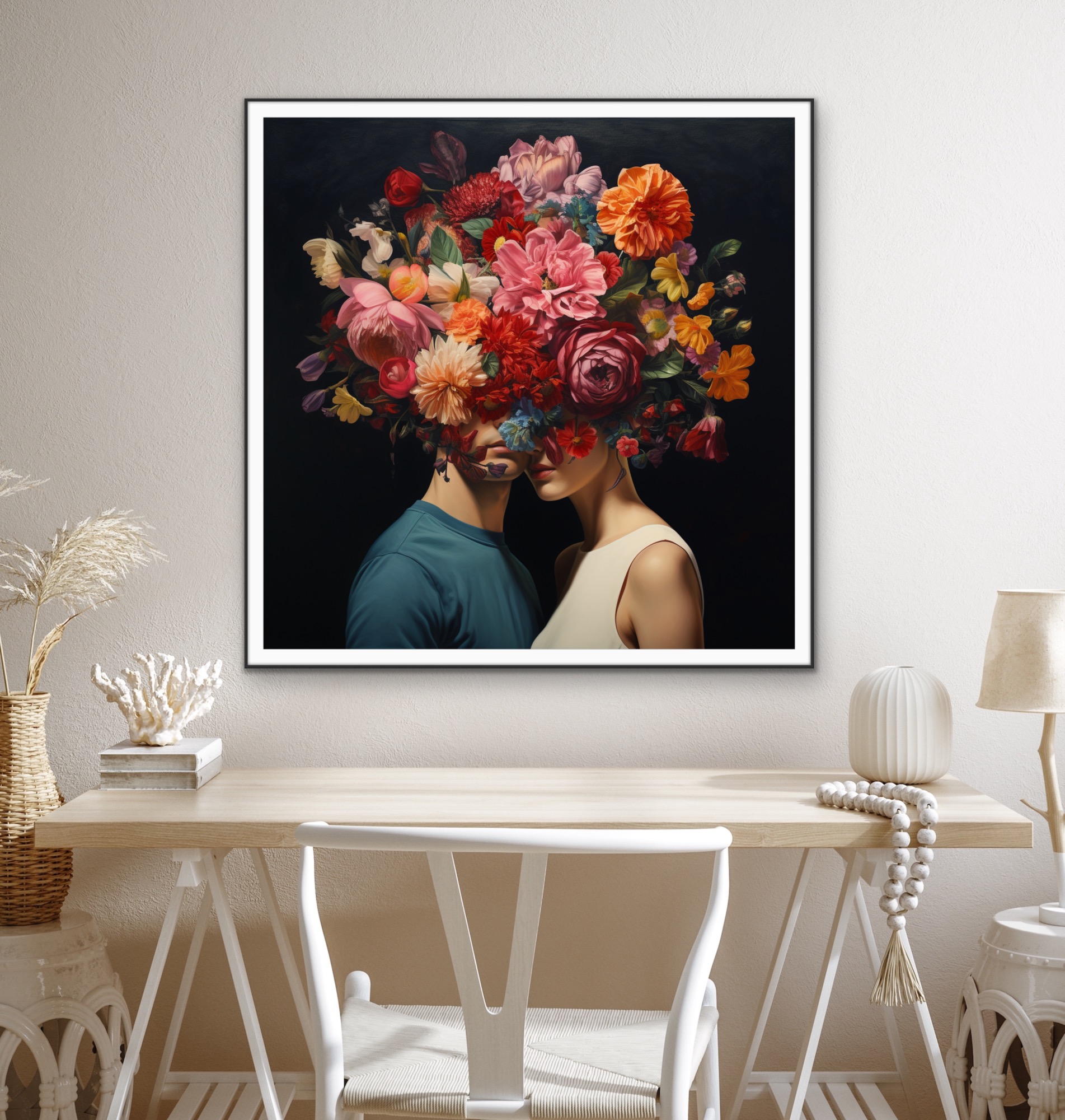 The image evokes a range of emotions and themes, from the serene beauty of nature to the mystery and complexity of human relationships. The blending of human and floral elements suggests a deep connection between the couple and the natural world, symbolizing growth, vitality, and the intertwined nature of human life and the environment. The obscured faces invite viewers to reflect on themes of identity, anonymity, and the ways in which we present ourselves to the world.