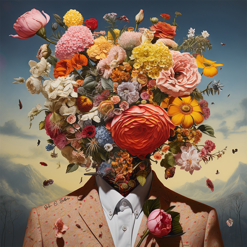 This image evokes a sense of whimsy and fantasy, with the concept of a head made entirely of flowers suggesting themes of nature, growth, and renewal. The flowers can be seen as a metaphor for the mind or the inner self, blooming and flourishing with ideas, emotions, and creativity. The blend of human and floral elements invites viewers to reflect on the interconnectedness of humans and nature, and the ways in which they can coexist and enrich each other.