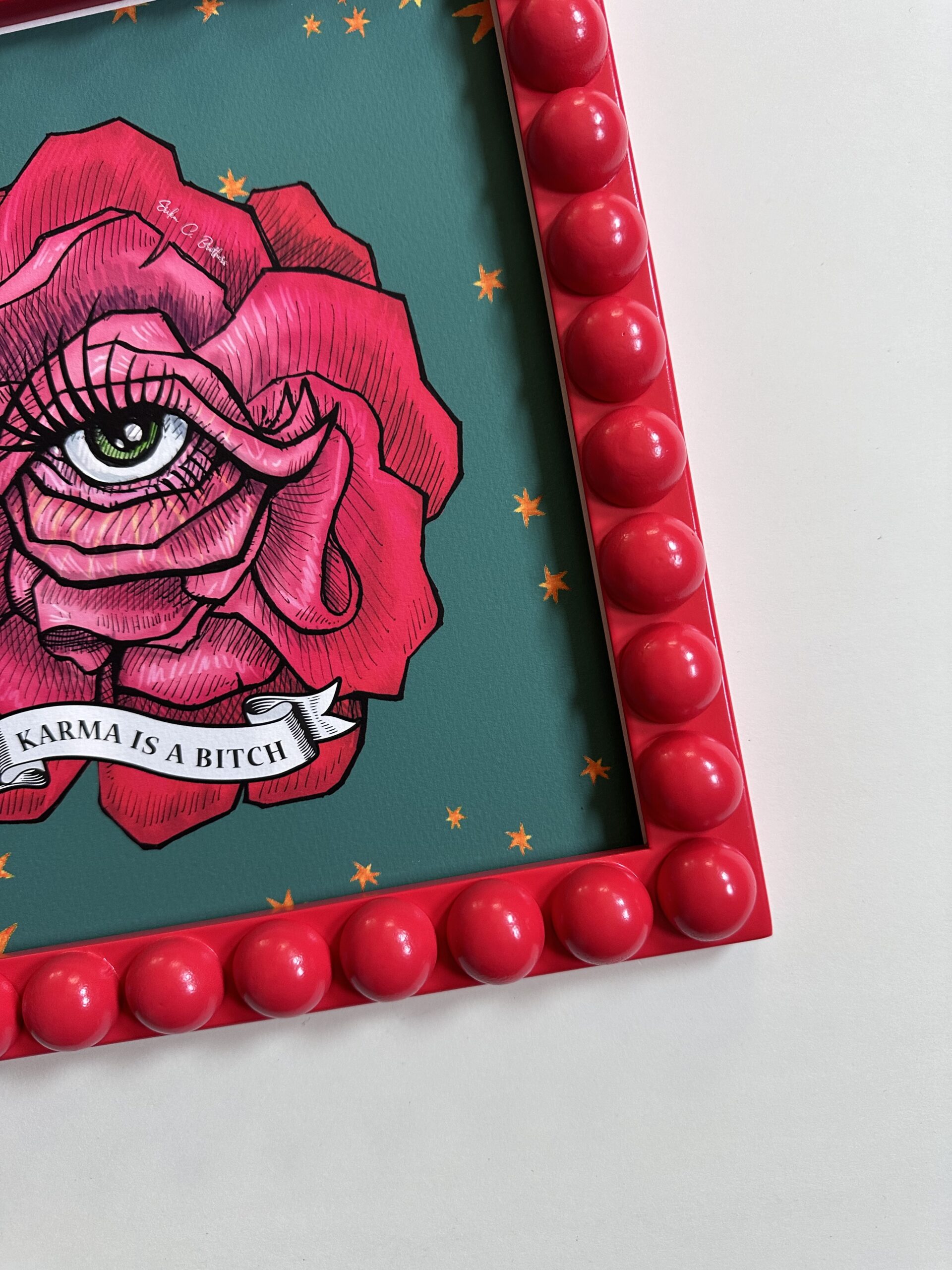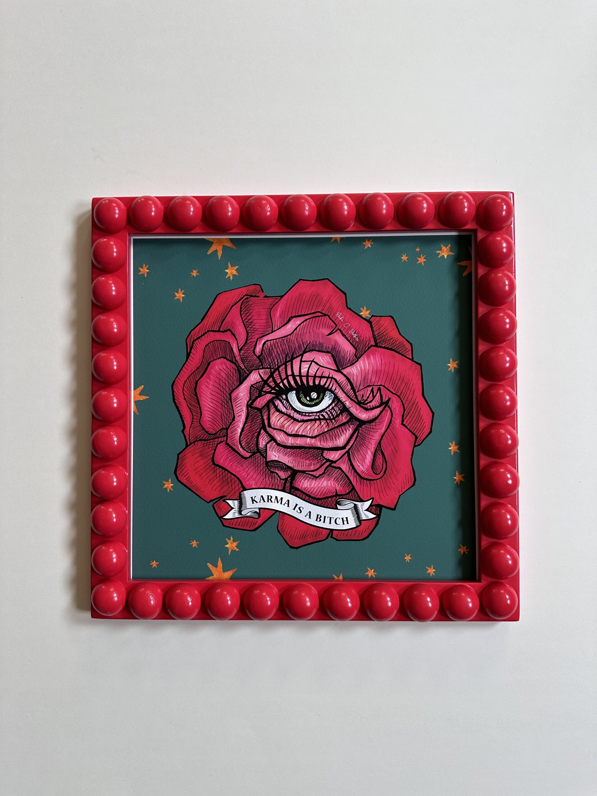 Karma is a Bitch art piece framed on a 10″x10″ Red Bobbin Bead frame, which comes with black foamy as a backing and a clear acrylic protects it. Our handmade wood and paint frames perfectly blend rustic charm and artistic design. Each frame is carefully crafted using quality wood, and each frame is uniquely designed for each print and has its handmade characteristics.