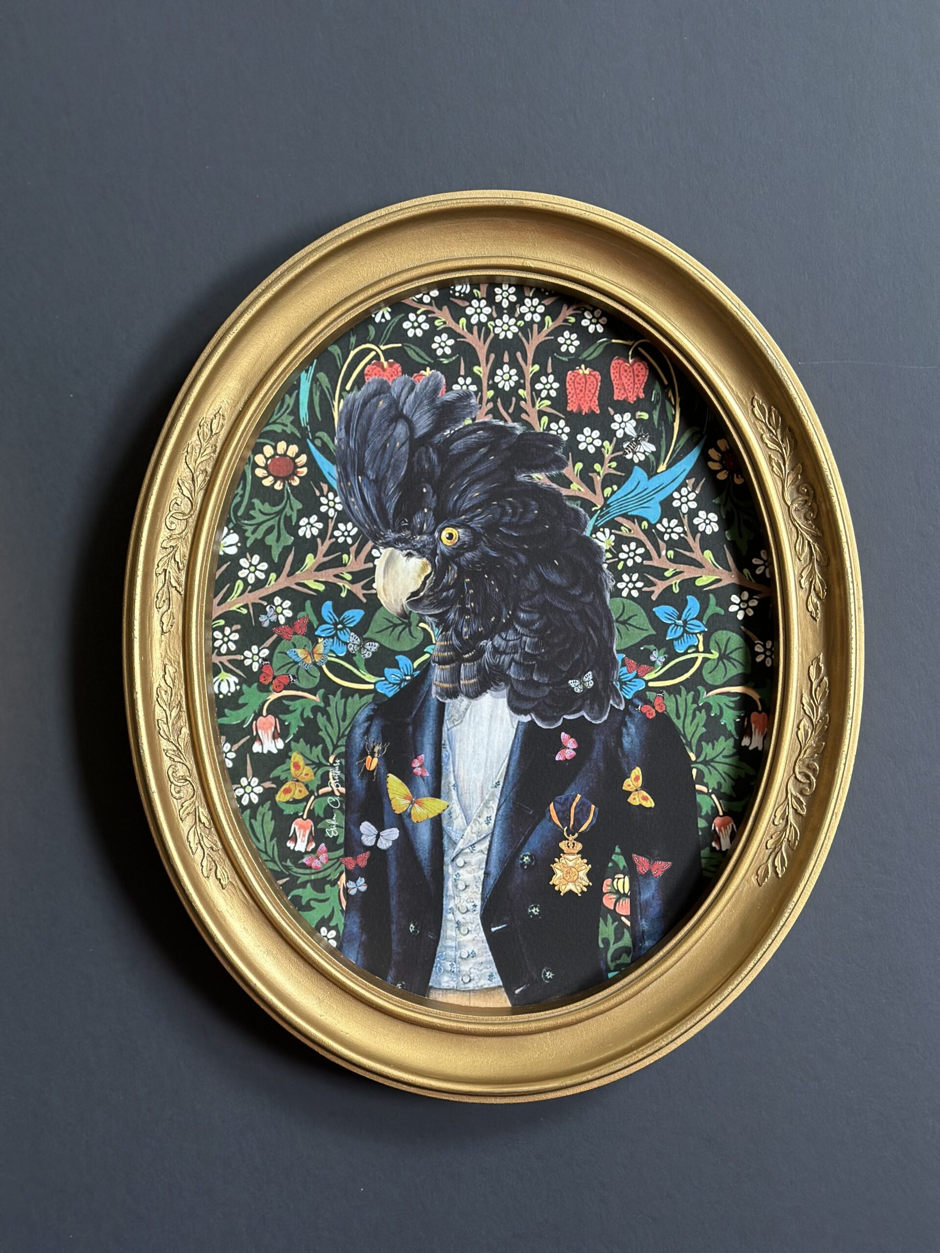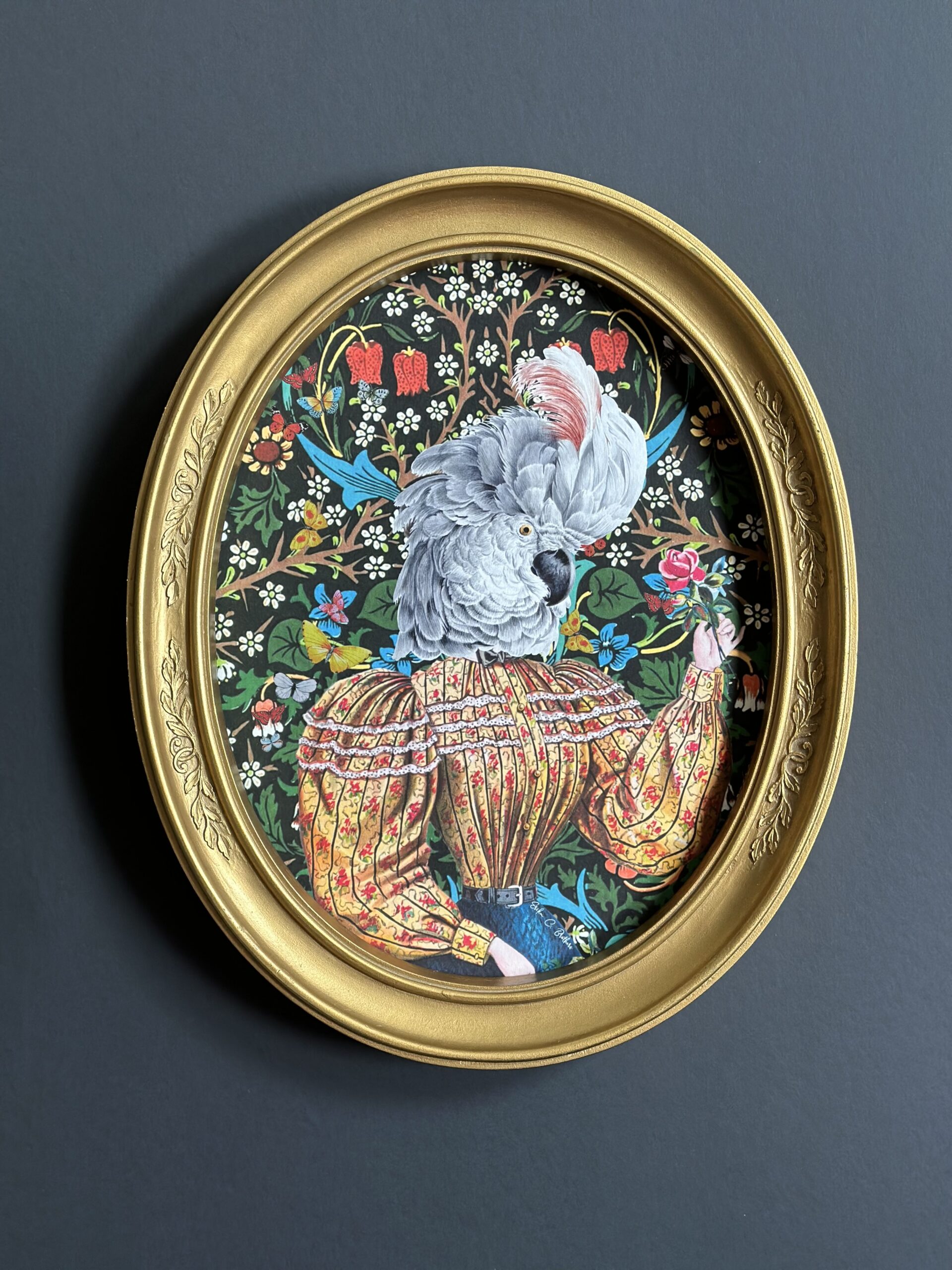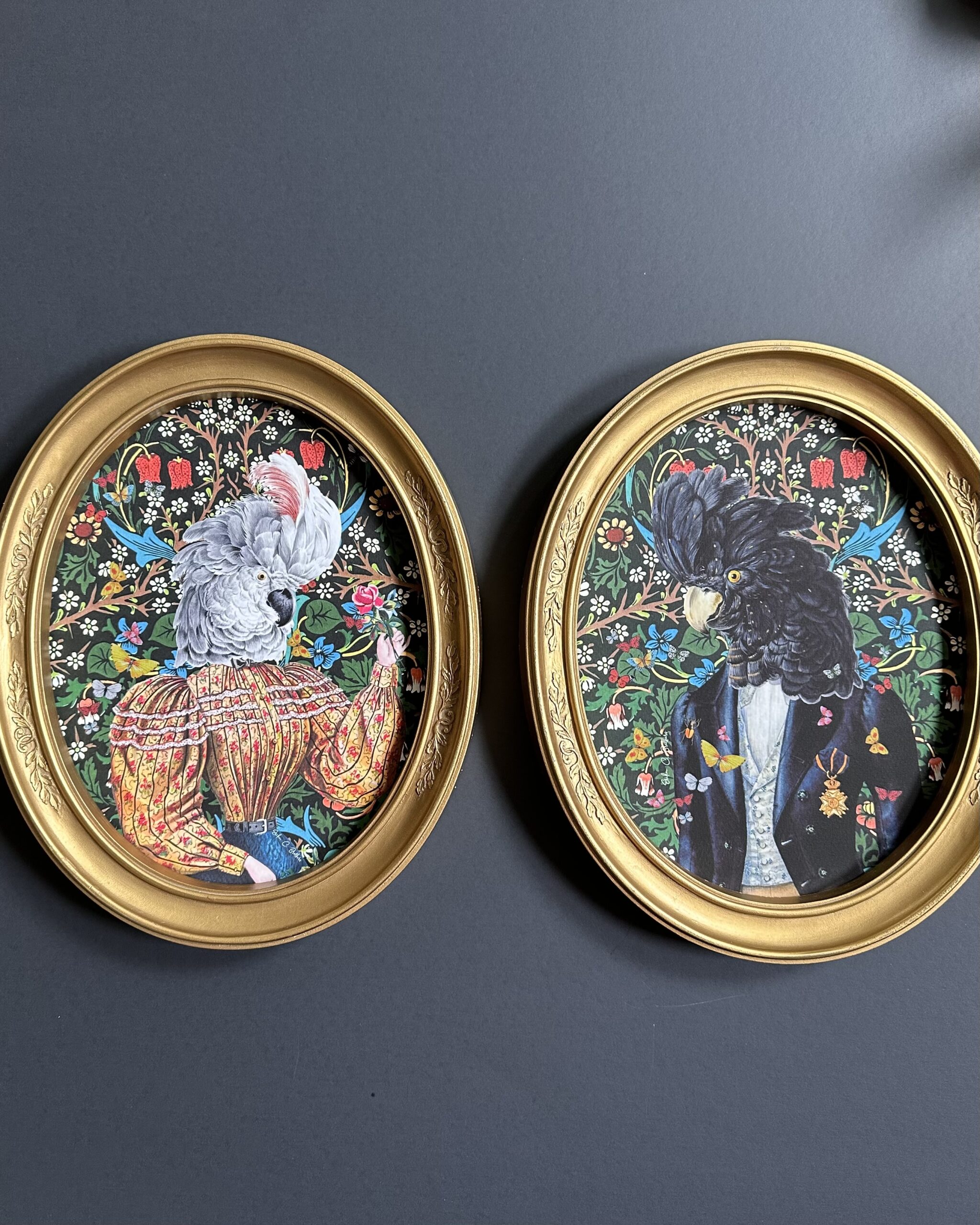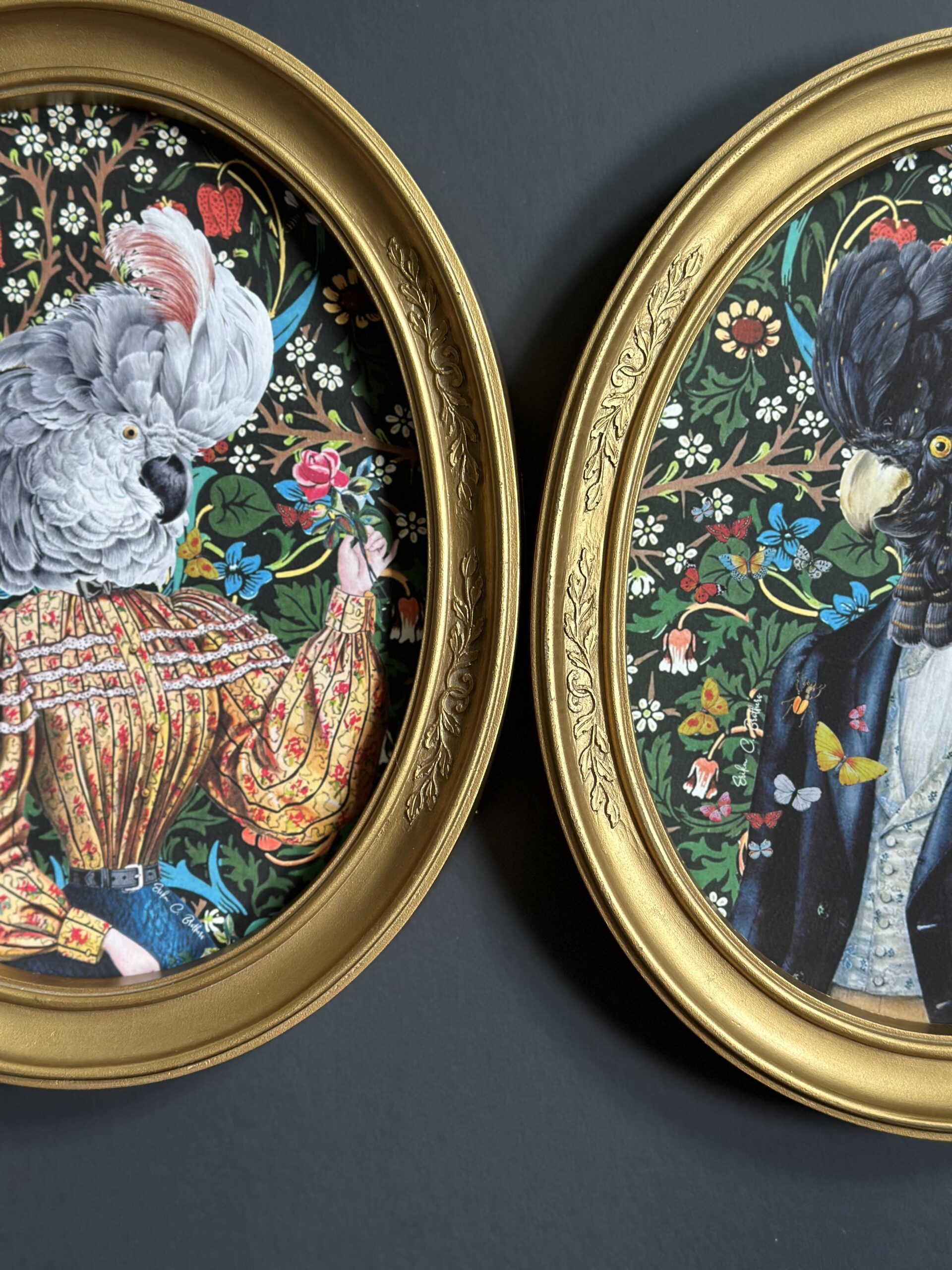 Mr. and Mrs. Feathers – Art framed on an ornate golden frame, with glass.