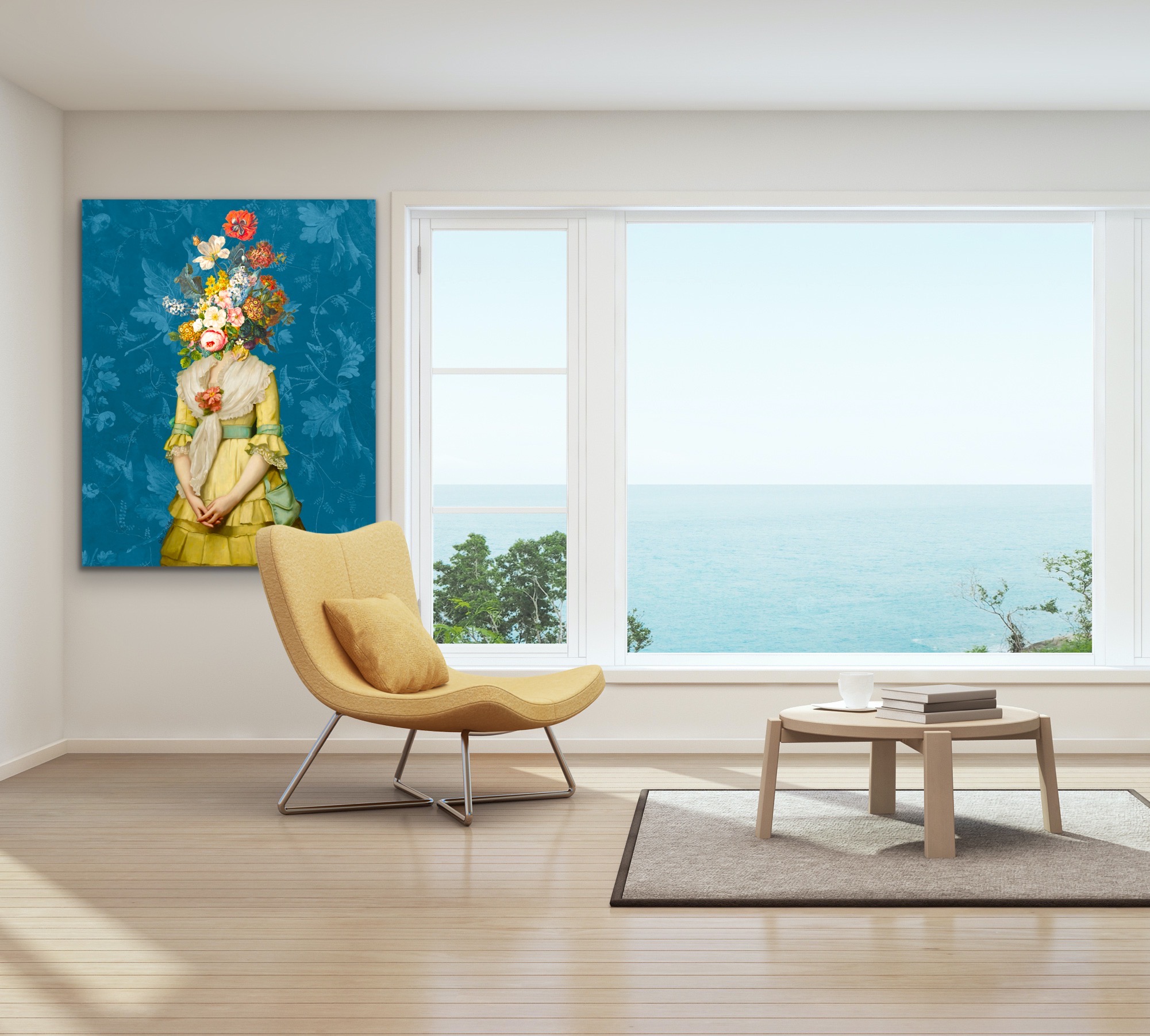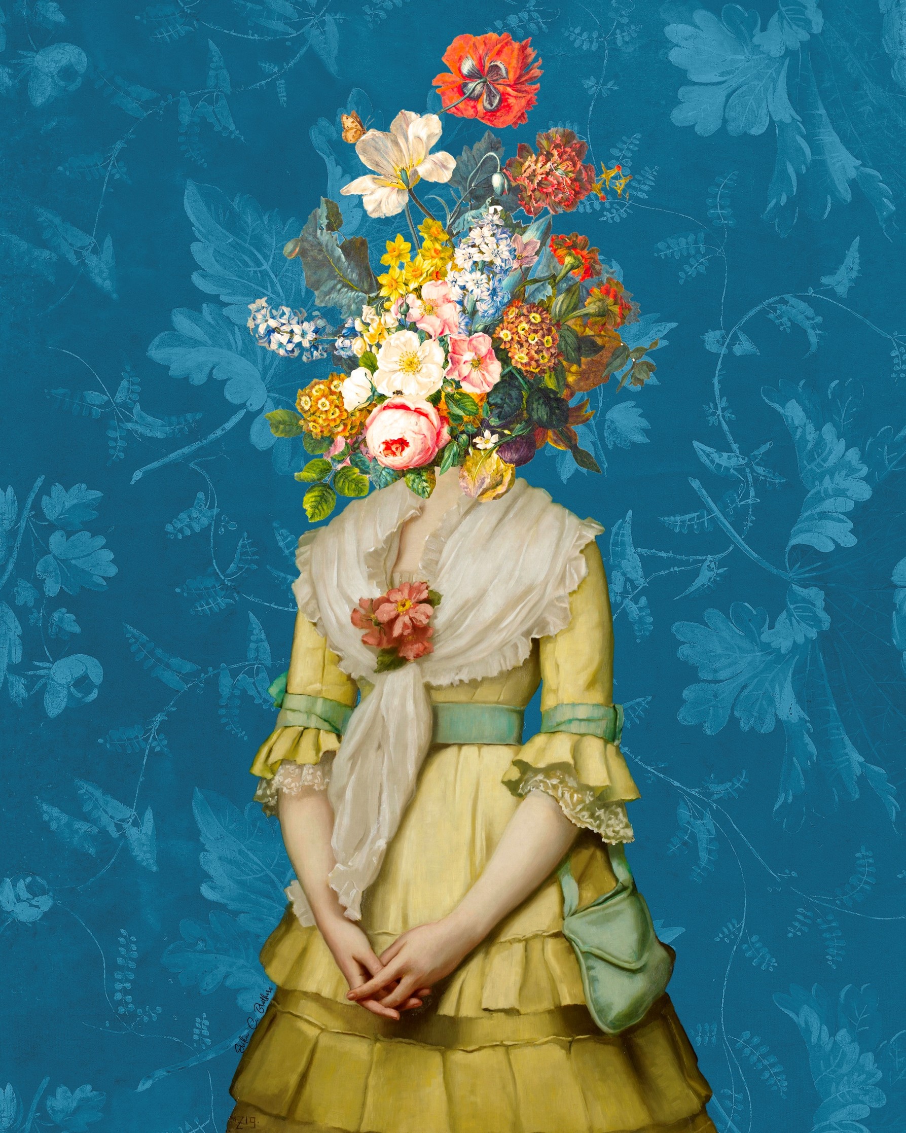 The combination of the floral head and historical attire evokes themes of nature, identity, and the passage of time. The flowers, often symbols of beauty, growth, and ephemerality, add a layer of symbolism to the figure, suggesting a connection to natural cycles and the fleeting nature of life. The historical dress, with its connotations of a bygone era, contrasts with the modern surrealism of the floral head, creating a dialogue between past and present, tradition and imagination.