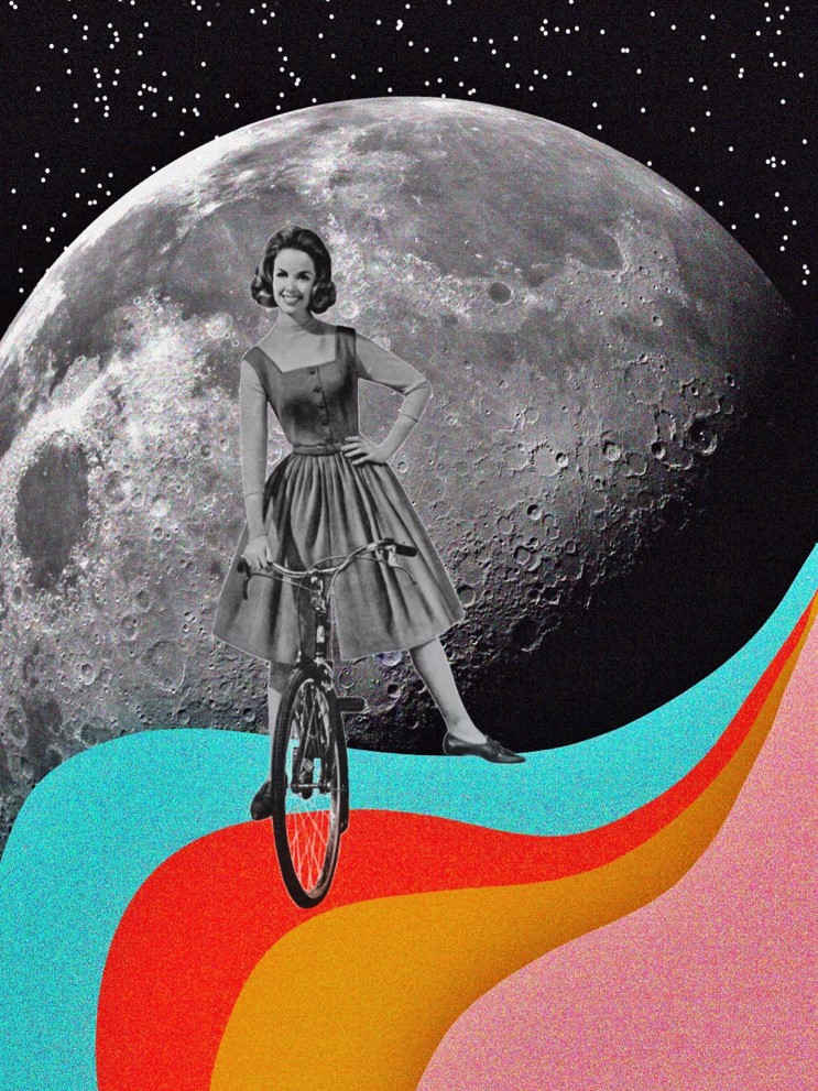 The image is a delightful and whimsical illustration that combines elements of vintage photography, space exploration, and psychedelic art to create a visually captivating and imaginative scene. At the center of the composition is a black-and-white photograph of a woman from the mid-20th century, confidently riding a bicycle. The background features a striking, detailed image of the moon, with its craters and textures rendered in high contrast. Surrounding these central elements are vibrant, flowing waves of color, creating a surreal and dreamlike atmosphere.