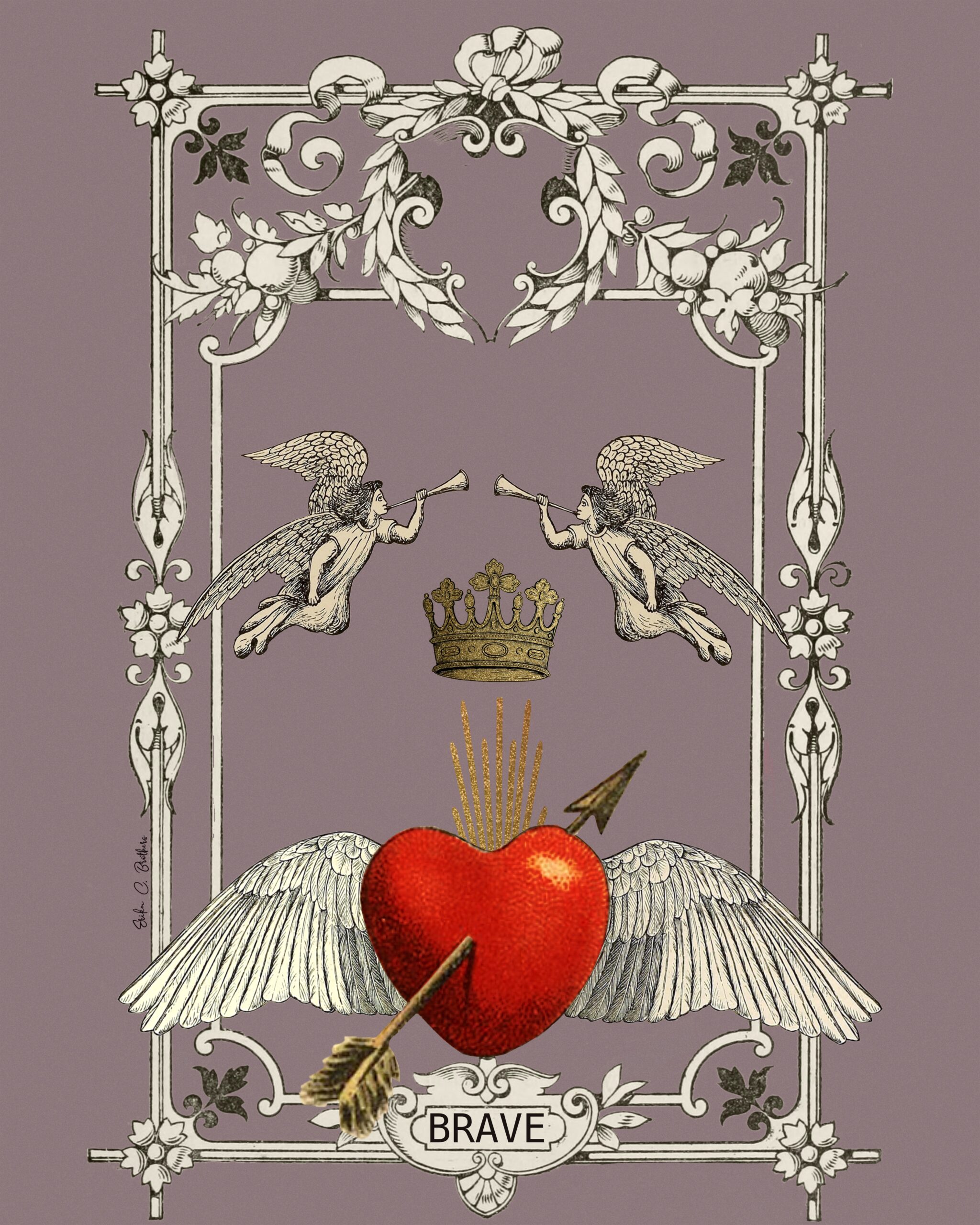 Flanking the crown are two cherubic angels. These angels, depicted in classical style with detailed wings and serene expressions, are shown blowing trumpets. The trumpets symbolize a proclamation or announcement, perhaps heralding the recognition of the heart’s bravery. The inclusion of angels introduces a heavenly or spiritual dimension to the artwork, reinforcing the idea that bravery is not just a human trait but a divine virtue.