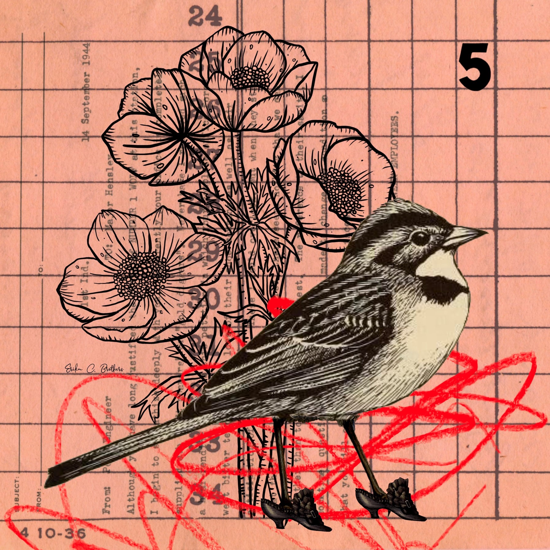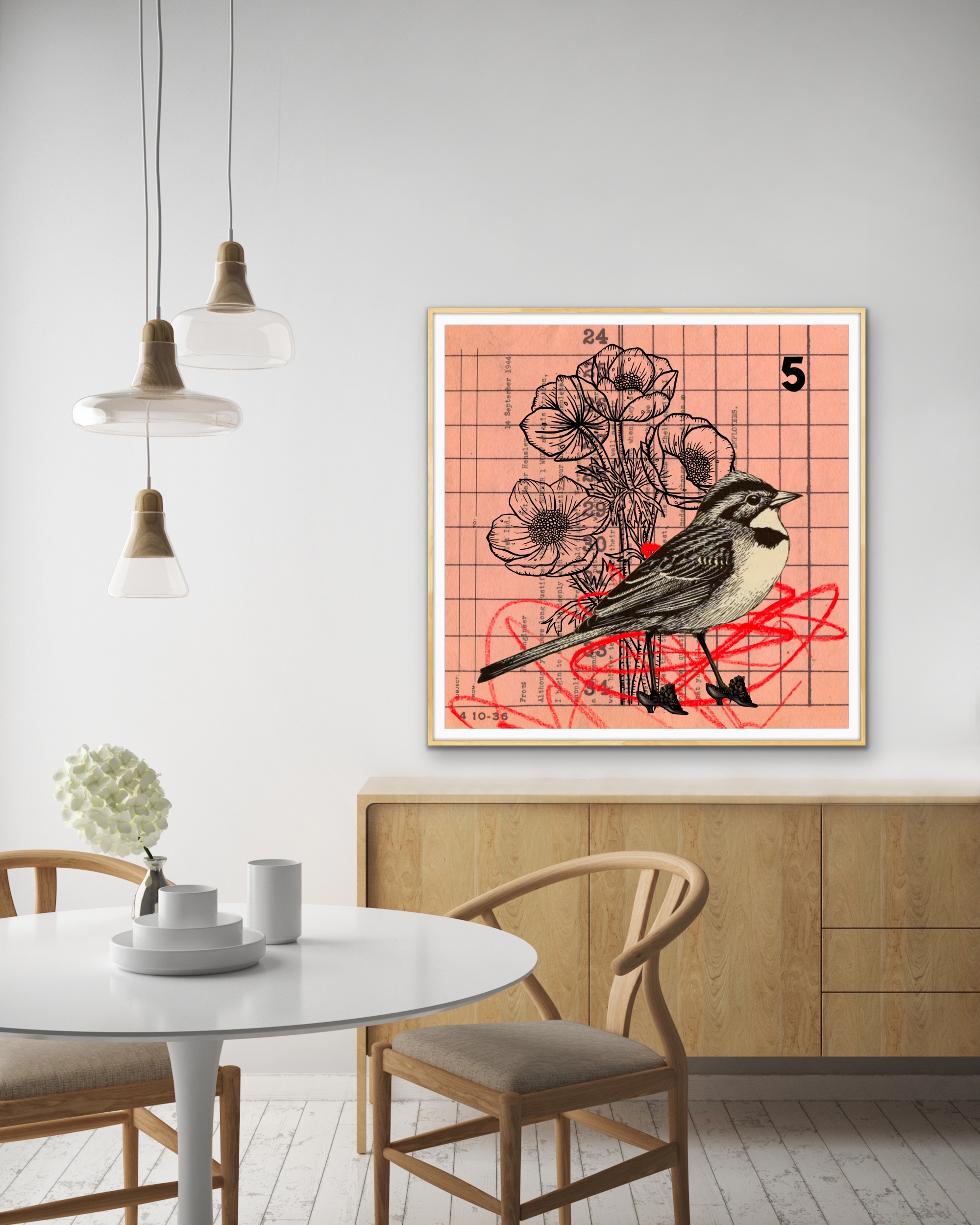 This artwork evokes themes of nature, imagination, and the intersection of reality and fantasy. The detailed rendering of the bird and flowers showcases the artist’s skill and attention to detail, while the addition of the shoes and red scribbles adds a playful and surreal touch. The use of numbers and grid patterns suggests a form of organization and structure, hinting at a deeper context or narrative behind the composition.