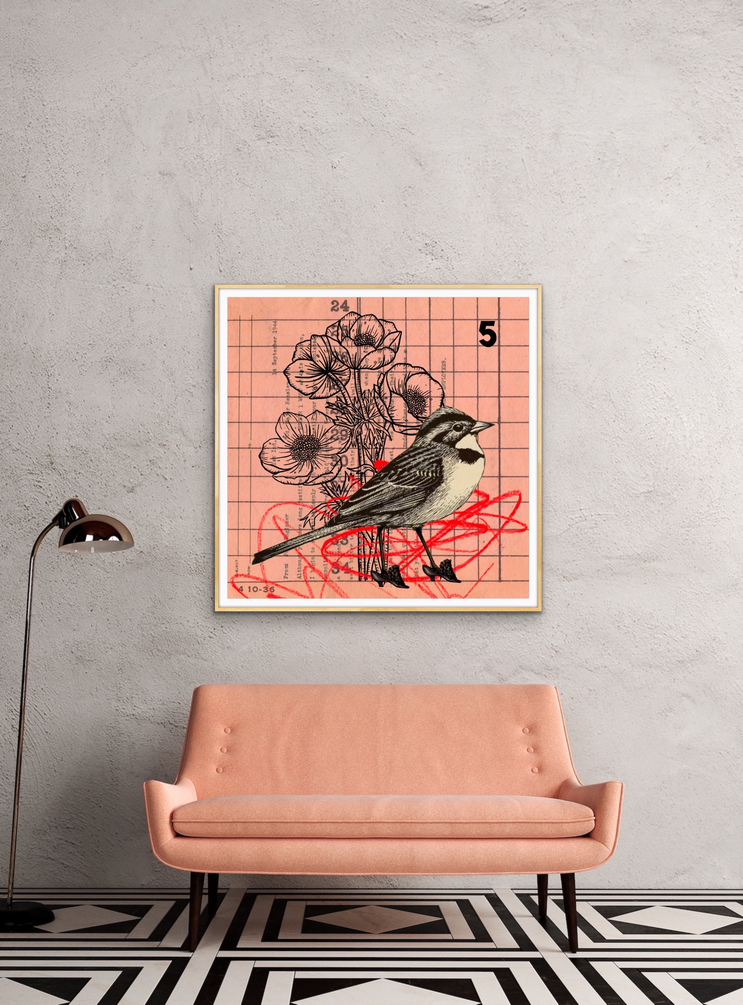 The background itself is a soft pink hue, providing a gentle and calming contrast to the black and white elements of the bird and flowers. This pink backdrop is overlaid with a grid pattern, which adds a geometric and structured element to the composition. The grid lines are subtle but noticeable, providing a sense of order and balance to the artwork.
