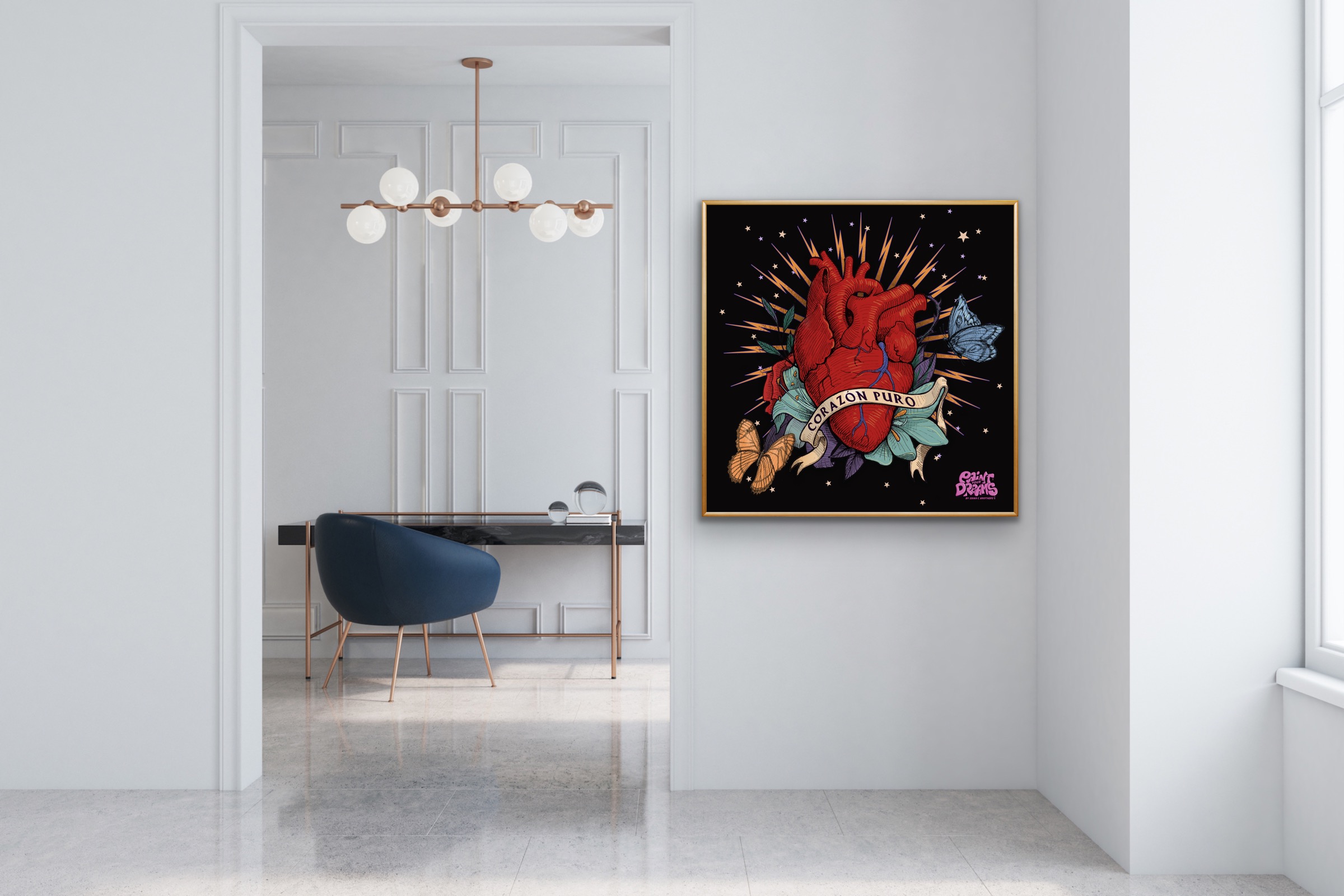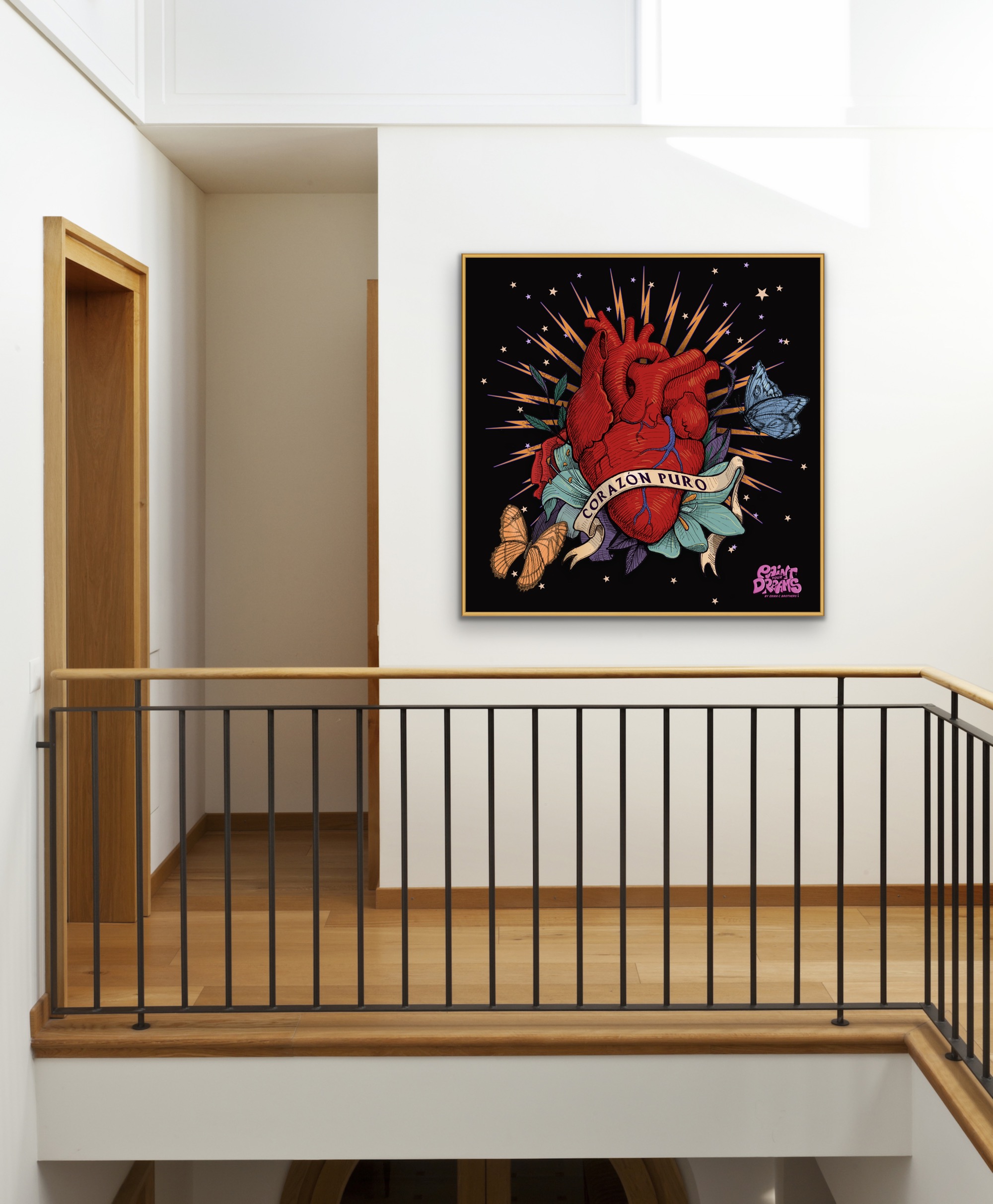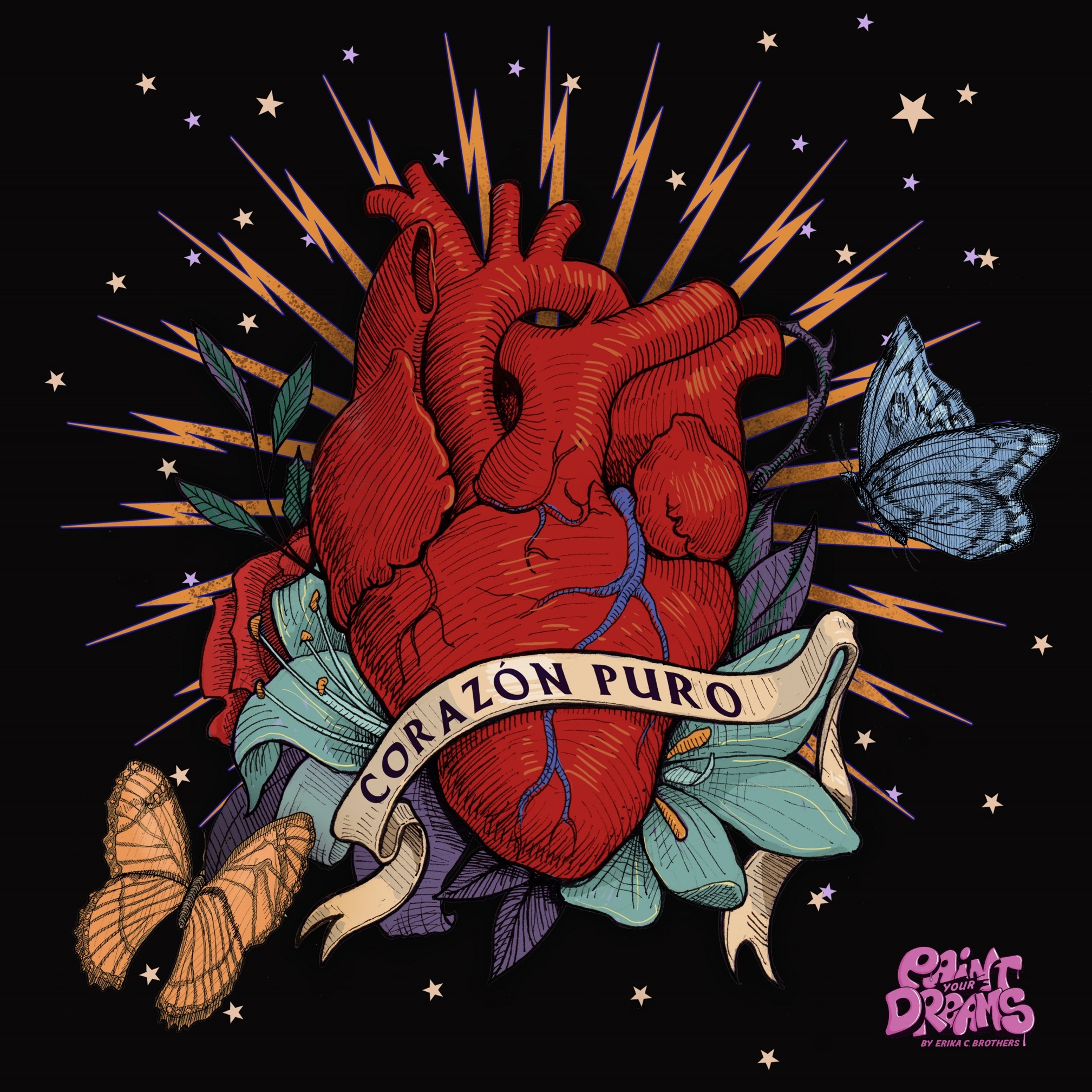 The heart is the primary focus of the composition, depicted in a rich, deep red that immediately draws the viewer’s eye. Its realistic portrayal, with visible veins and arteries, adds a touch of medical illustration, yet the heart is elevated beyond its physical form by the surrounding elements. Wrapped around the heart is a flowing banner with the words “CORAZÓN PURO” (Pure Heart) inscribed on it. The text is elegantly written, emphasizing the purity and sincerity suggested by the phrase. This banner not only provides a textual anchor to the image but also serves as a symbol of the heart’s virtues and intentions.