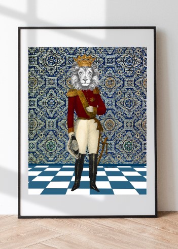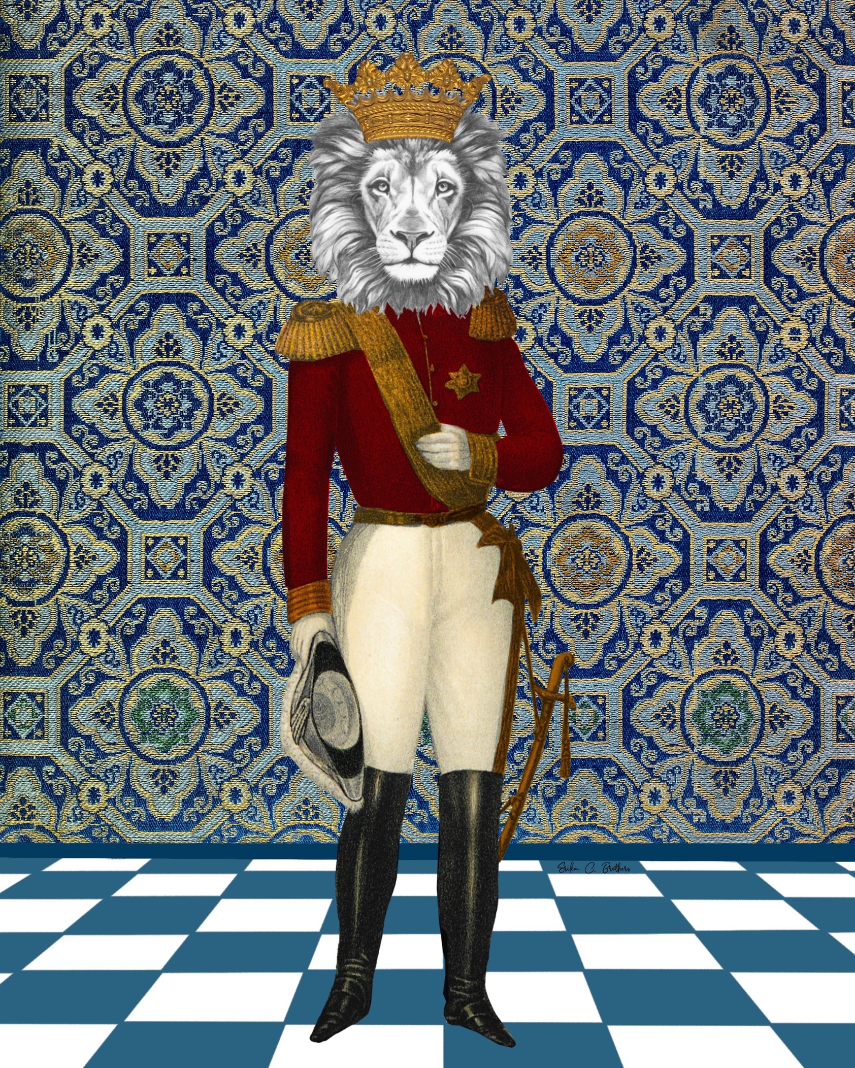 The overall composition of the image is carefully balanced, with each element contributing to the cohesive narrative of nobility and fantasy. The interplay between the detailed background, the regal attire, and the anthropomorphic figure creates a rich tapestry of visual and symbolic elements. The use of colors, particularly the blue and gold of the background, the red and gold of the uniform, and the black and white of the floor, creates a harmonious and visually engaging palette.