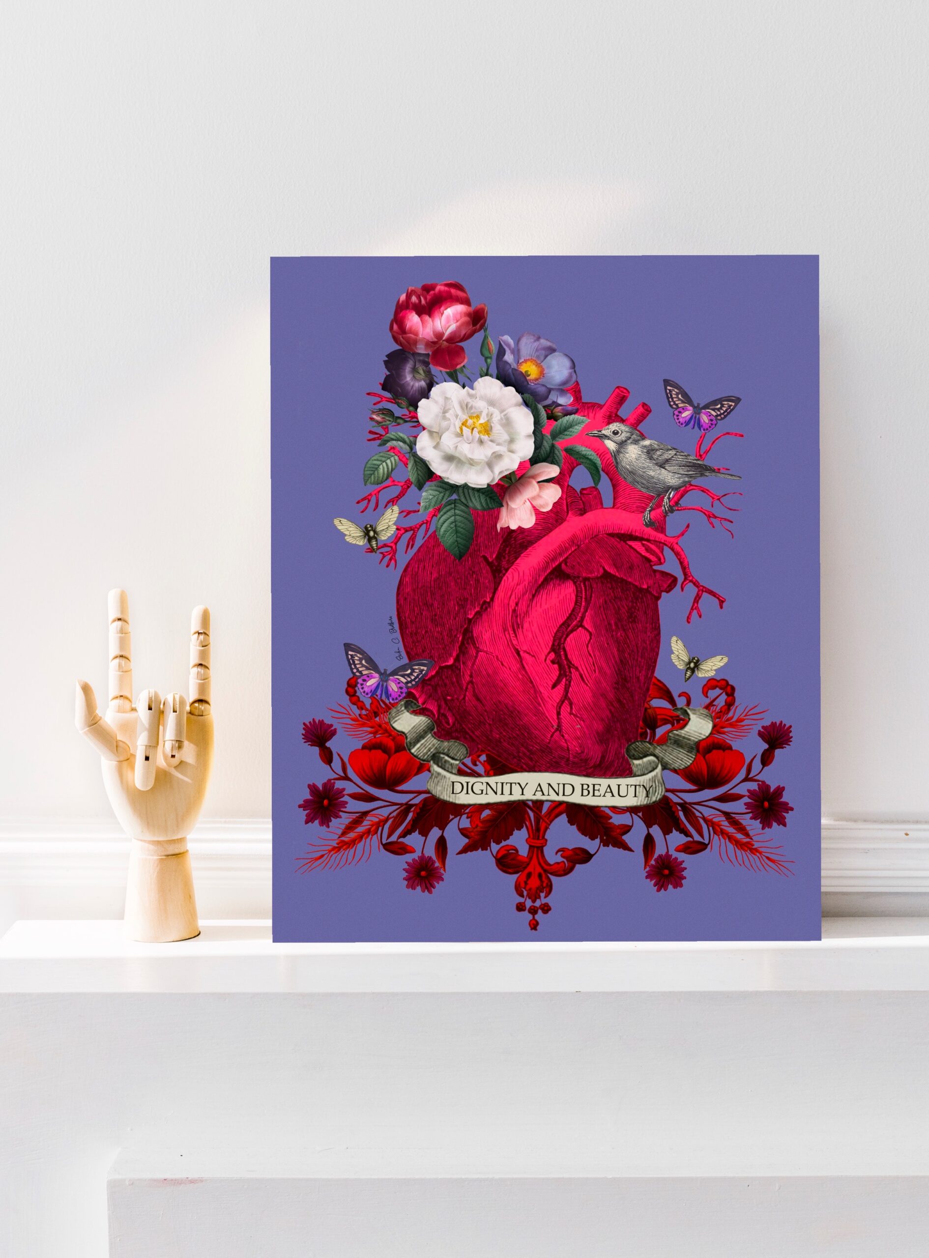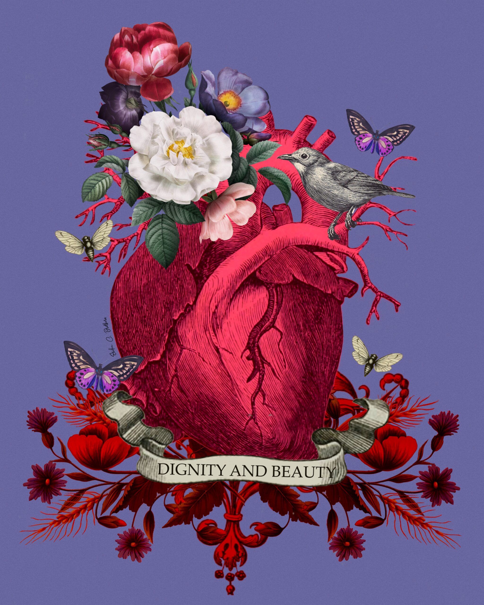 The overall composition is symmetrical and balanced, with the heart at the center and the surrounding elements radiating outwards. This symmetry contributes to the sense of harmony and order within the image, making it pleasing to the eye and reinforcing the themes of beauty and dignity.