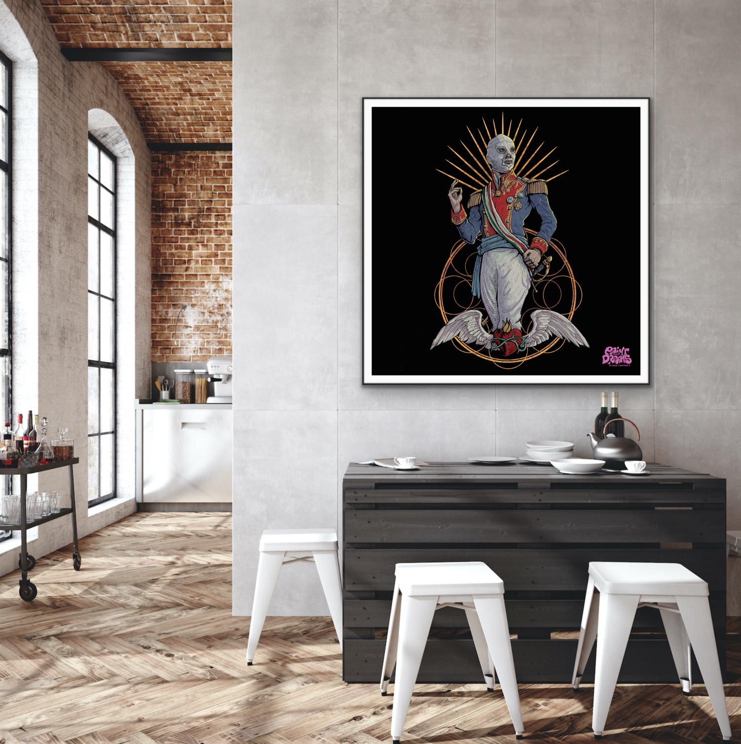 This artwork evokes themes of heroism, sacrifice, and the blending of earthly and divine power. The combination of the military uniform and the Lucha Libre mask suggests a narrative that transcends traditional boundaries, merging cultural icons with historical imagery to create a new kind of hero. The halo and geometric patterns introduce elements of spirituality and universal order, while the heart with wings symbolizes the figure’s connection to love and sacrifice.