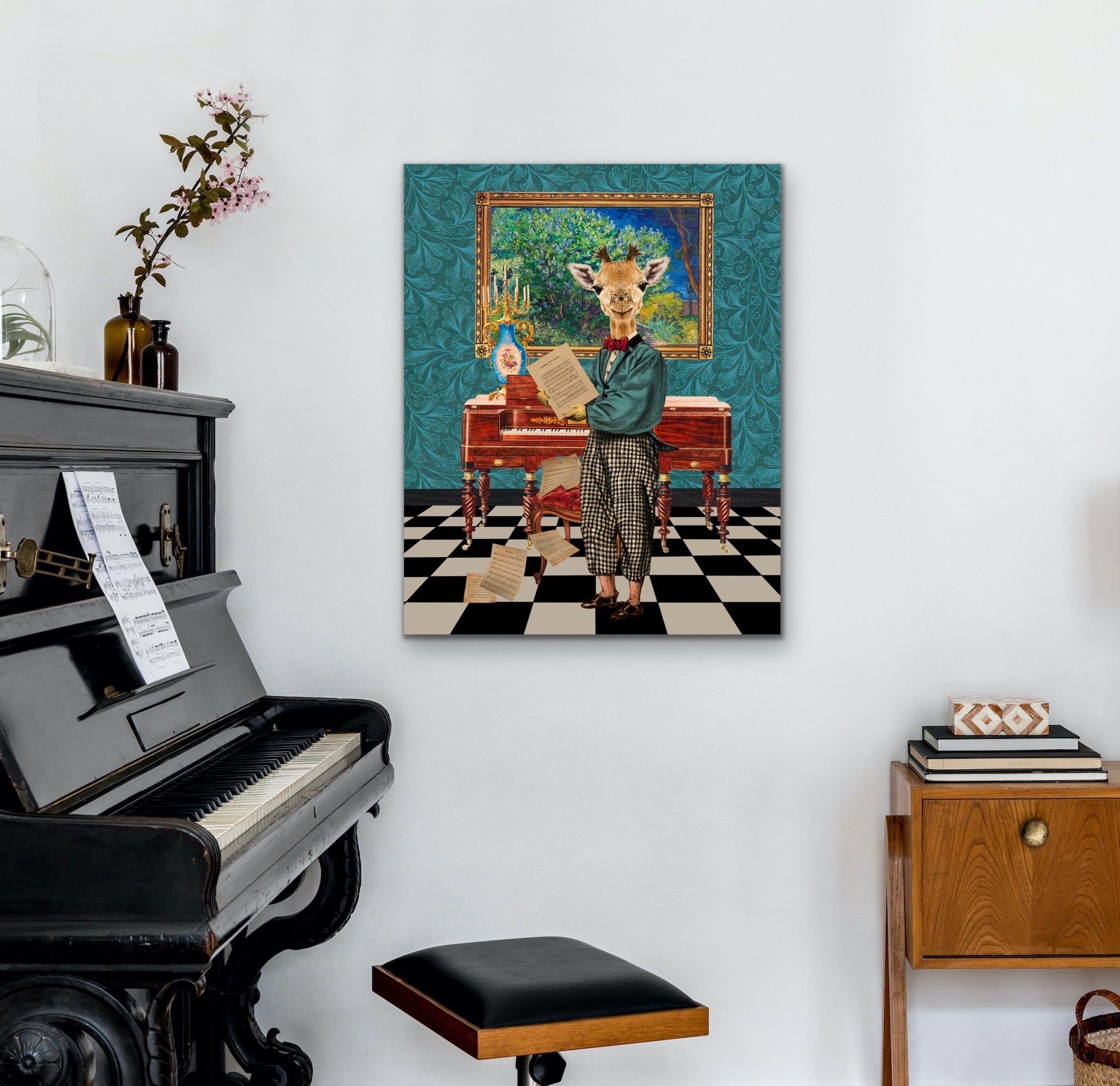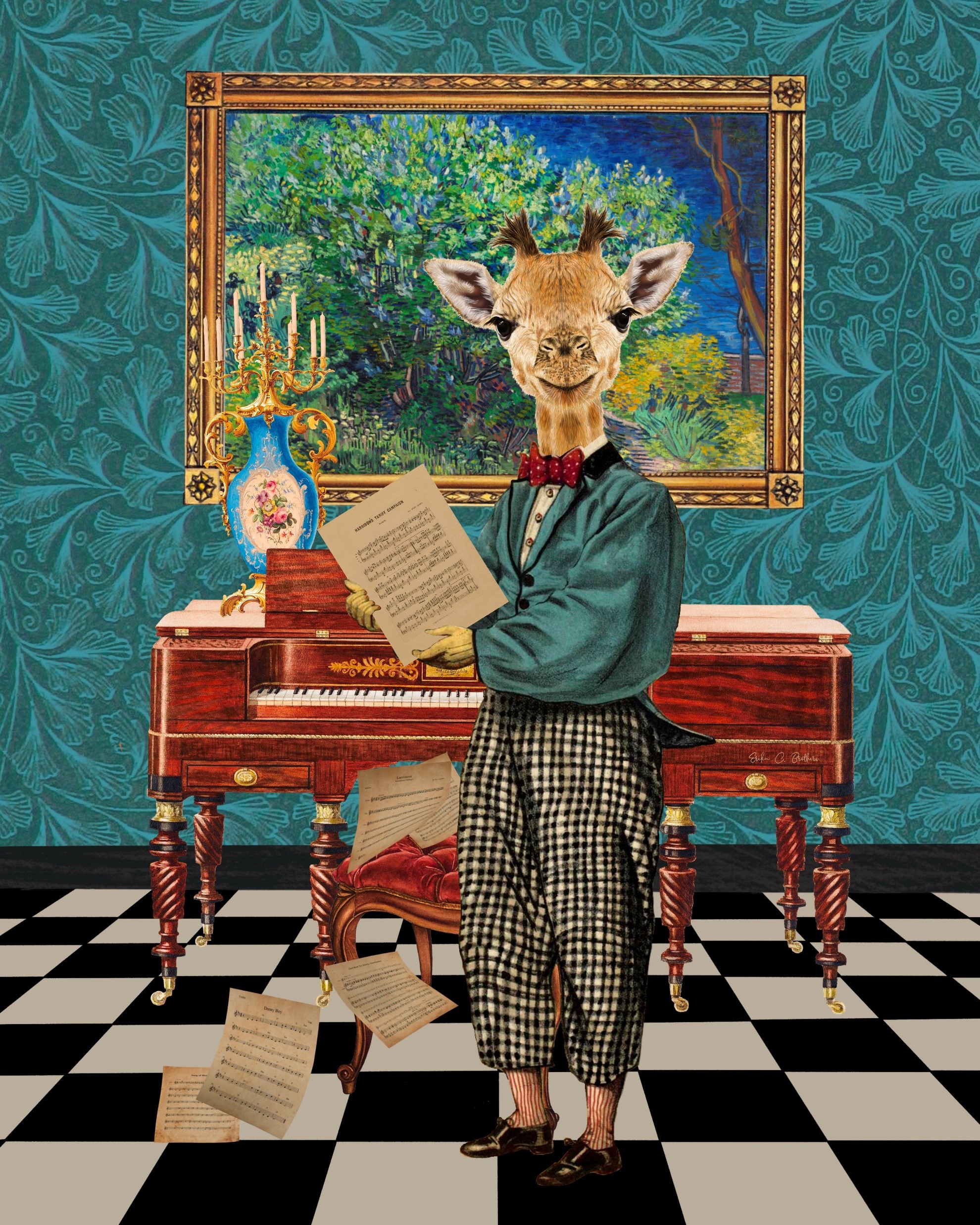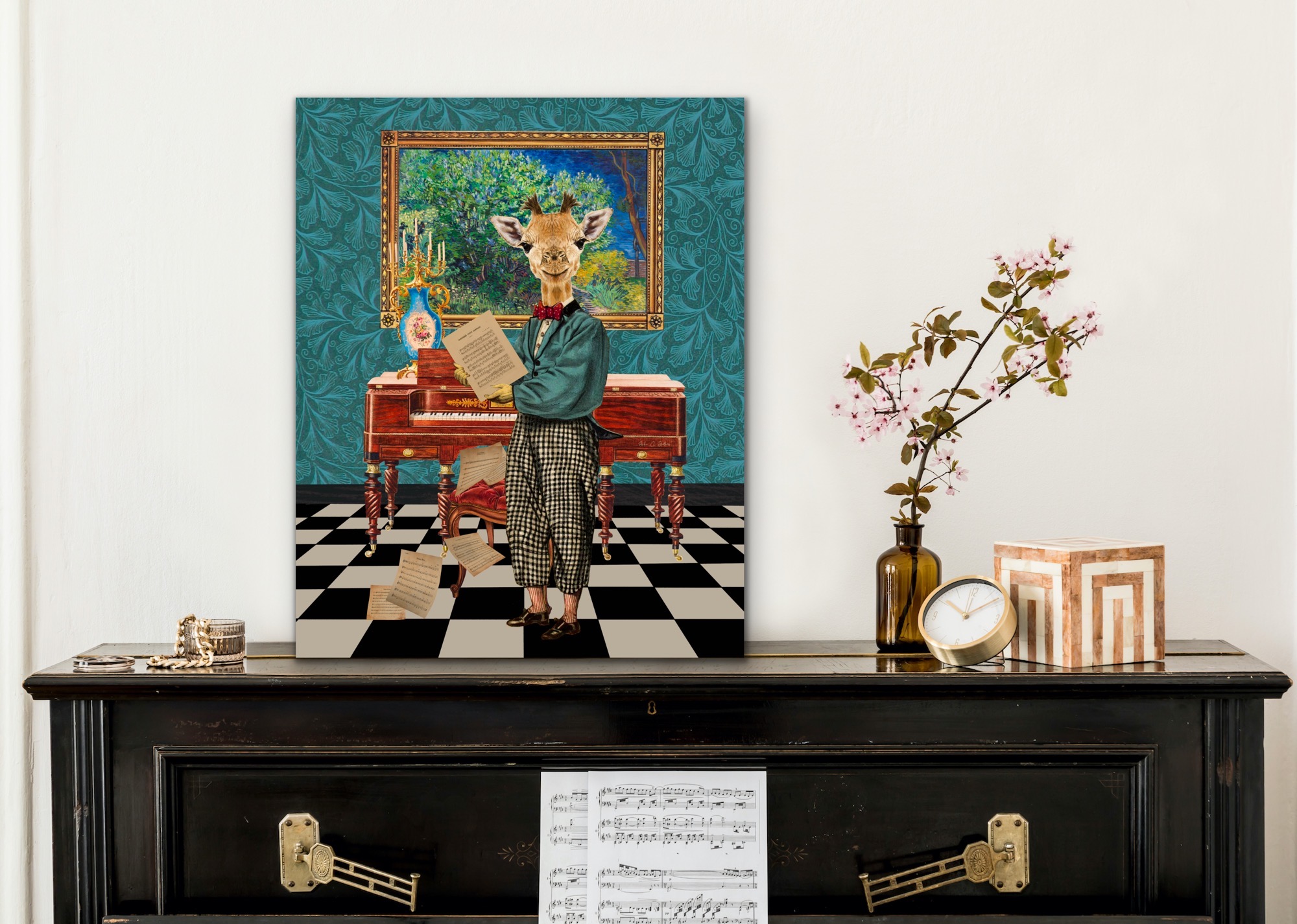 This artwork invites viewers to step into a fantastical world where animals and humans merge in a realm of historical elegance and artistic expression. The giraffe, as a musician, embodies the spirit of creativity and refinement, surrounded by luxurious furnishings and captivating art. The image challenges conventional perceptions of identity and sophistication, blending the natural grace of the giraffe with the cultivated elegance of human culture.