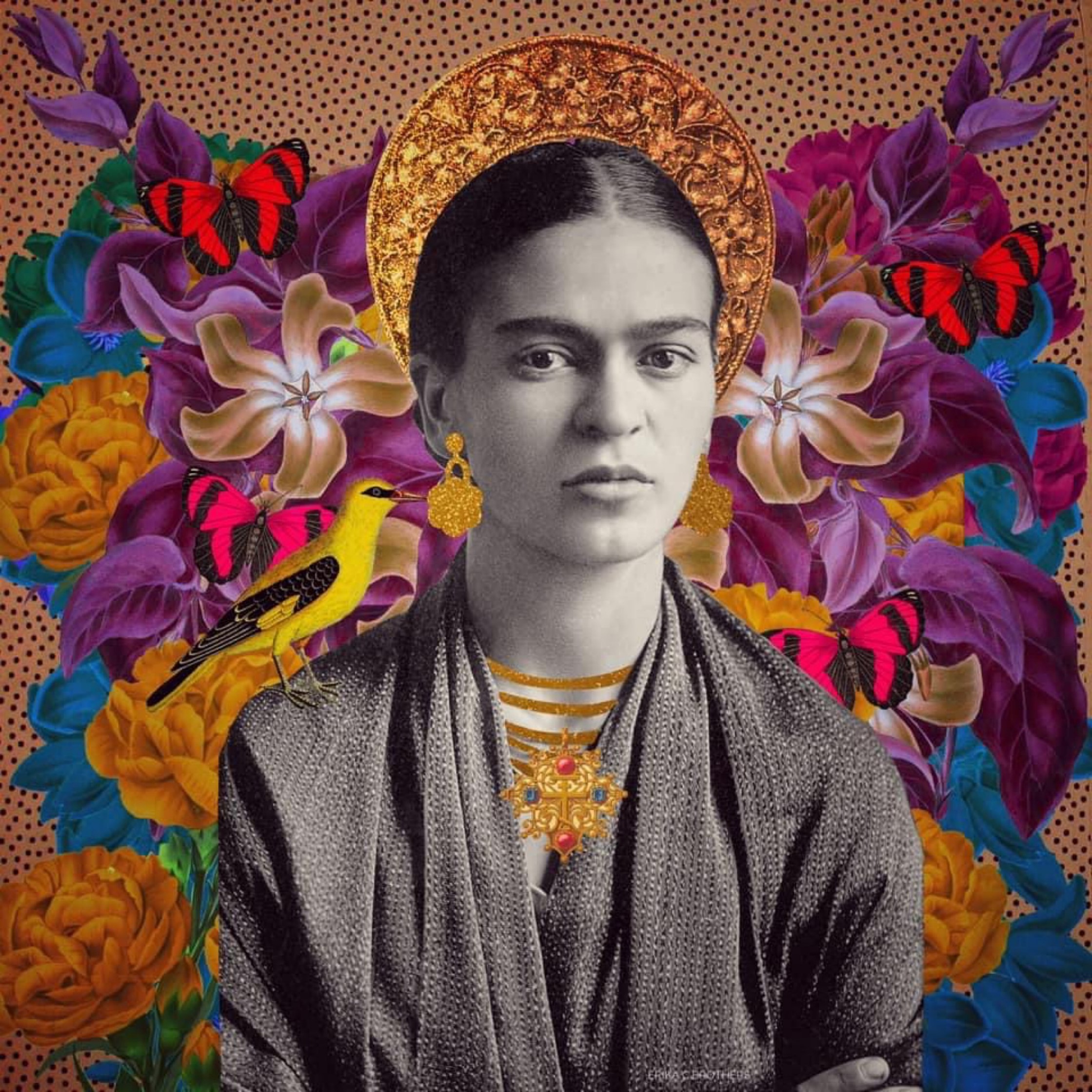 Surrounding the woman is an explosion of color and nature-inspired elements that create a striking contrast with the monochrome portrait. The background is adorned with a plethora of brightly colored flowers in various shades of yellow, purple, and pink. These flowers are intricately detailed, with petals and leaves that seem almost lifelike, providing a lush and vibrant frame around the woman’s face. Interspersed among the flowers are butterflies, their wings adorned with vivid patterns of red and black, adding a sense of movement and liveliness to the composition.