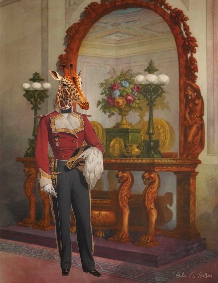 The image is a stunning example of surreal and imaginative illustration, blending elements of classic portraiture and natural history to create a whimsical and thought-provoking scene. At the center of the image is an anthropomorphic giraffe, dressed in an ornate, formal military uniform, standing against an opulent and richly detailed background.