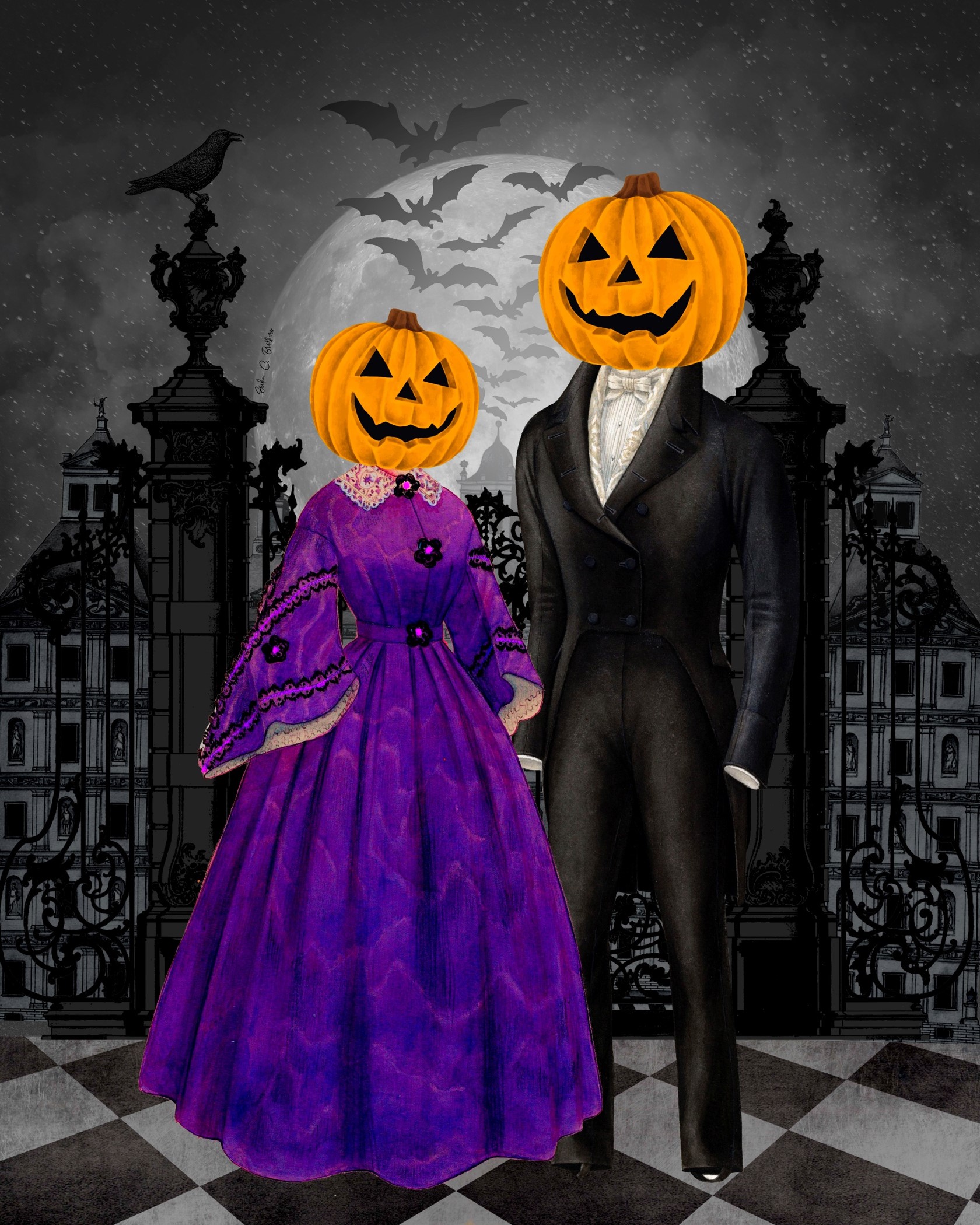 This artwork evokes themes of Halloween, gothic romance, and the blending of the surreal with the historical. The jack-o’-lantern heads symbolize the playful and spooky spirit of Halloween, while the Victorian attire and gothic setting create a sense of timelessness and elegance. The attention to detail in the costumes, background, and lighting showcases the artist’s skill and creativity, creating a cohesive and visually engaging scene.