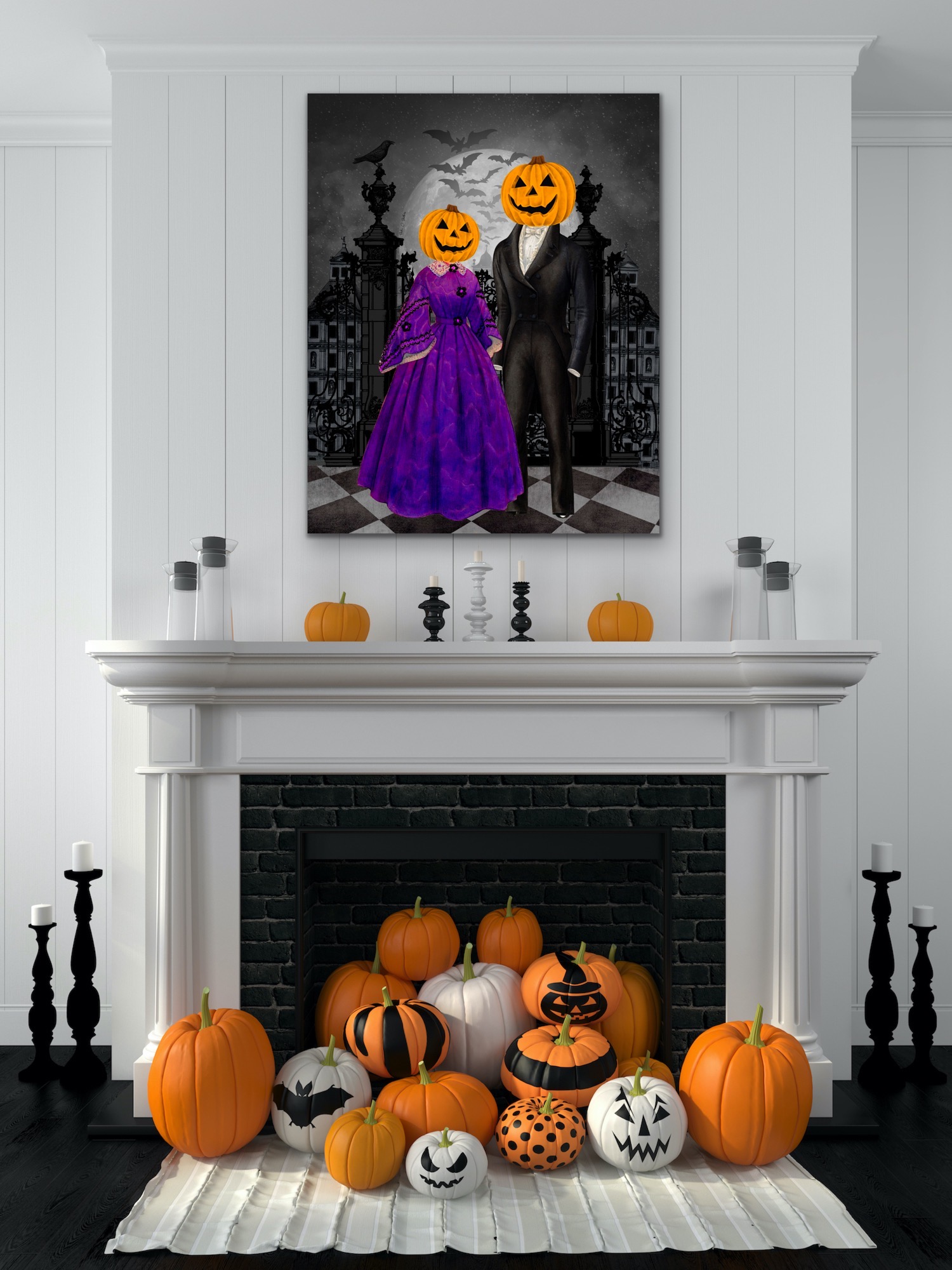 The image presents a surreal and eerie Halloween-themed portrait featuring an elegantly dressed couple with jack-o’-lanterns for heads. The combination of historical attire, gothic elements, and the iconic pumpkin heads creates a visually striking and imaginative scene.