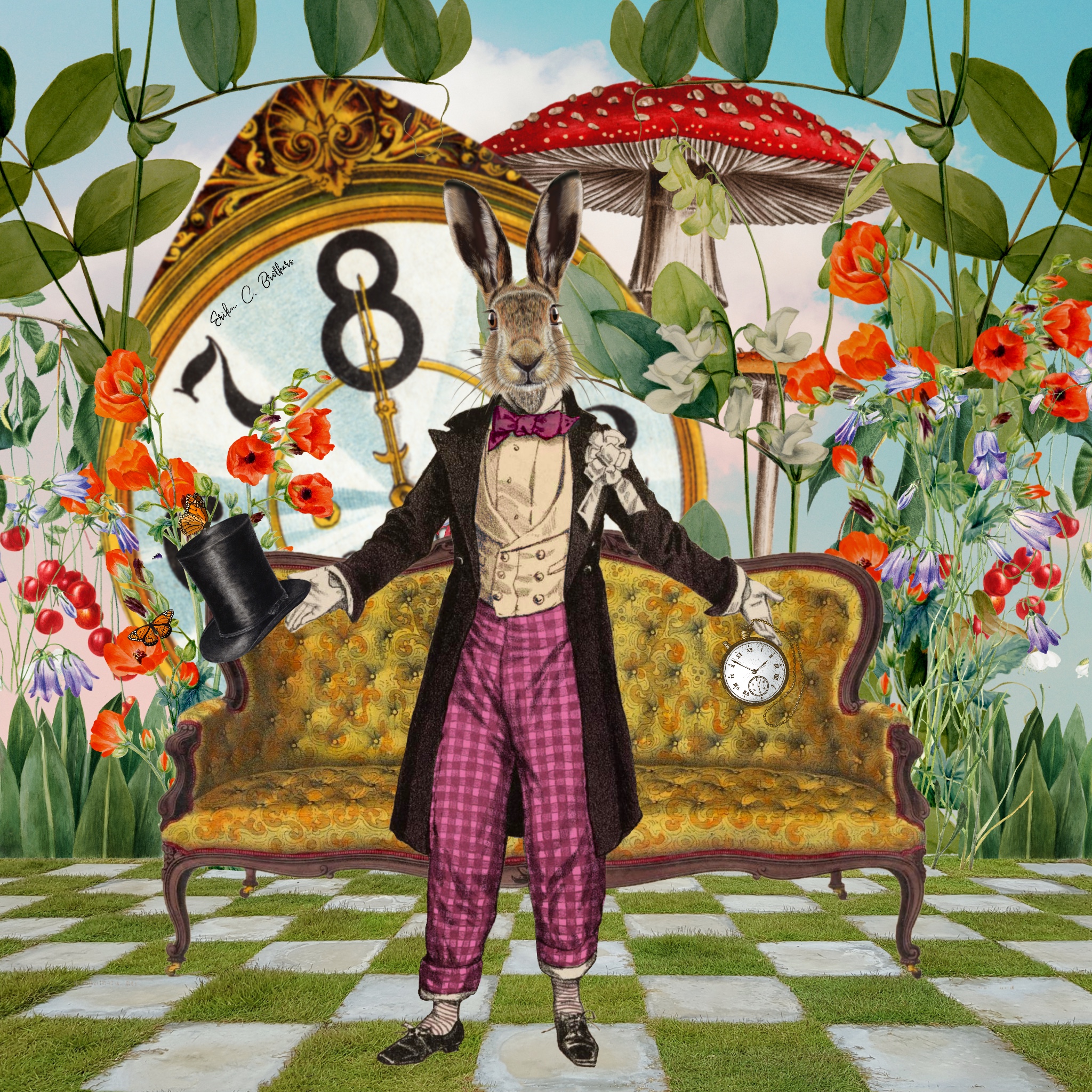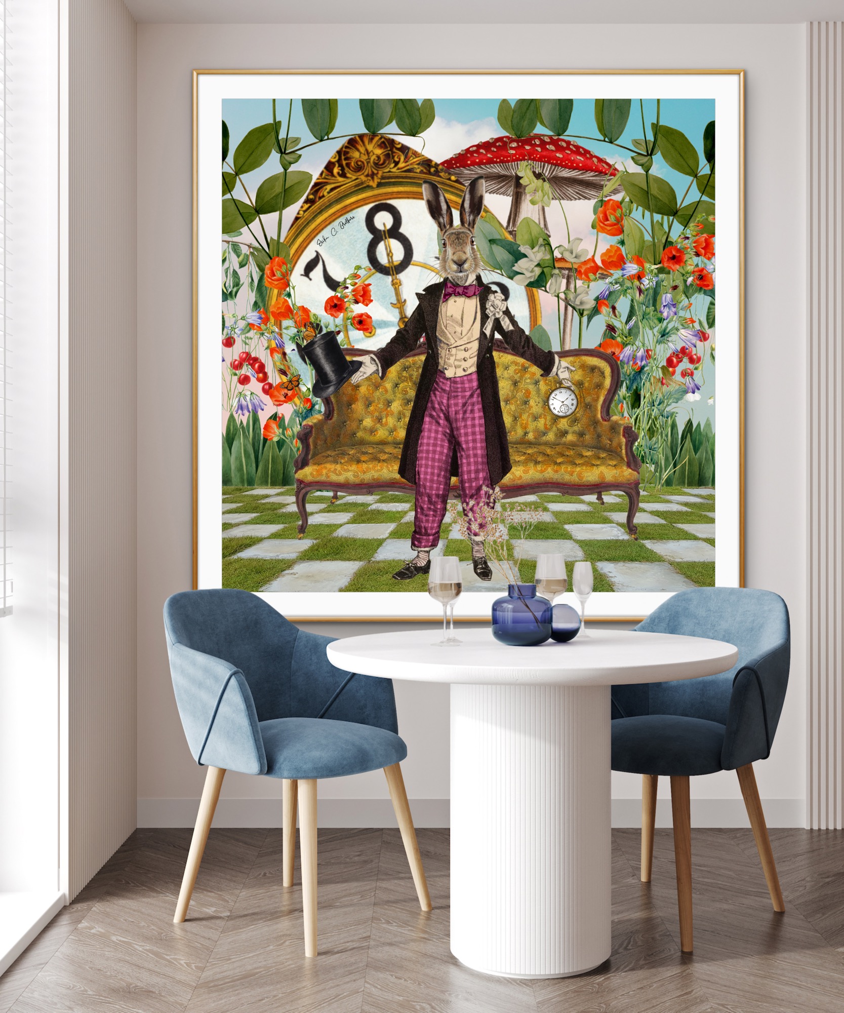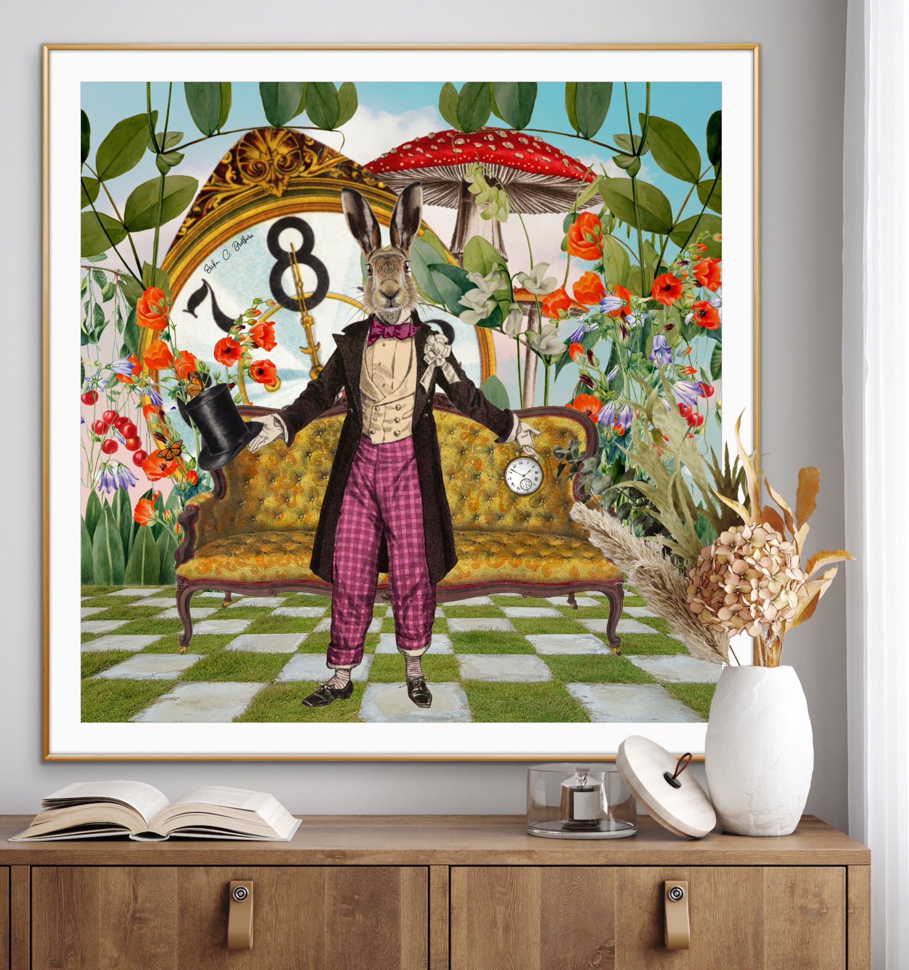 Behind the hare is an ornate, golden vintage clock, almost as tall as the hare itself, its face showing the time perpetually stuck at eight o’clock. The large, exaggerated clock hands add to the surreal quality of the image, emphasizing the whimsical and dreamlike atmosphere. The clock, partially obscured by large, red-capped mushrooms with white spots, enhances the fantastical setting and further connects to the Alice in Wonderland theme.