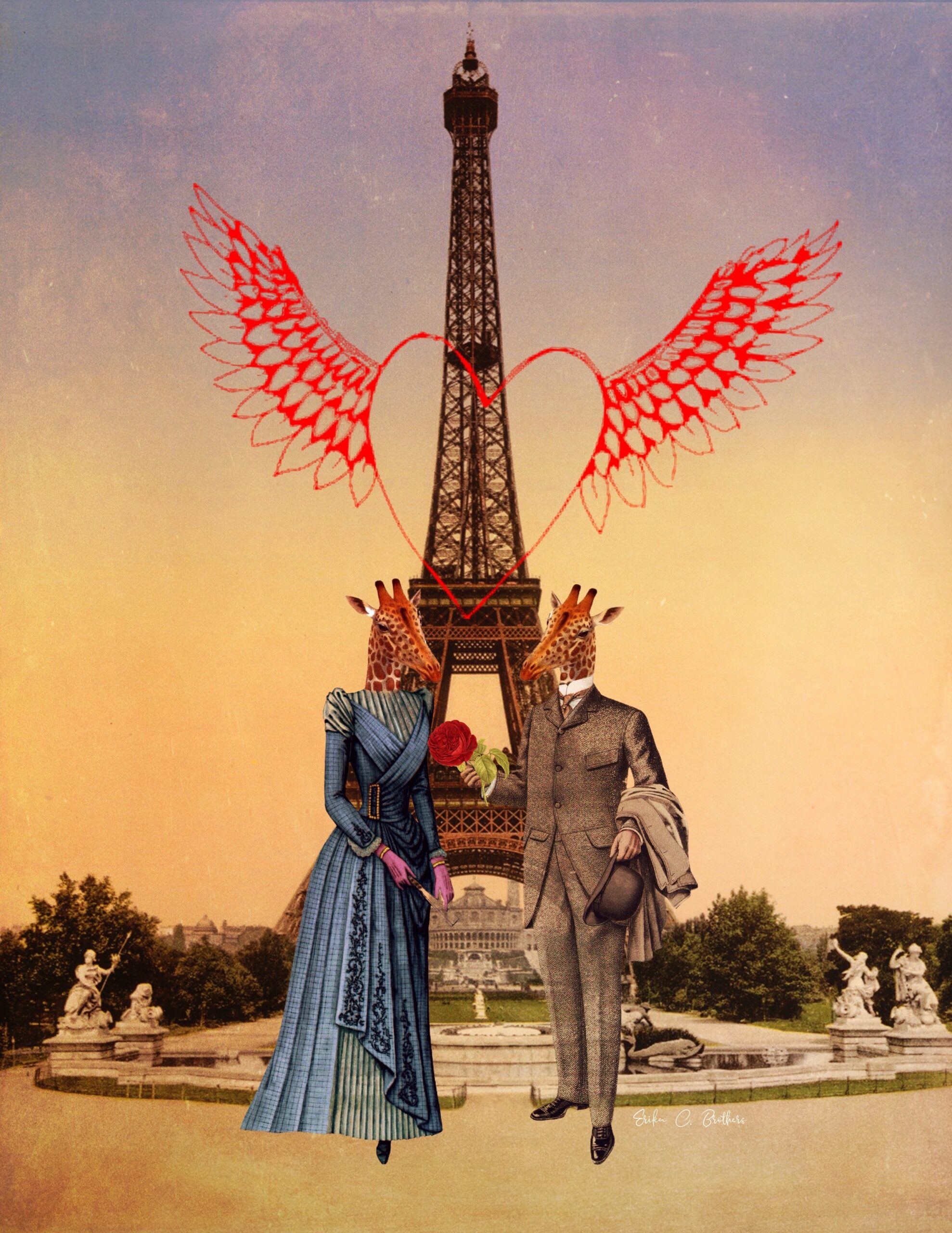 This image masterfully blends elements of history, fashion, fantasy, and romance, creating a unique and memorable piece of art. The Victorian attire and historical setting evoke nostalgia and elegance, while the giraffe heads and the heart with wings introduce a modern, playful twist. The combination of these elements invites the viewer to reflect on the enduring nature of love and the whimsical moments that make life enchanting.