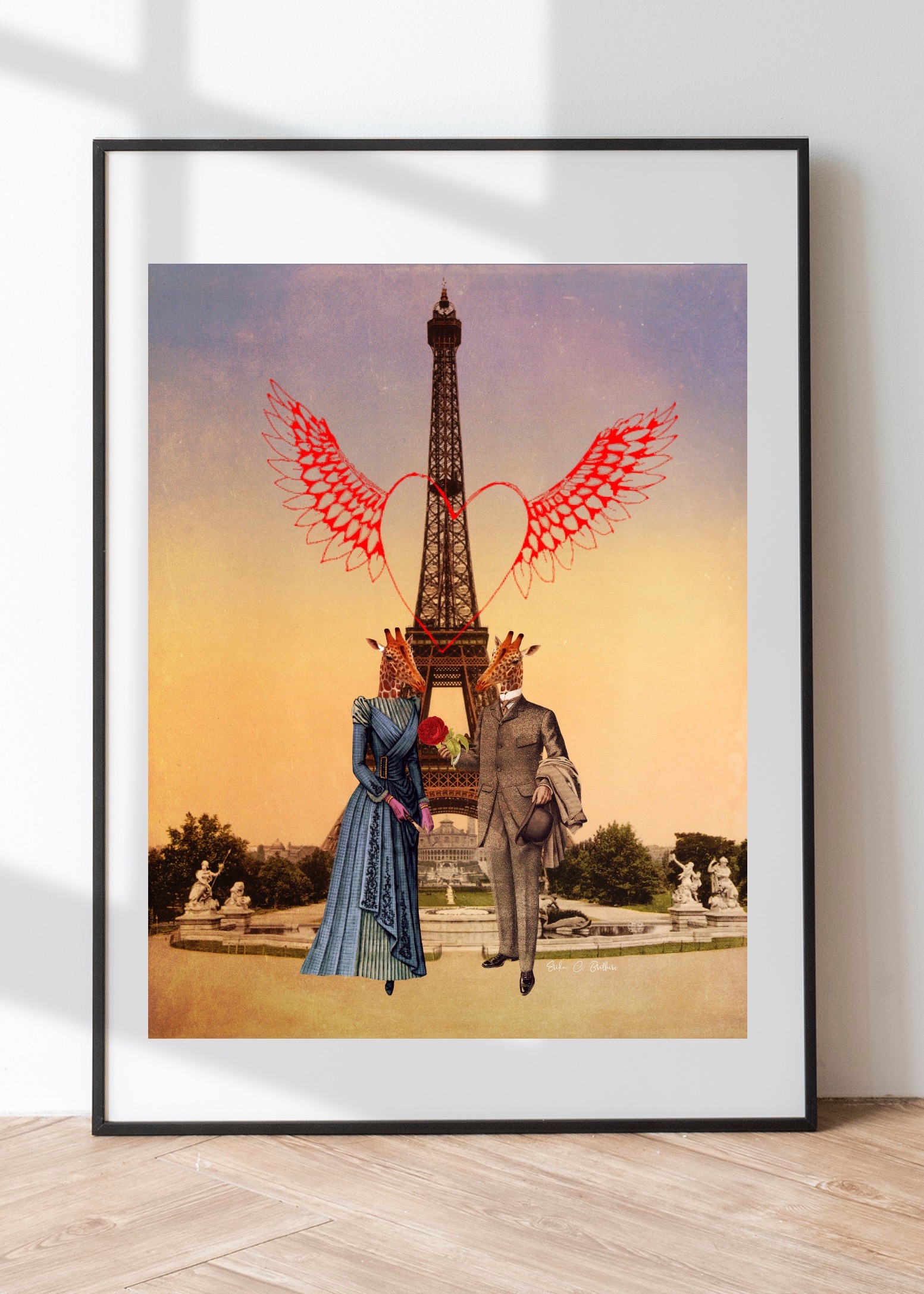 Above the figures, the Eiffel Tower is flanked by a pair of bright red wings that form the shape of a heart. These wings appear almost like an ethereal drawing, hovering in the sky and enhancing the romantic atmosphere of the scene. The red heart with wings symbolizes a love that is both grounded and capable of soaring to great heights, much like the love stories that Paris is known for. The heart serves as a focal point, drawing the viewer’s gaze upwards and reinforcing the theme of romance.