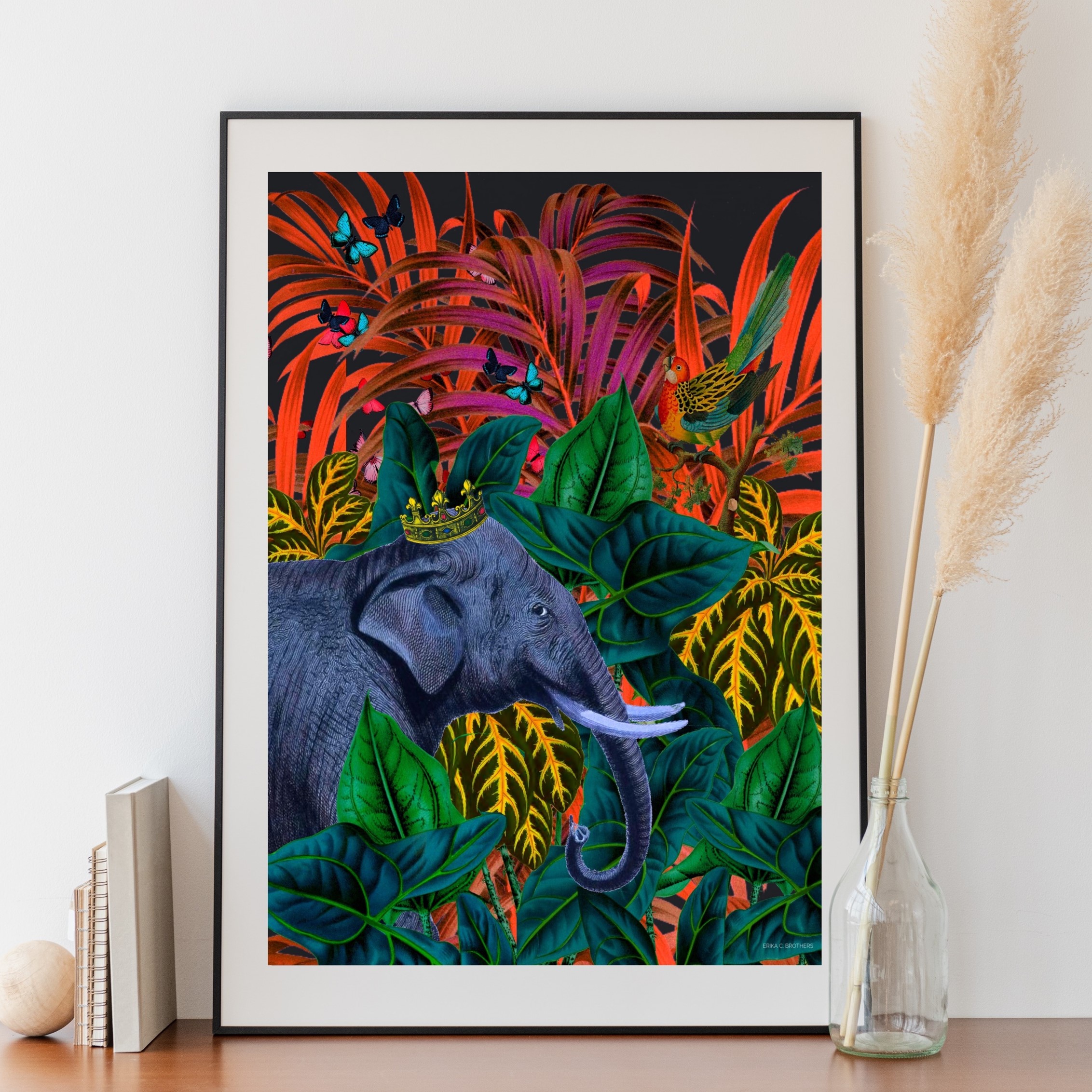 The image evokes themes of majesty, harmony, and the vibrant beauty of nature. The crowned elephant stands as a symbol of strength and nobility, surrounded by a thriving ecosystem that celebrates the diversity and wonder of the natural world. The whimsical elements, such as the colorful butterflies and the exotic bird, add a touch of fantasy and enchantment, suggesting that this jungle is a place of magic and possibility.