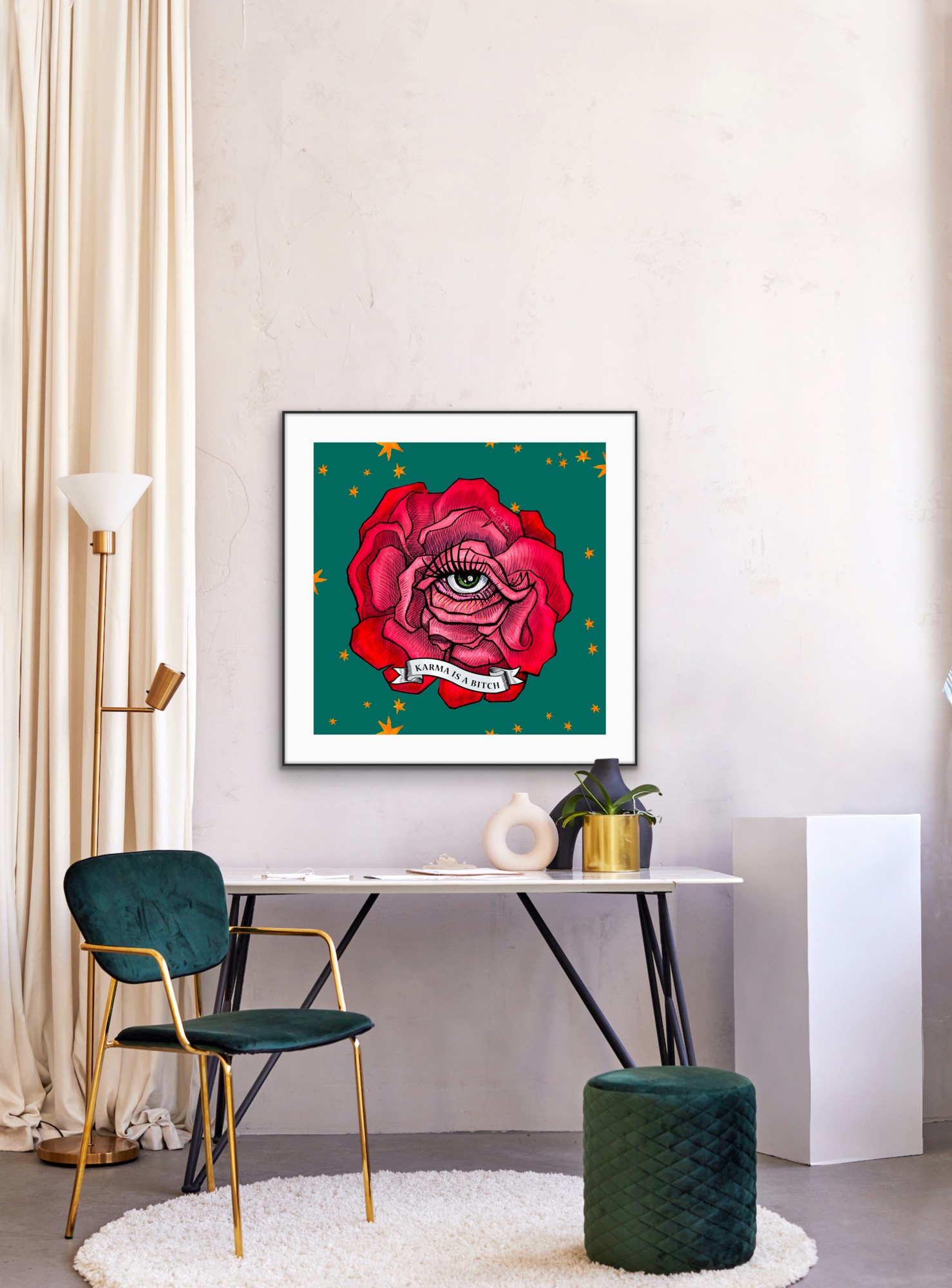 The phrase “KARMA IS A BITCH” adds a layer of meaning to the image, suggesting themes of justice, retribution, and the inevitable consequences of one’s actions. Combined with the eye embedded in the rose, this message implies a watchful presence, perhaps suggesting that karma is always observing and ready to deliver its verdict. The eye, often associated with perception, awareness, and truth, reinforces this idea, making the viewer consider the moral implications of their actions.