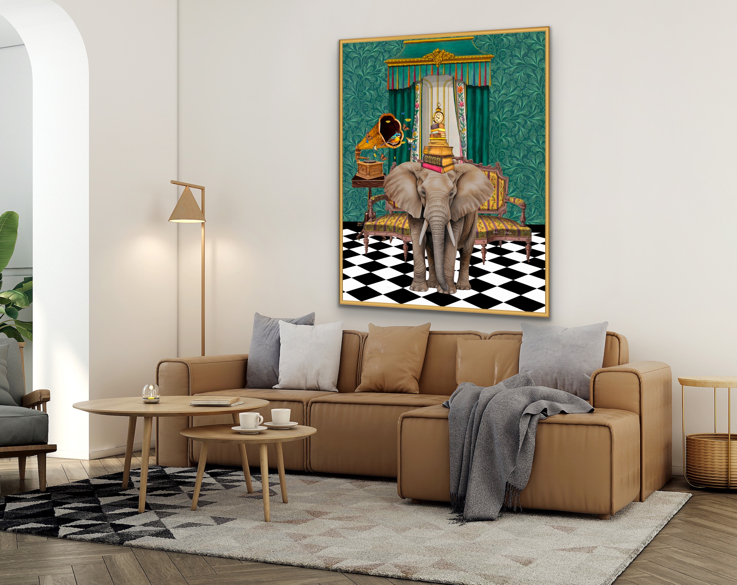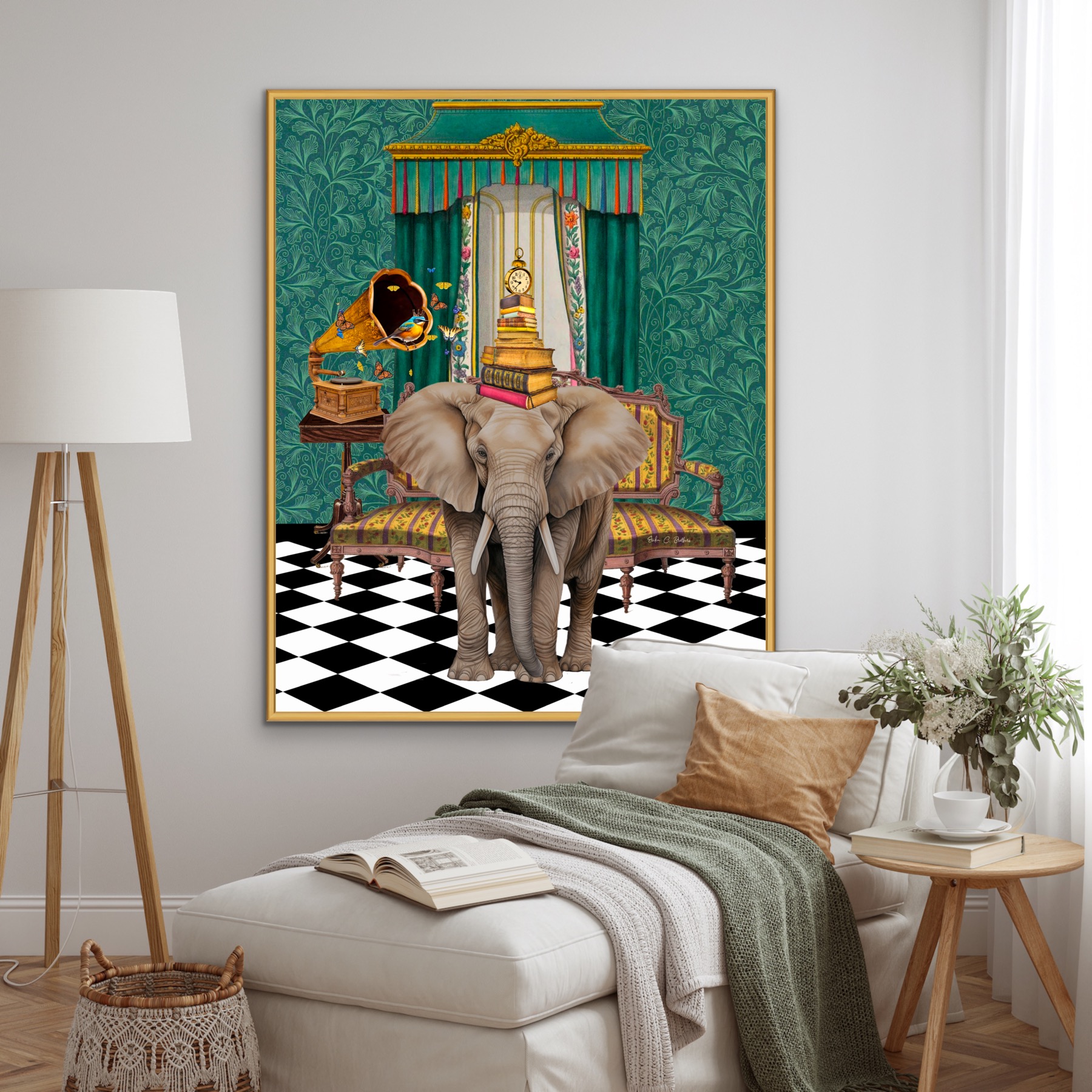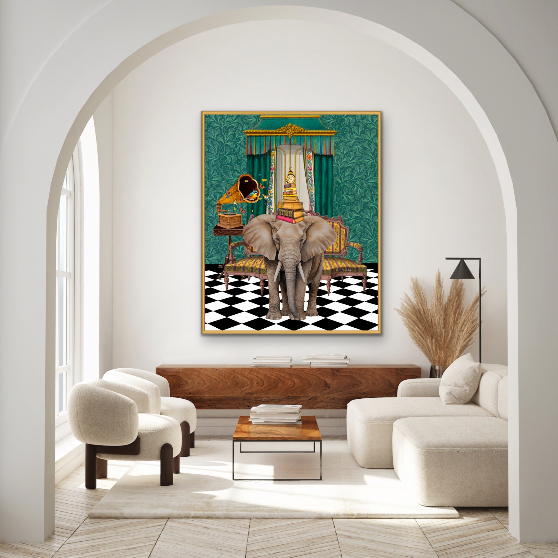 In this surreal and whimsical image, we are presented with a fascinating scene that blends elements of fantasy, elegance, and nostalgia. The central figure is a majestic elephant, standing prominently in the middle of a richly decorated room. The elephant, with its realistic and detailed depiction, brings a sense of grandeur and power to the scene.