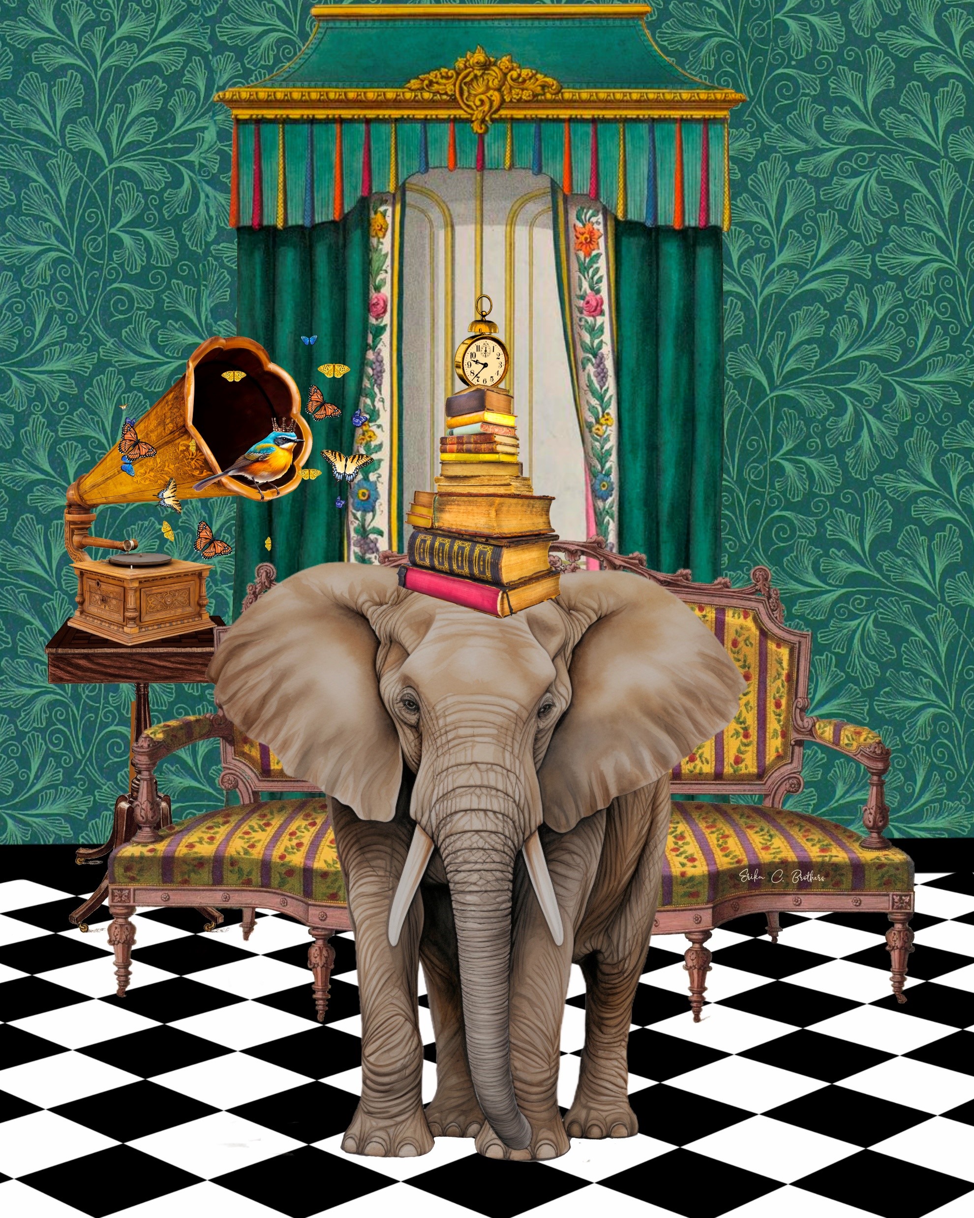 The elephant’s head is adorned with a stack of books, each varying in size and color, which balances precariously. This unusual and imaginative touch suggests themes of knowledge, wisdom, and perhaps the burdens of intellectual pursuit. The stack of books is topped with an old-fashioned pocket watch, emphasizing the passage of time and the importance of learning and knowledge through the ages.