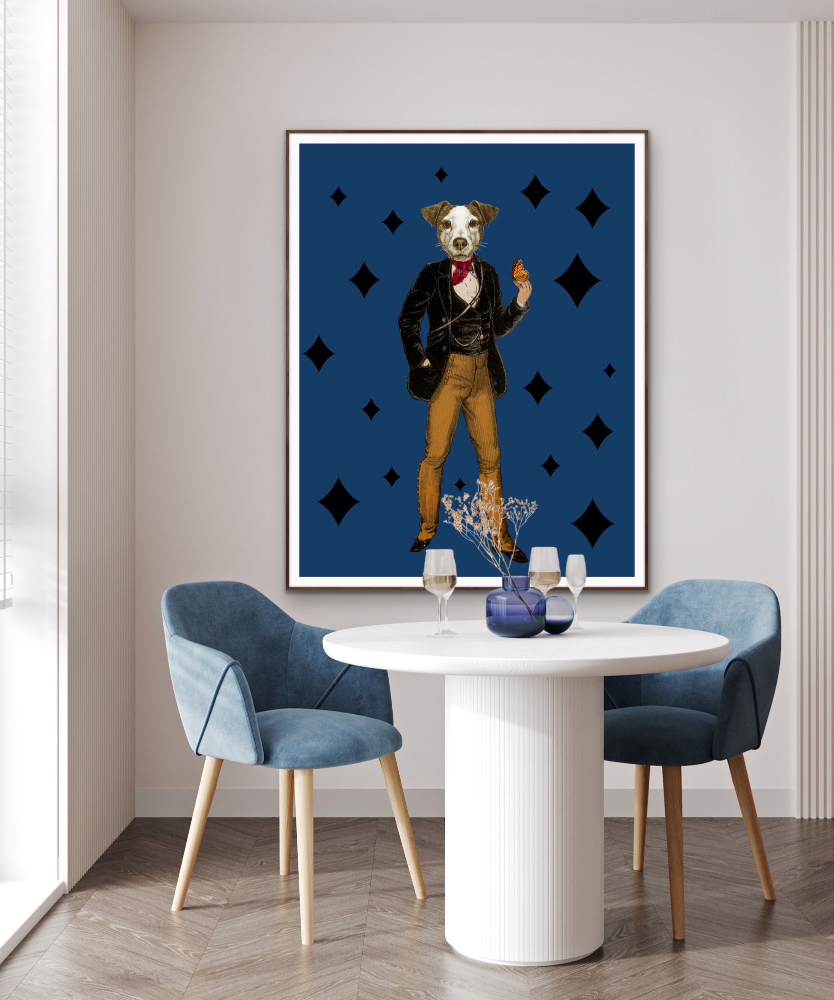 The image features a surreal and captivating portrait of an anthropomorphic dog dressed in elegant, vintage-style attire, set against a striking blue background adorned with black diamond-shaped patterns. The whimsical blend of human and animal characteristics, combined with historical fashion elements, creates a visually engaging and imaginative composition.
