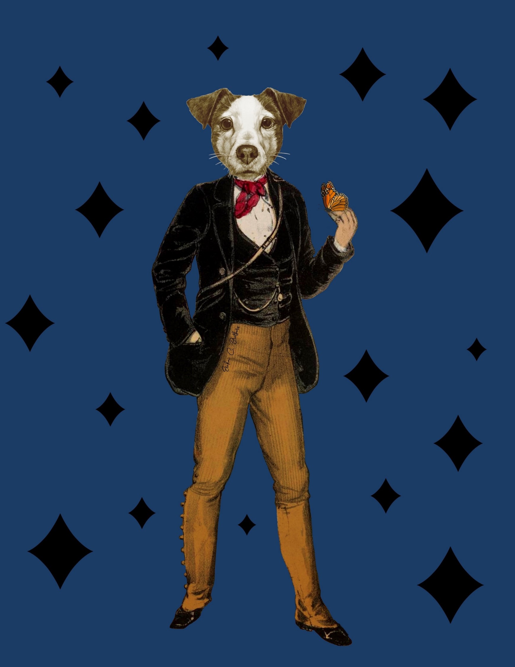 The lower half of the dog’s outfit consists of mustard-yellow trousers, tailored to fit perfectly and ending just above polished black shoes. The trousers are detailed with vertical stripes, adding a subtle texture to the garment and enhancing the overall vintage aesthetic. The dog’s posture is upright and confident, with one hand casually resting in the pocket and the other holding a delicate monarch butterfly.