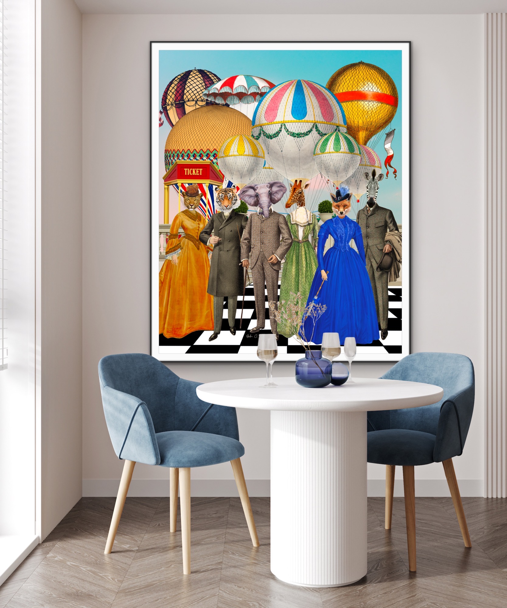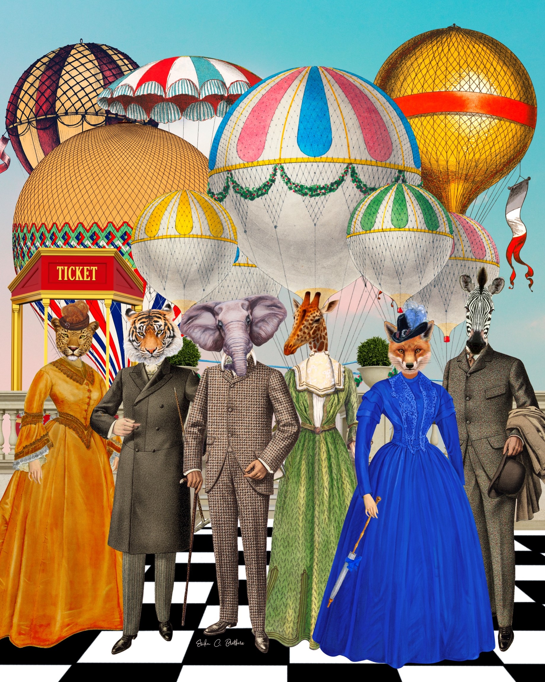 This artwork evokes themes of celebration, adventure, and the blending of different realms. The anthropomorphic portrayal of the animals, with their combination of natural grace and cultivated sophistication, challenges conventional perceptions of identity and elegance. The use of vintage attire and a vibrant festival setting adds a layer of historical charm, suggesting a timeless celebration of life and joy.