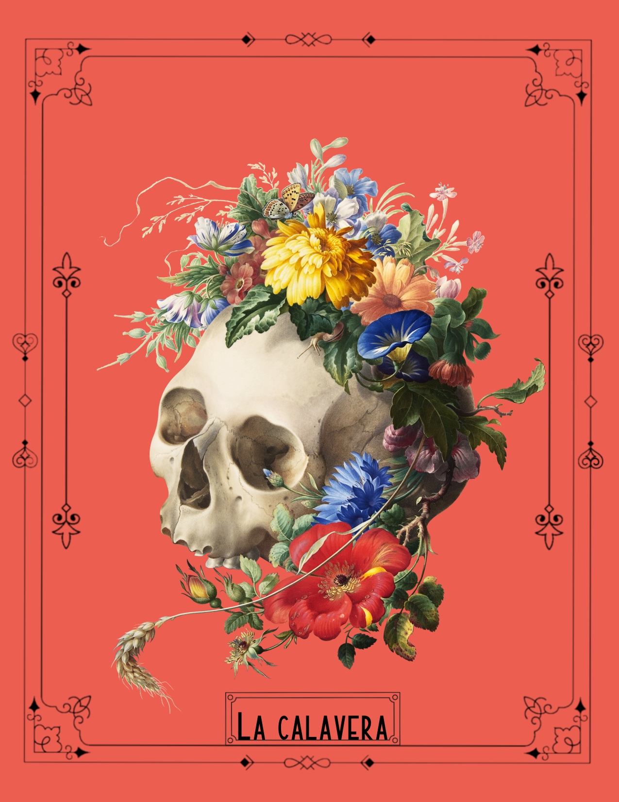 This captivating image is titled “La Calavera,” which translates to “The Skull” in English. The artwork masterfully blends elements of mortality and beauty, creating a striking visual contrast that is both thought-provoking and aesthetically pleasing.