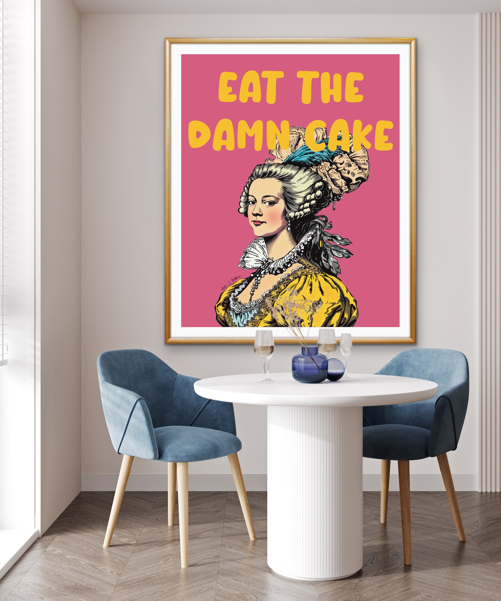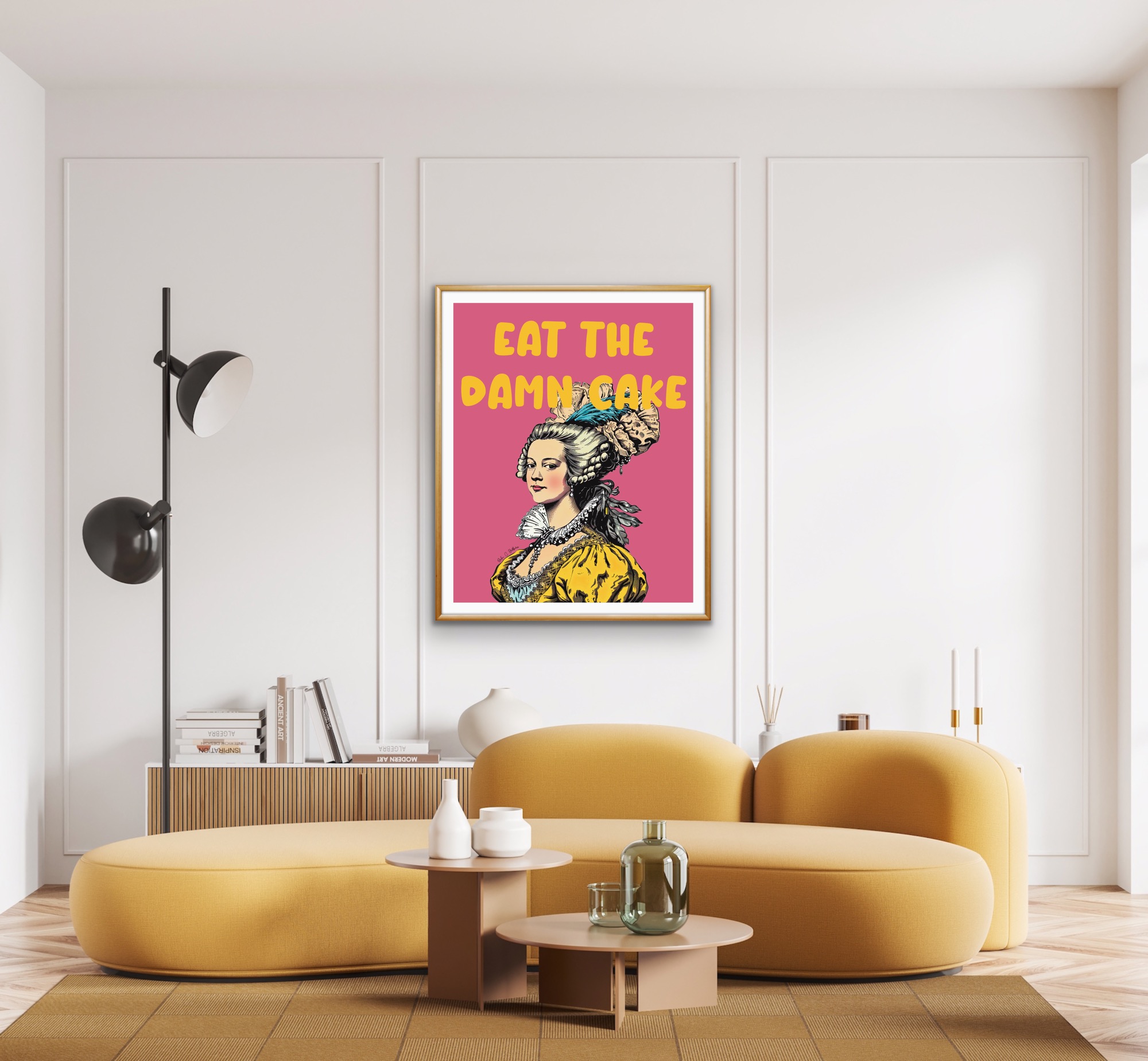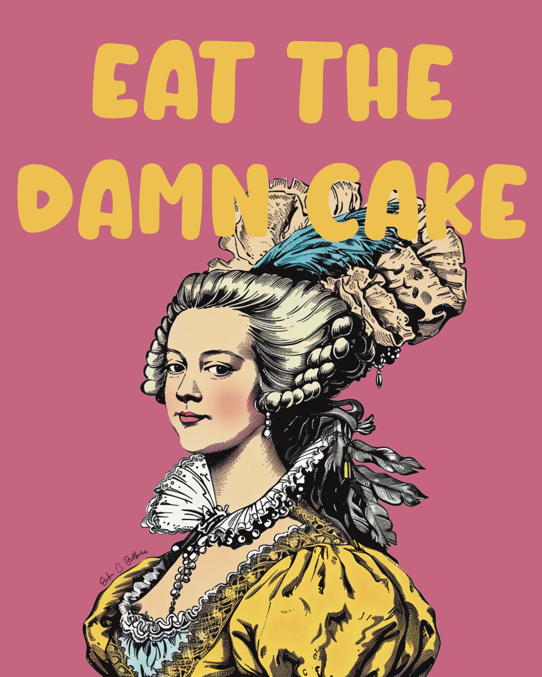 Contrasting sharply with the historical elegance of her image is the modern, bold text that overlays the portrait. The text reads “EAT THE DAMN CAKE” in large, playful letters that are colored in a warm, inviting yellow. The font is chunky and casual, creating a stark contrast to the formal portrait beneath. This juxtaposition of styles immediately catches the viewer’s eye and adds a humorous, contemporary twist to the image.