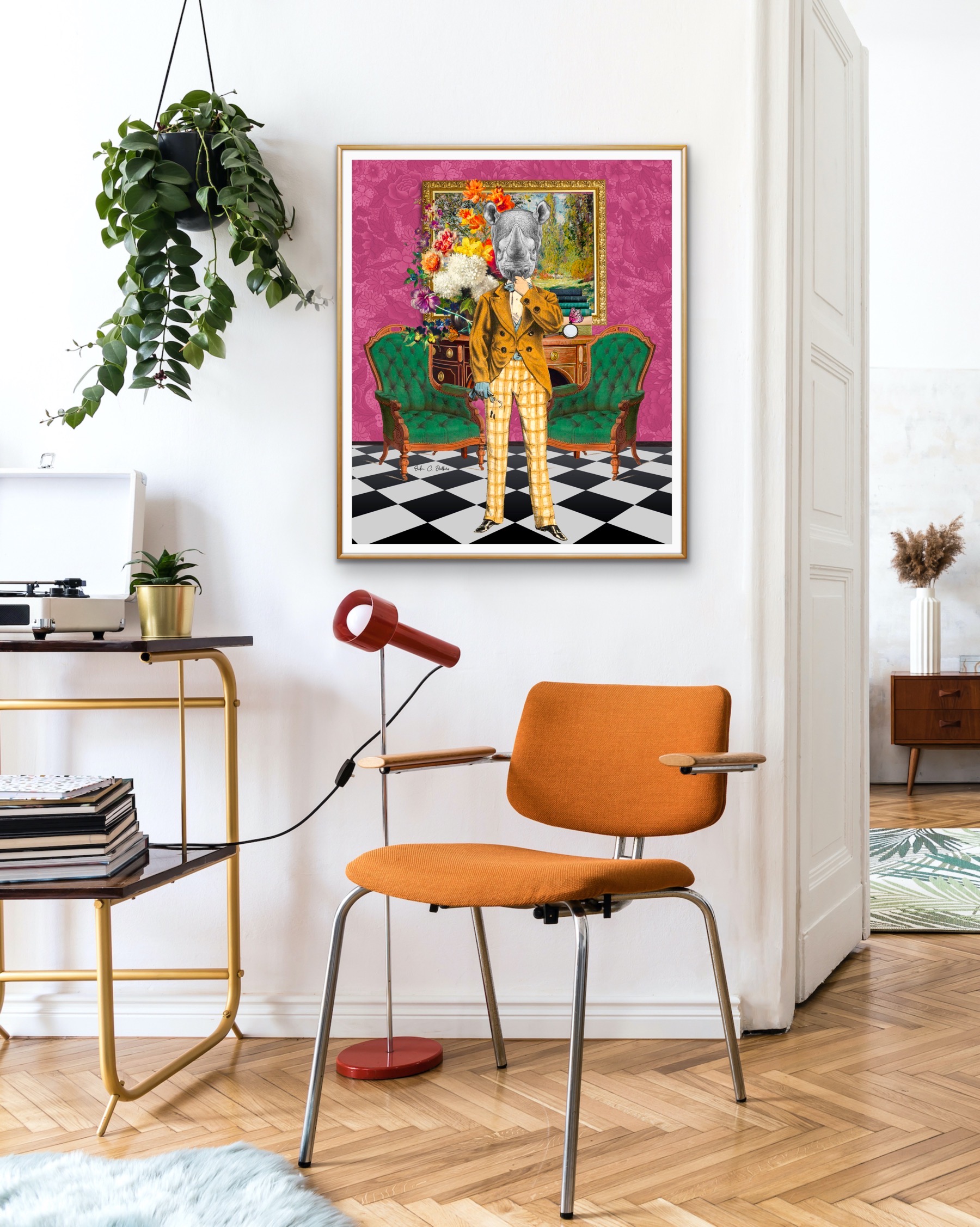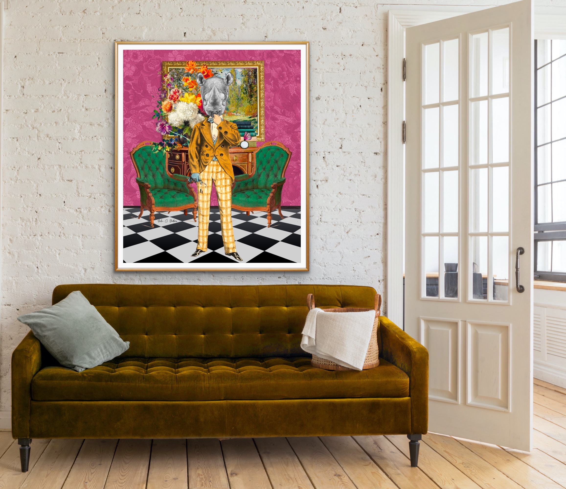 This artwork evokes themes of nobility, elegance, and the blending of different realms. The anthropomorphic portrayal of the rhinoceros, with its combination of natural strength and refined sophistication, challenges conventional perceptions of identity and elegance. The use of vintage attire and a richly detailed interior setting adds a layer of historical context, suggesting a timeless elegance that transcends the ordinary.