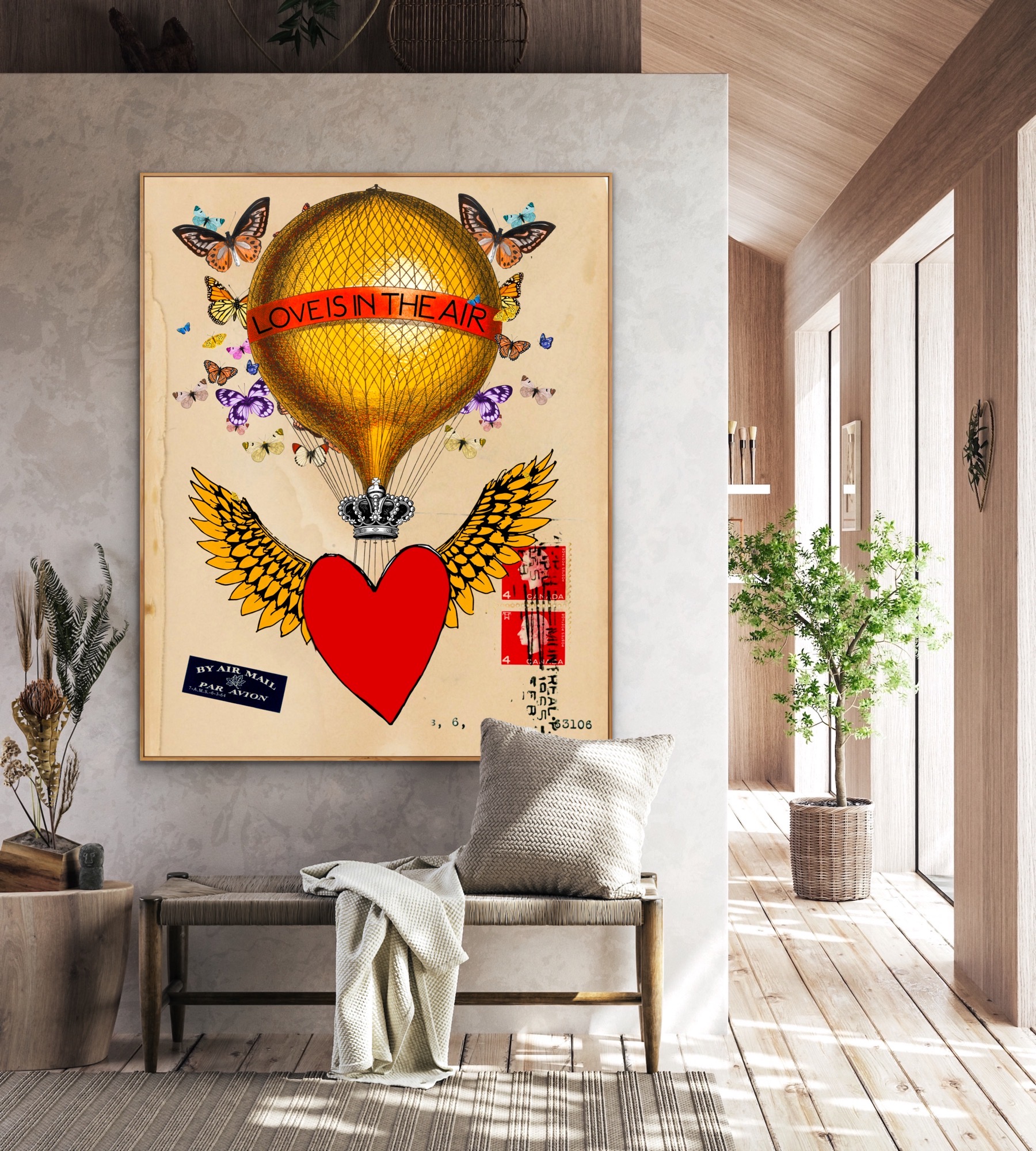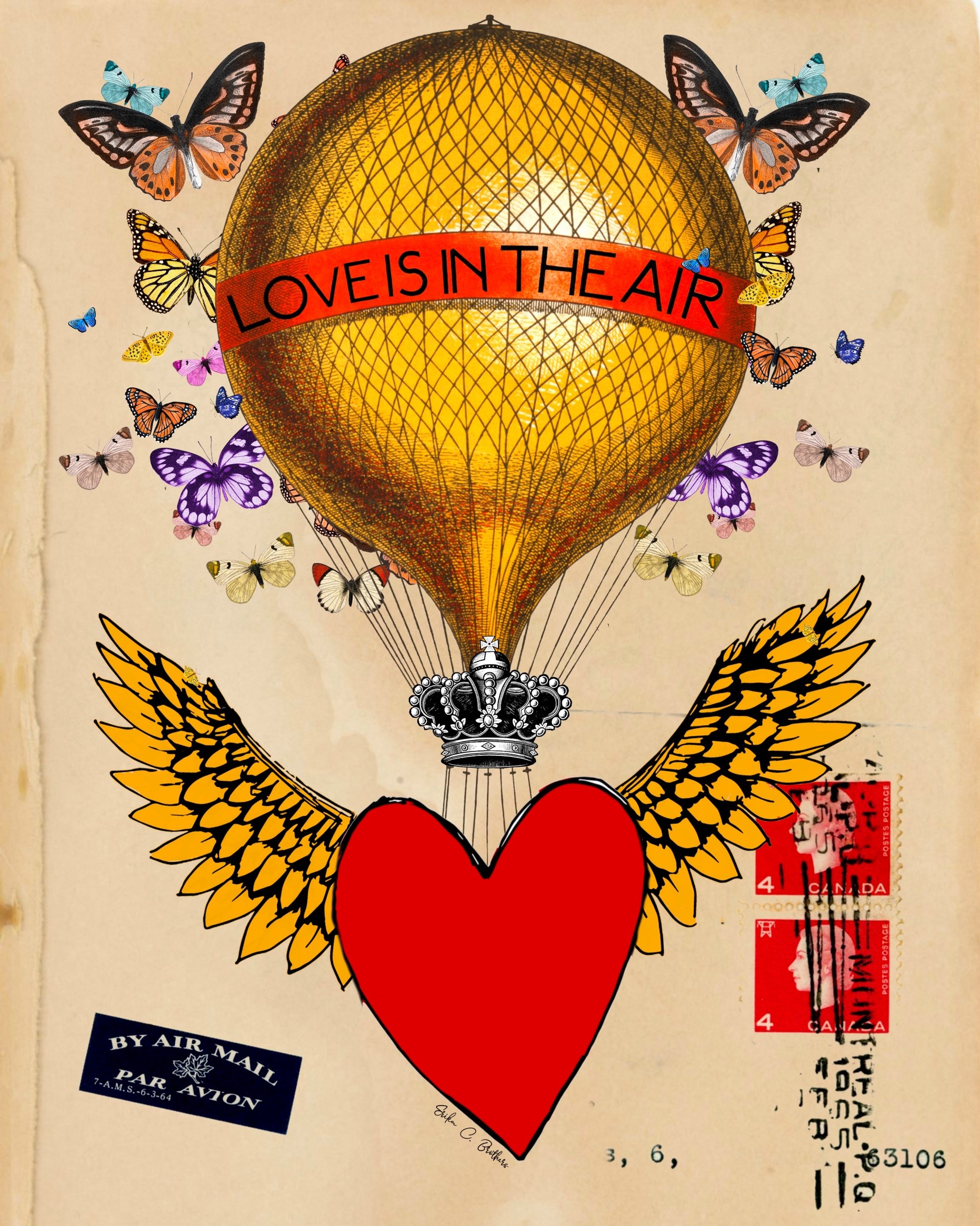 This artwork evokes themes of love, freedom, and the blending of different realms. The hot air balloon, with its symbolic heart and wings, represents the uplifting and transformative power of love. The vintage airmail elements add a layer of nostalgia and historical context, suggesting that love is timeless and universal.