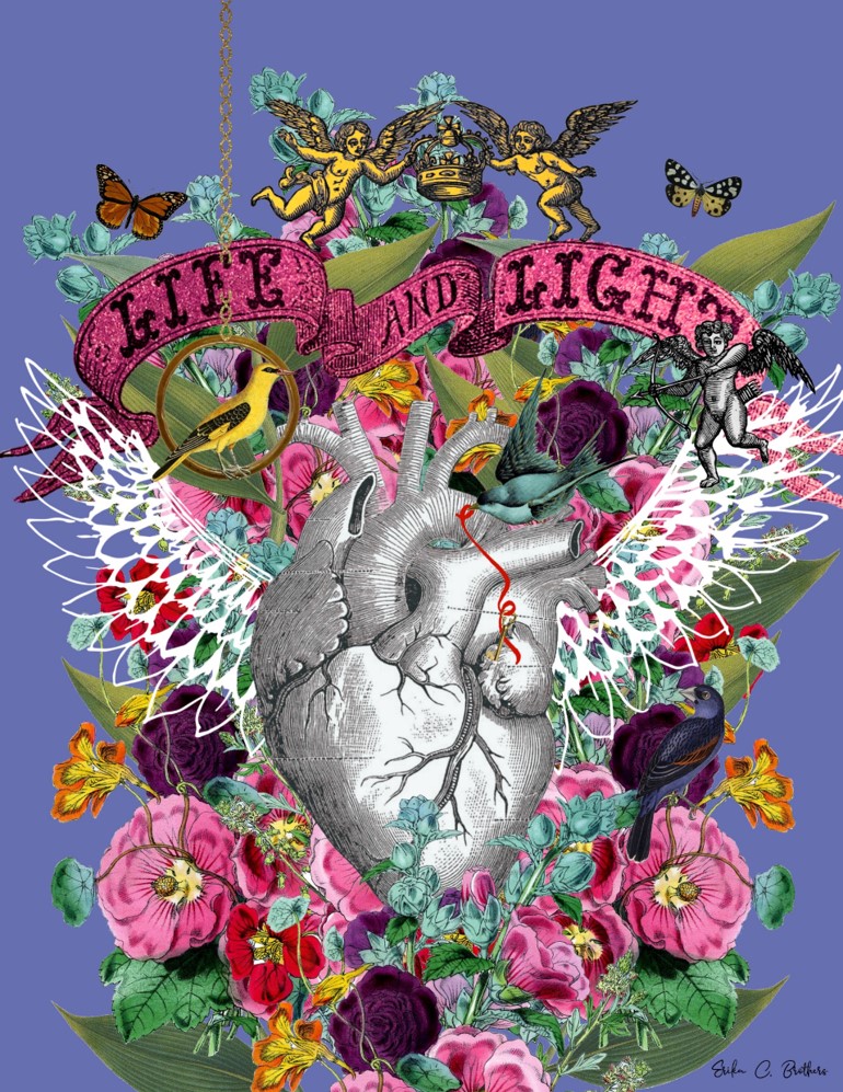 Above the heart, a banner unfurls with the words “Life and Light” written in an elegant, cursive script. The banner is a rich pink color, adorned with intricate designs and flanked by cherubic figures that add a touch of whimsy and fantasy to the scene. The phrase “Life and Light” serves as a central theme, encapsulating the essence of the illustration and its celebration of vitality, beauty, and the illumination that life brings.
