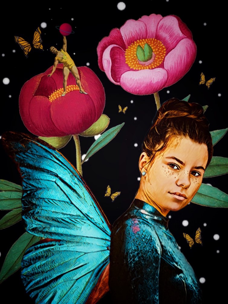 The image is a rich and imaginative blend of fantasy and realism, combining elements of nature with surreal and fantastical components to create a visually stunning and thought-provoking scene. At its center is a young woman with a determined and slightly wistful expression, adorned with a pair of vibrant, iridescent blue butterfly wings. The background features oversized, vividly colored flowers, and the entire composition is infused with a sense of magic and wonder.