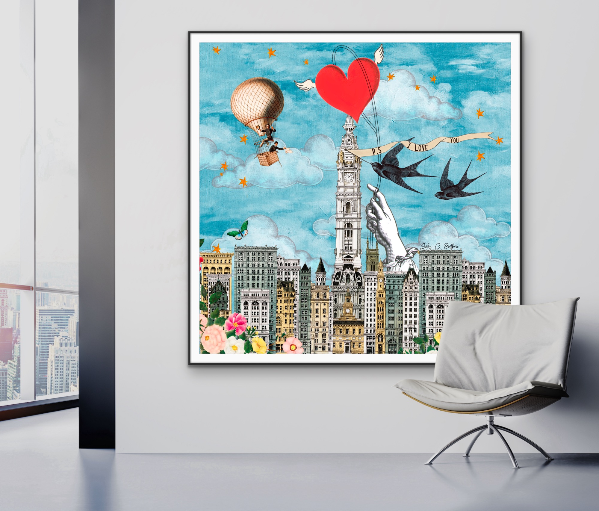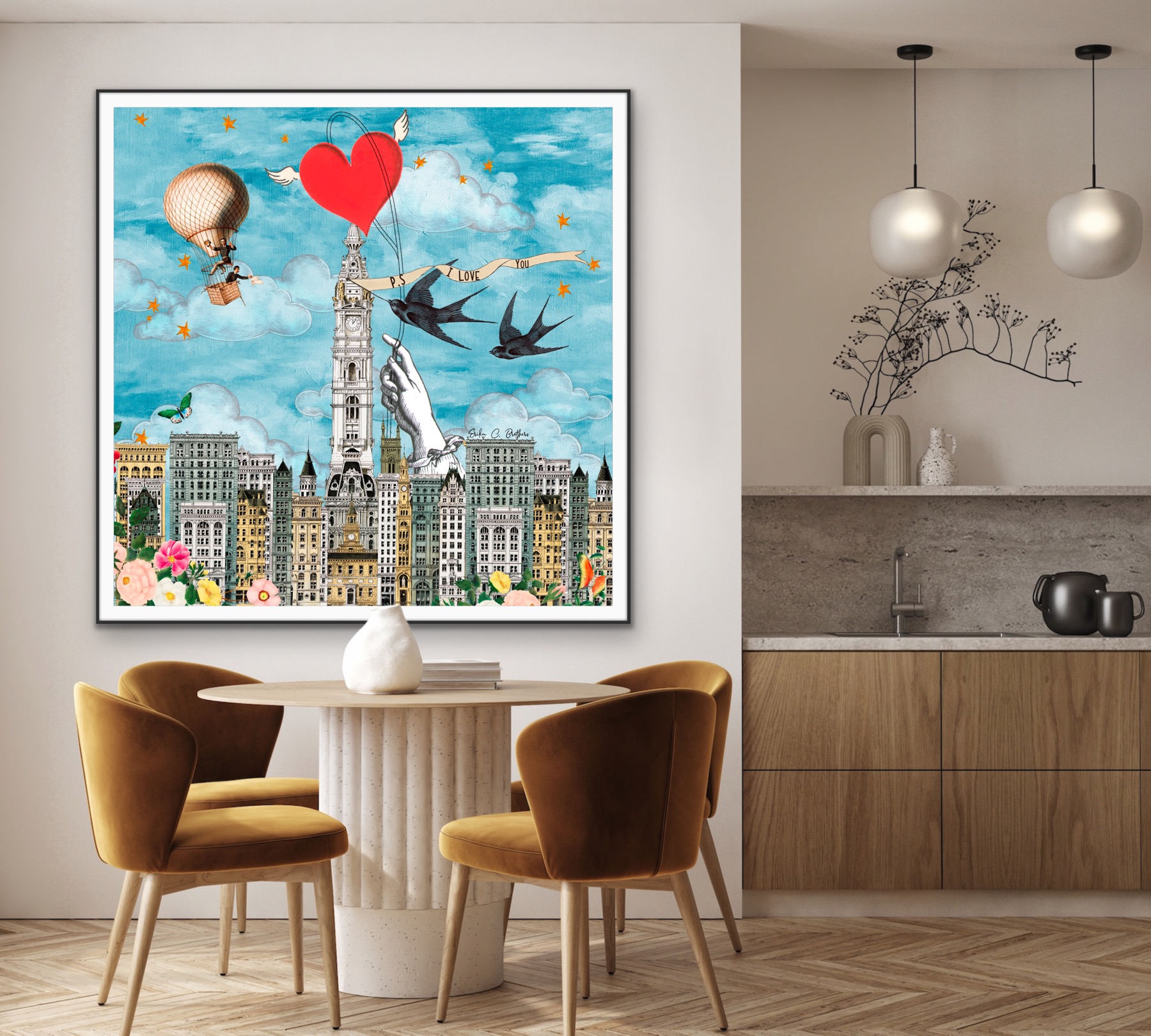 The overall color palette is vibrant and cheerful, with bold reds, soft blues, and bright greens. The detailed textures of the buildings, flowers, and the hot air balloon add depth and richness to the scene. The combination of whimsical elements, such as the winged heart and the swallows with the banner, with the detailed and realistic depiction of the cityscape, creates a harmonious blend of fantasy and reality.