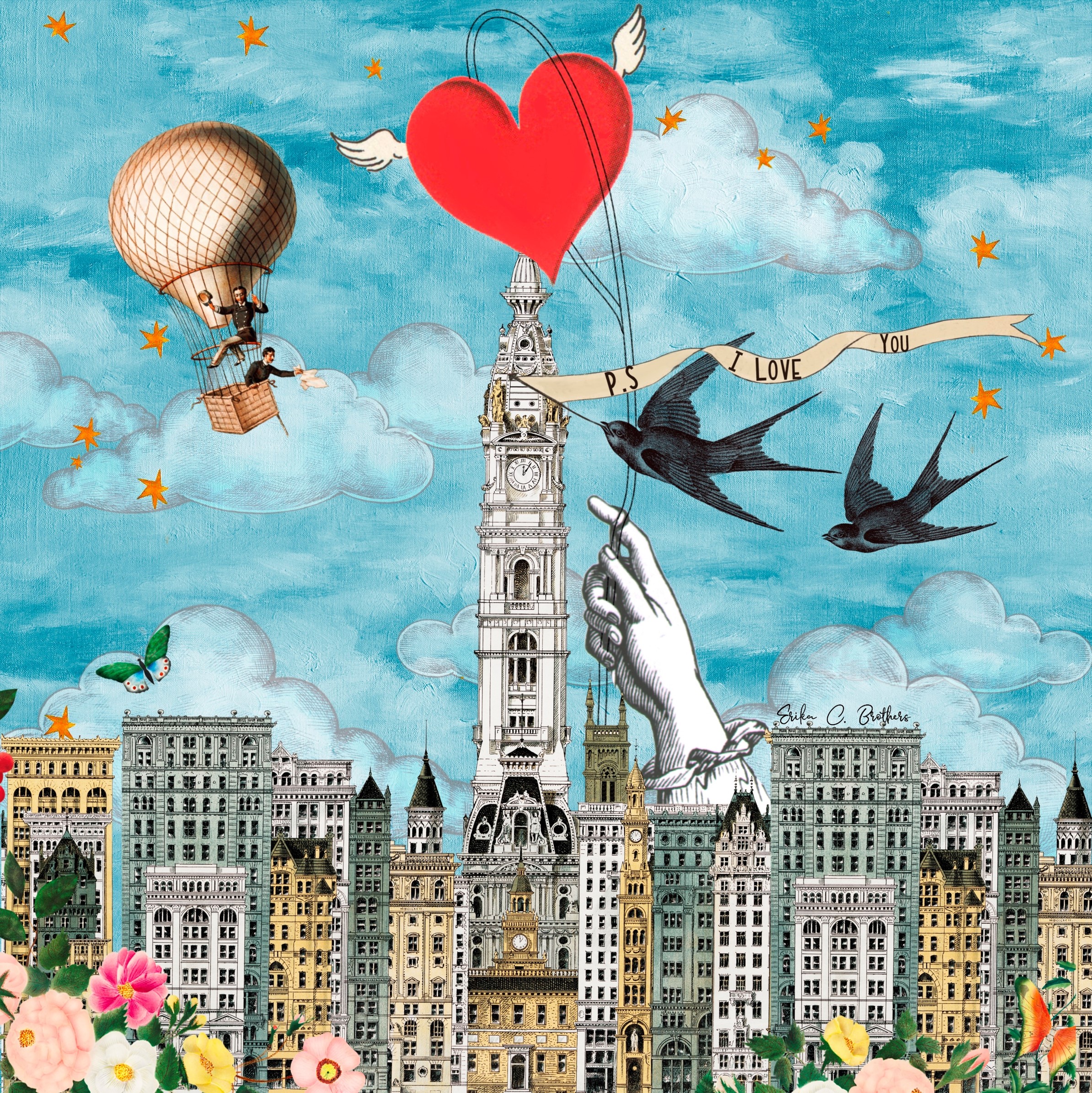 This vibrant and whimsical image depicts a fantastical urban scene imbued with themes of love and nostalgia. The central focus of the composition is a heart-shaped balloon, bright red and adorned with angelic wings, floating gently in the sky. The balloon is attached to a string held by an illustrated hand emerging from the bottom right of the image, symbolizing a connection to the sender of love.