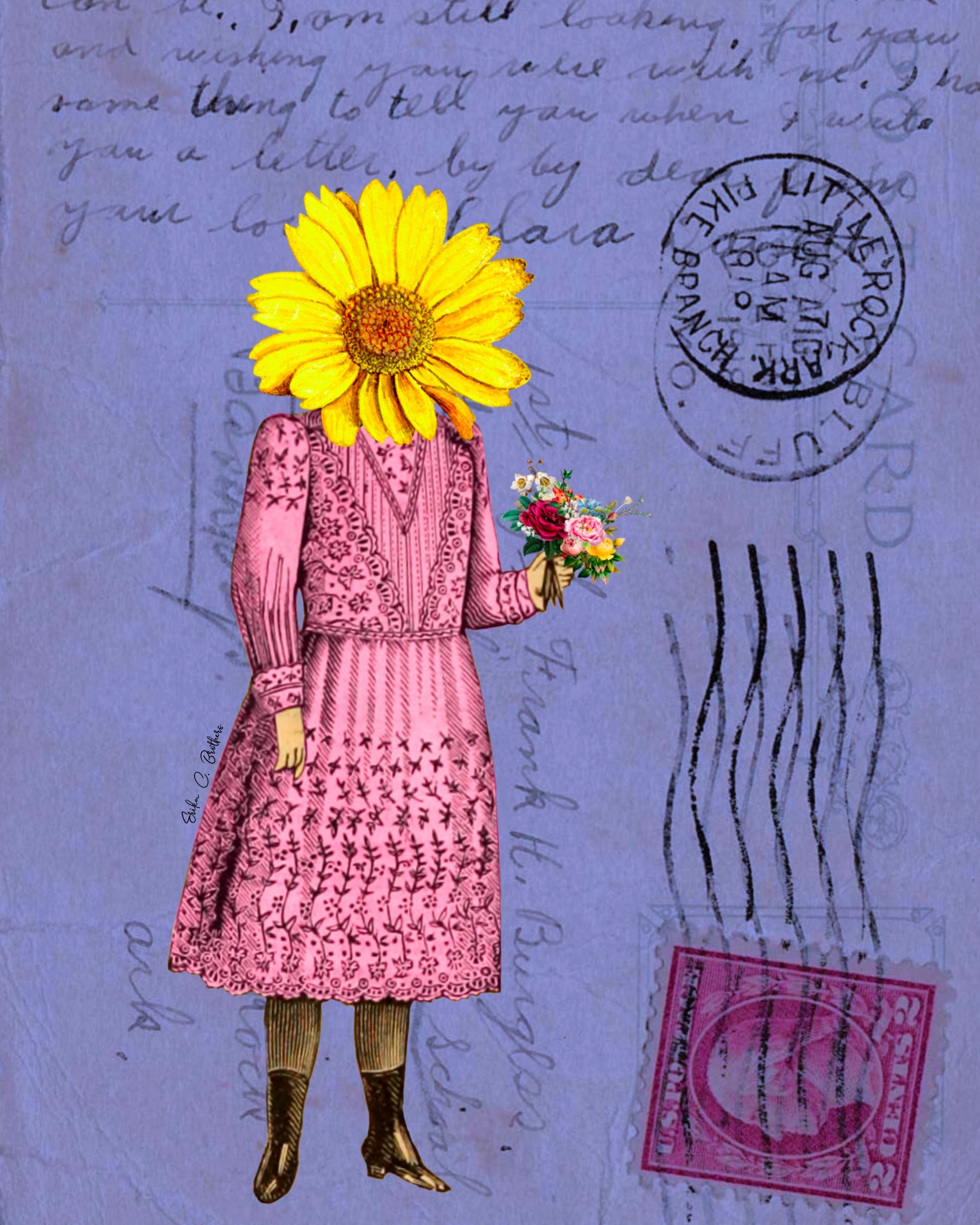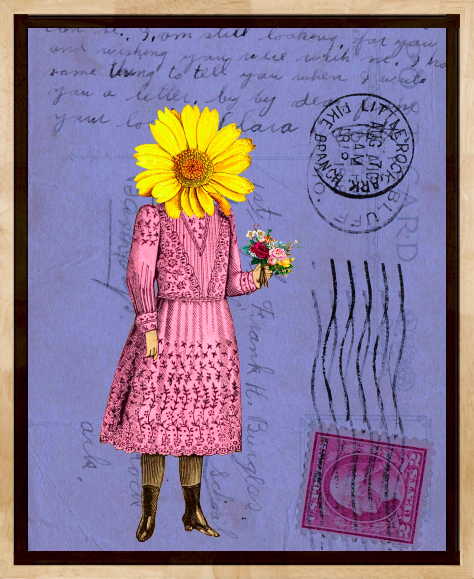 The image presents a whimsical and surreal scene featuring an anthropomorphic figure with a sunflower head, dressed in vintage clothing, standing against a background of a handwritten letter and postage marks. The blend of floral and human elements, along with historical attire and nostalgic background, creates a visually captivating and imaginative composition.