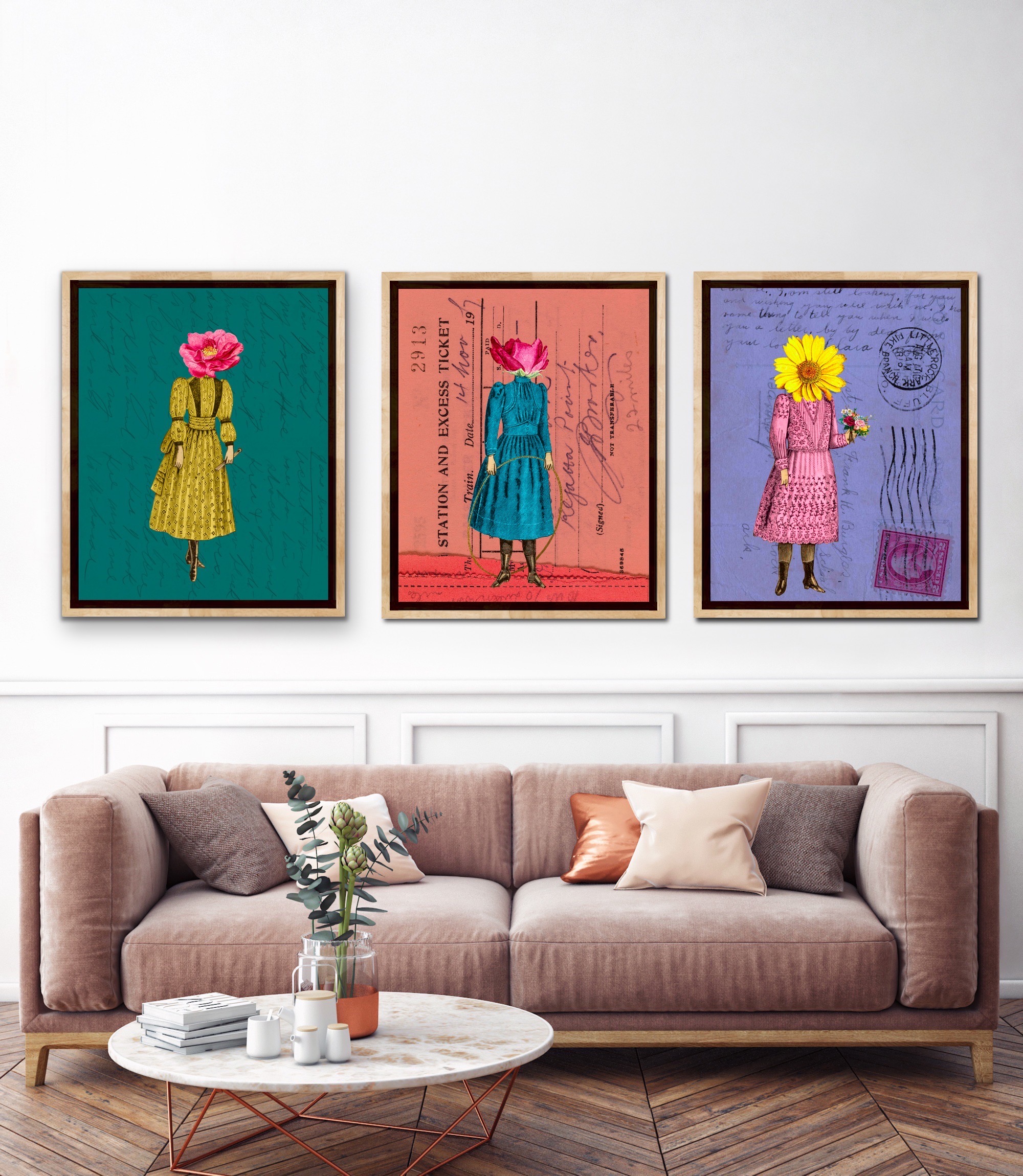 The combination of the sunflower head and vintage clothing evokes themes of nature, identity, and the passage of time. The sunflower, often associated with happiness and vitality, adds a layer of symbolism to the figure, suggesting a connection to natural beauty and the joy of life. The Victorian dress, with its historical connotations, contrasts with the modern surrealism of the flower head, creating a dialogue between the past and the present, tradition and imagination.
