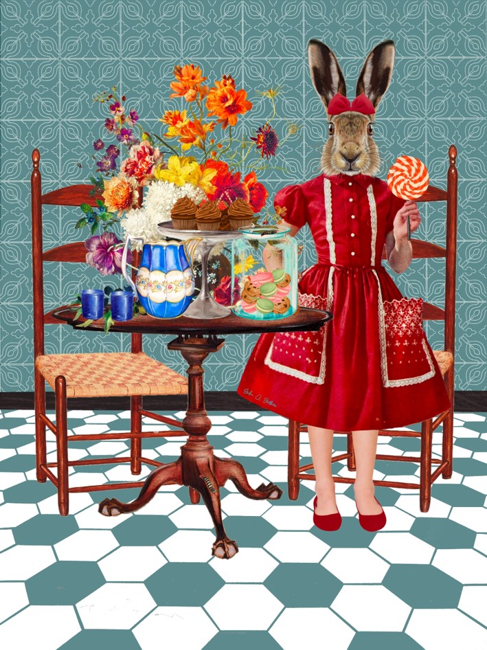 This whimsical image depicts a surreal and fantastical scene where a rabbit-headed girl stands in an elegantly decorated room, creating an intriguing blend of anthropomorphism and vintage charm. The girl, dressed in a red vintage-style dress with white accents and a bow, is positioned next to a table adorned with an array of colorful sweets and flowers. Her attire, reminiscent of mid-20th century fashion, adds a nostalgic touch to the image, evoking a sense of innocence and wonder.