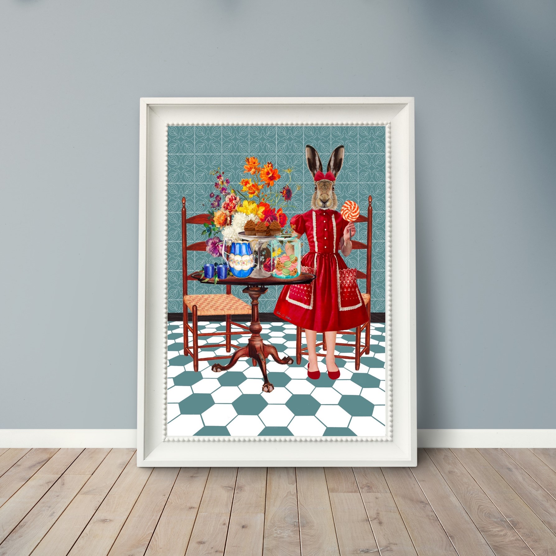 The background features a wallpaper with a subtle, elegant pattern that complements the vintage aesthetic. The hexagonal floor tiles, alternating in shades of white and teal, add a geometric contrast to the organic shapes of the flowers and sweets. This choice of flooring, along with the wallpaper, creates a harmonious balance between the different elements of the image.