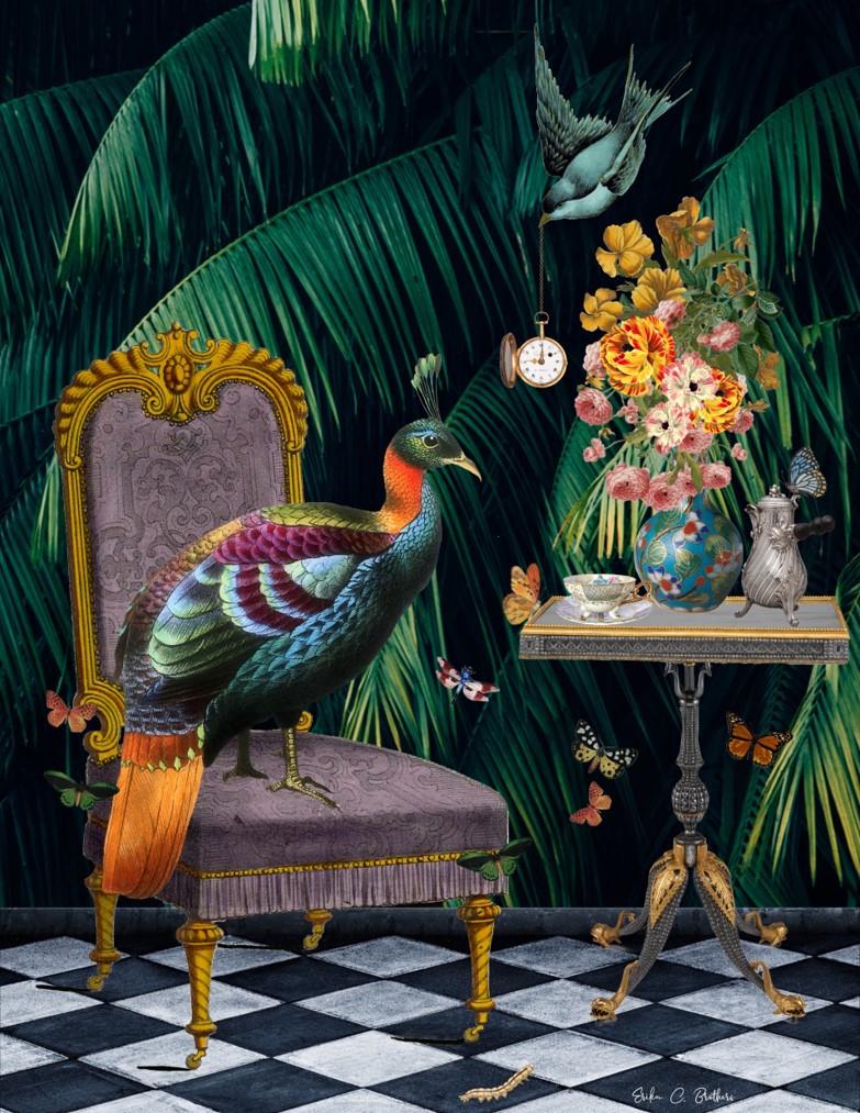 The image is an enchanting and surreal illustration that melds elements of nature, vintage decor, and whimsical fantasy into a cohesive and visually striking composition. The scene is set in an opulent interior, characterized by its rich details and vibrant colors, creating an atmosphere that is both regal and otherworldly.
