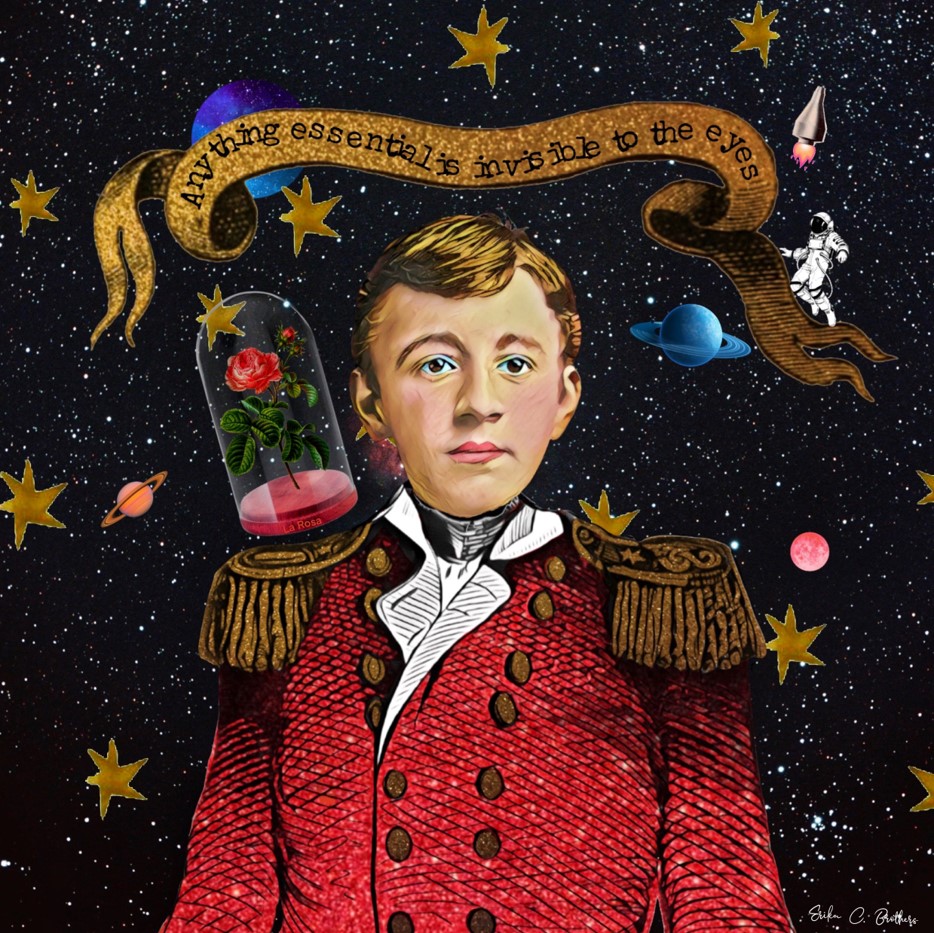 The meticulous attention to detail, from the textures of the boy’s uniform to the delicate petals of the rose and the shimmering stars, adds depth and realism to the fantastical scene. The combination of historical elements, literary references, and cosmic imagery creates a rich and layered visual narrative that pays homage to the beloved story of “The Little Prince” while also offering new interpretations and connections.