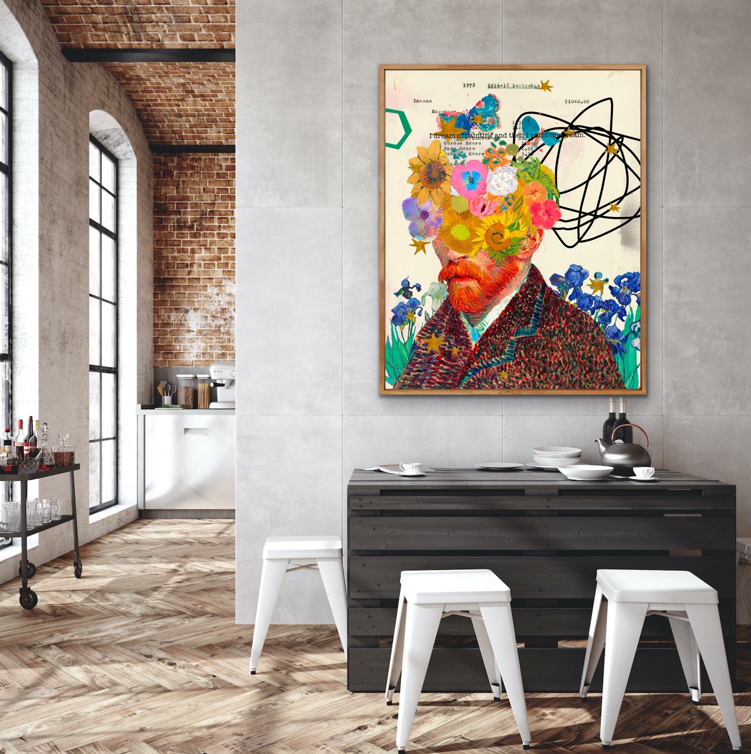 Replacing the figure’s head is an explosion of flowers and foliage in a riot of colors. Sunflowers, daisies, roses, and irises bloom profusely, their vivid yellows, pinks, purples, and blues creating a dynamic and energetic focal point. These flowers are rendered in a mix of realistic and stylized forms, contributing to the surreal nature of the image. The flowers symbolize creativity, growth, and the natural beauty that van Gogh often captured in his works.