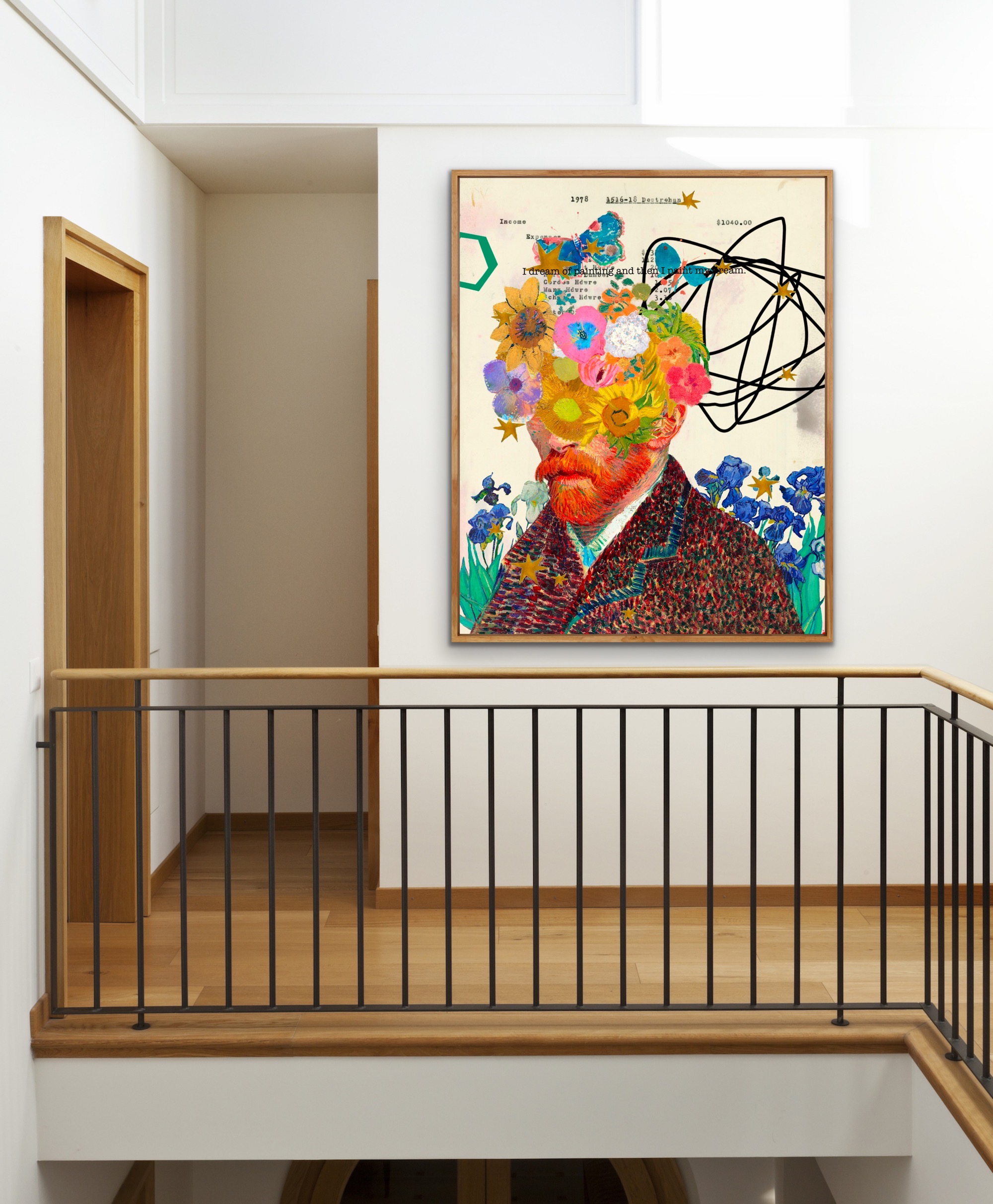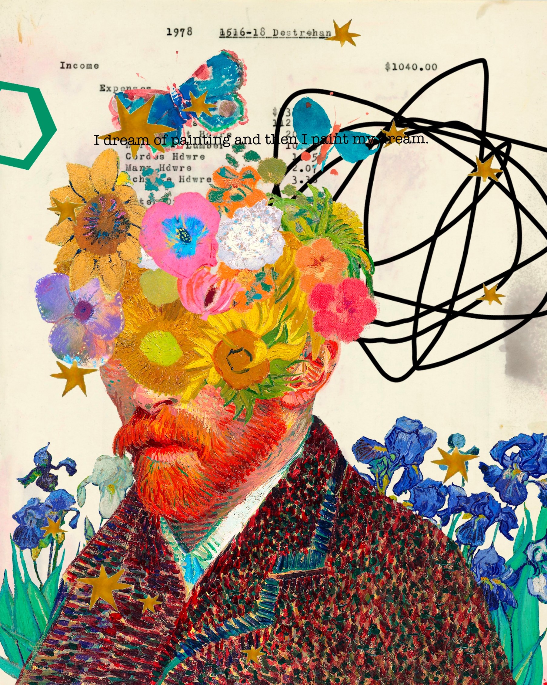The image evokes themes of creativity, inspiration, and the transformative power of art. The use of flowers and abstract elements to replace the figure’s head suggests the limitless potential of the creative mind and the ways in which artists draw from their dreams and surroundings. The inclusion of van Gogh’s quote reinforces the idea that art is a manifestation of the artist’s inner vision.