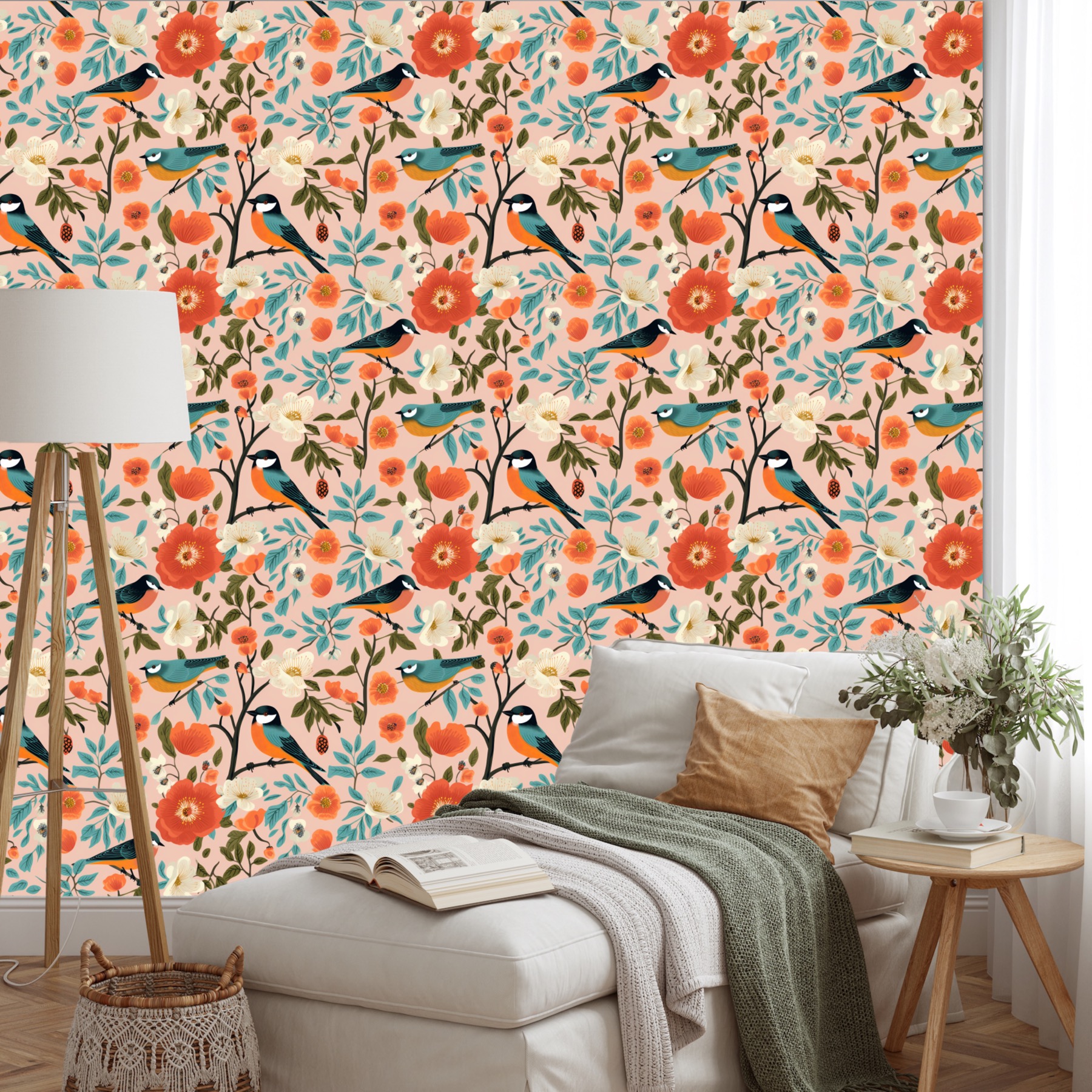 The background of the wallpaper is a delicate peachy-pink tone, which serves as a gentle and inviting canvas for the vibrant colors and intricate details of the birds and flowers. This soft background color enhances the overall warmth of the design while allowing the various elements to stand out without overwhelming the senses. The pastel hue gives the wallpaper a light, airy feel, making it suitable for spaces where a calm and serene ambiance is desired.
