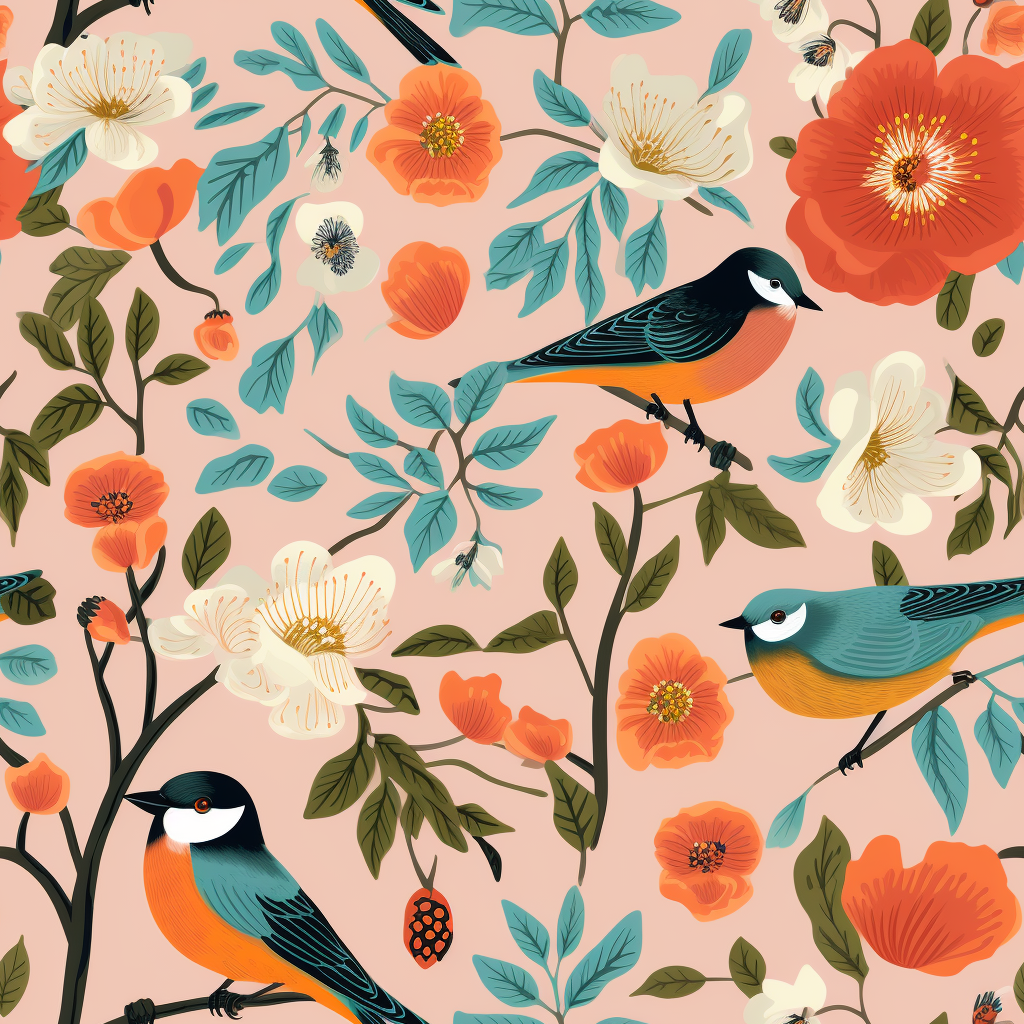 The birds in the design are another key feature, adding a lively and whimsical element to the pattern. The birds are depicted in a stylized manner, with smooth lines and bold colors that make them stand out against the floral backdrop. The primary colors of the birds include rich oranges, blues, and blacks, which complement the floral tones while adding a touch of contrast and interest. These birds are carefully positioned throughout the design, perched on branches or nestled among the flowers, creating a sense of harmony and interaction between the different elements.