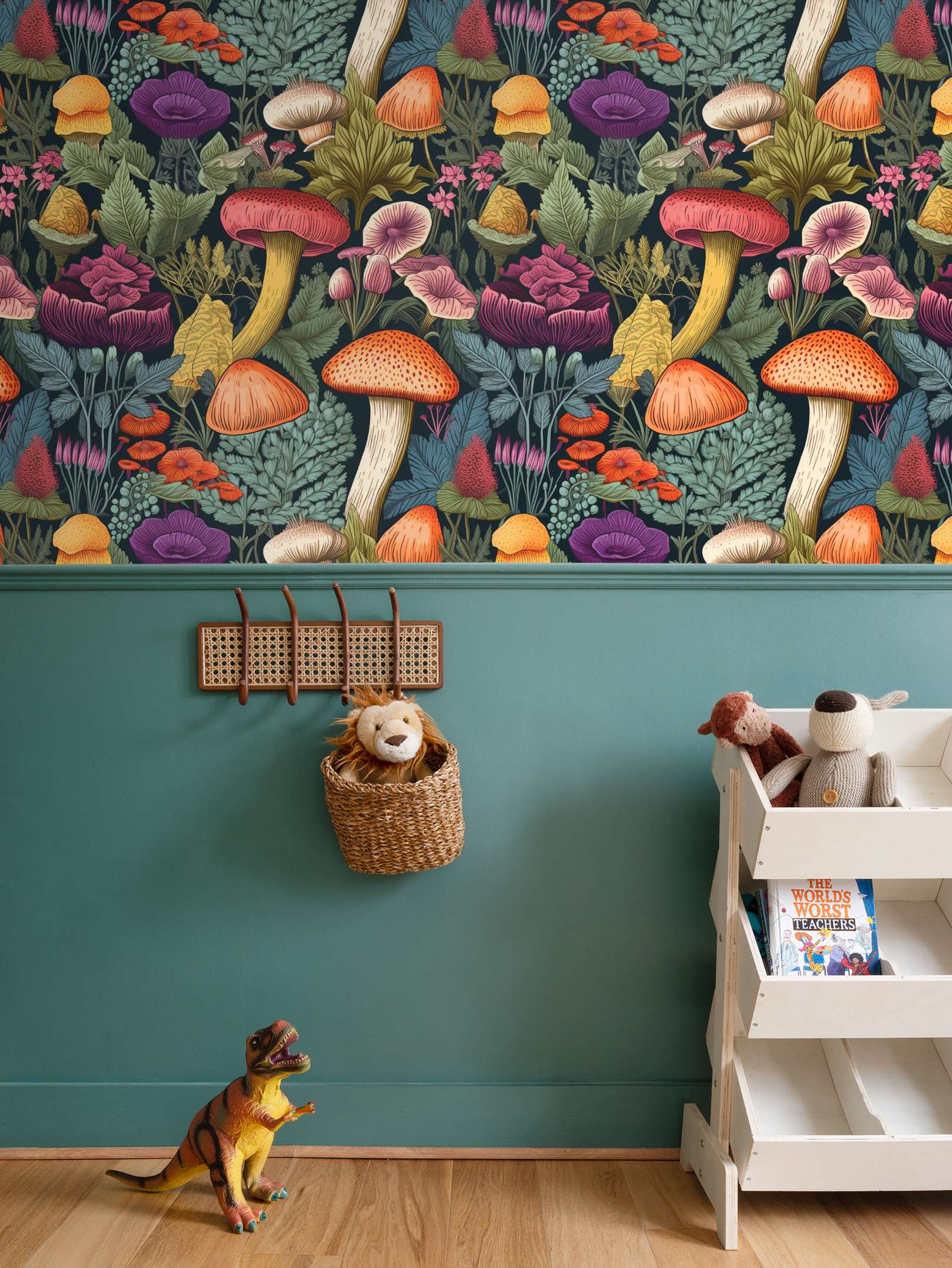 The wallpaper design you’ve provided is a captivating and intricate depiction of a lush, botanical scene filled with an array of mushrooms, plants, and flowers. The composition is rich with detail, showcasing a variety of natural elements that evoke the mysterious and enchanting atmosphere of a forest or woodland. The design is characterized by its dense arrangement of flora and fungi, set against a dark background that enhances the vivid colors and intricate details of each element.